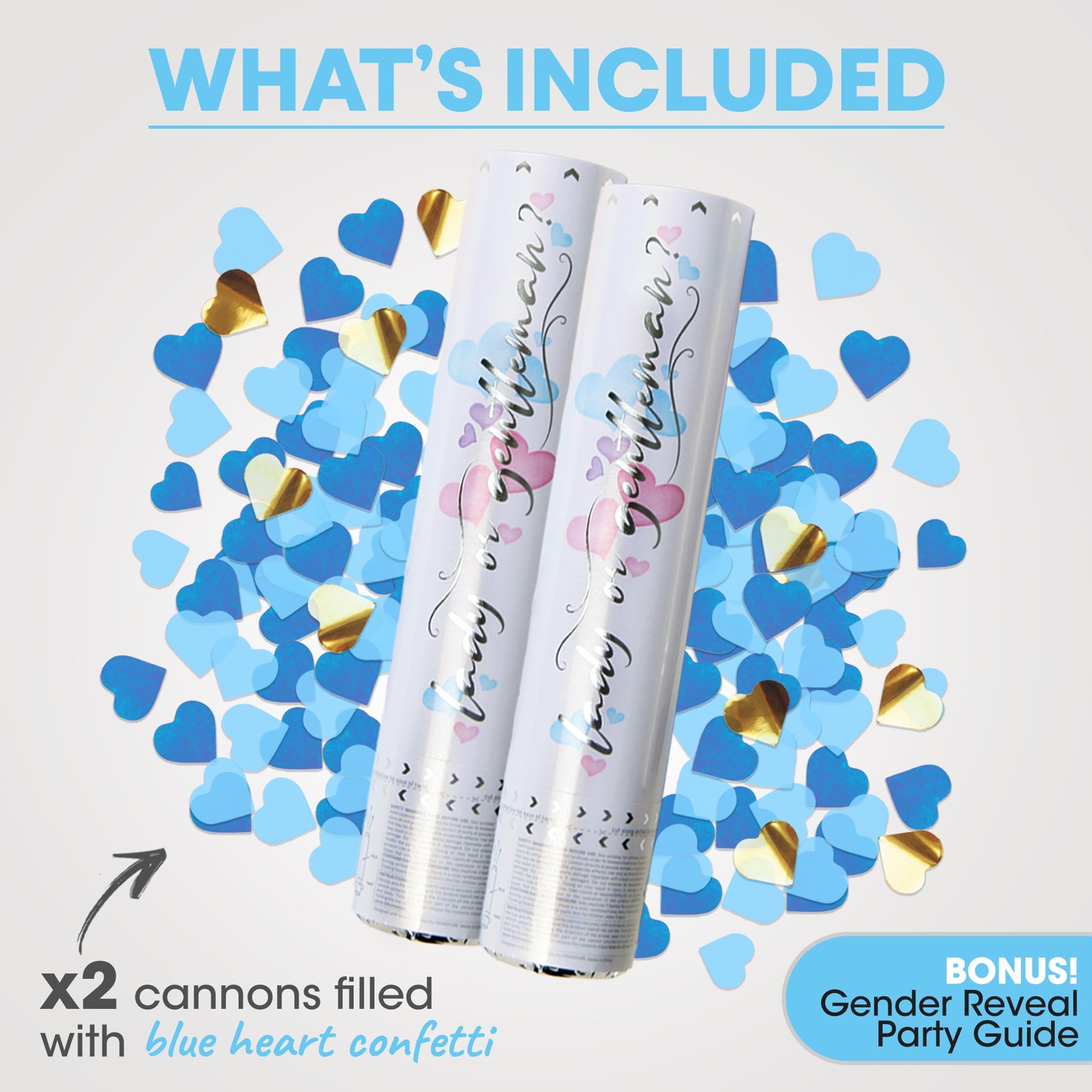 - Premium Cannon Kit - Our baby gender reveal cannon kit comes in blue with neutral and discreet packaging that doesn’t give away the gender. The blue gender reveal cannon confetti contains heart-shaped confetti to make your announcement picture perfect.