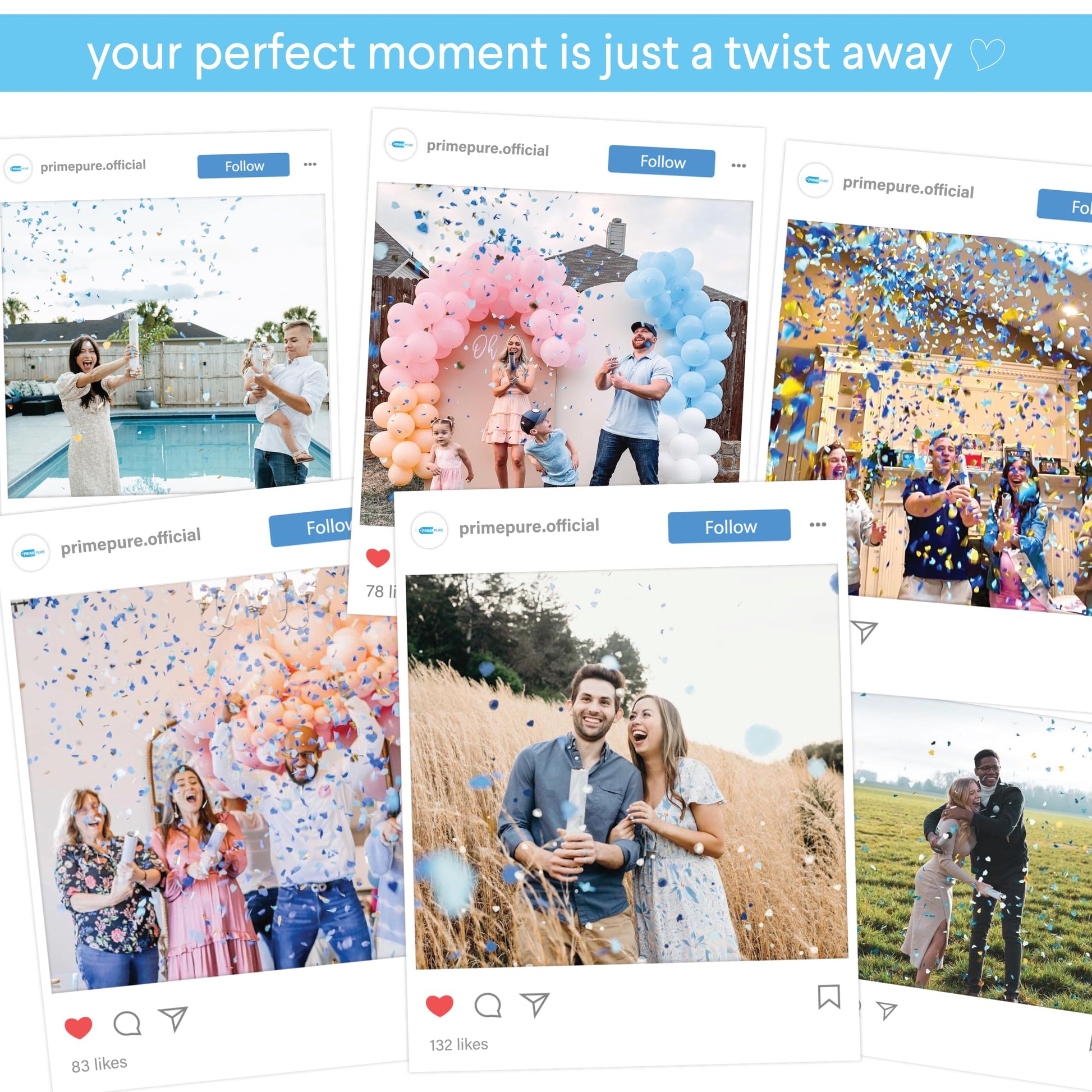 - Safe and Easy To Use - Our heart-shaped confetti cannon gender reveal blue work by simply twisting the bottom to release the contents. The blue confetti gender reveal cannons are safe for both indoor and outdoor gender reveal setups.