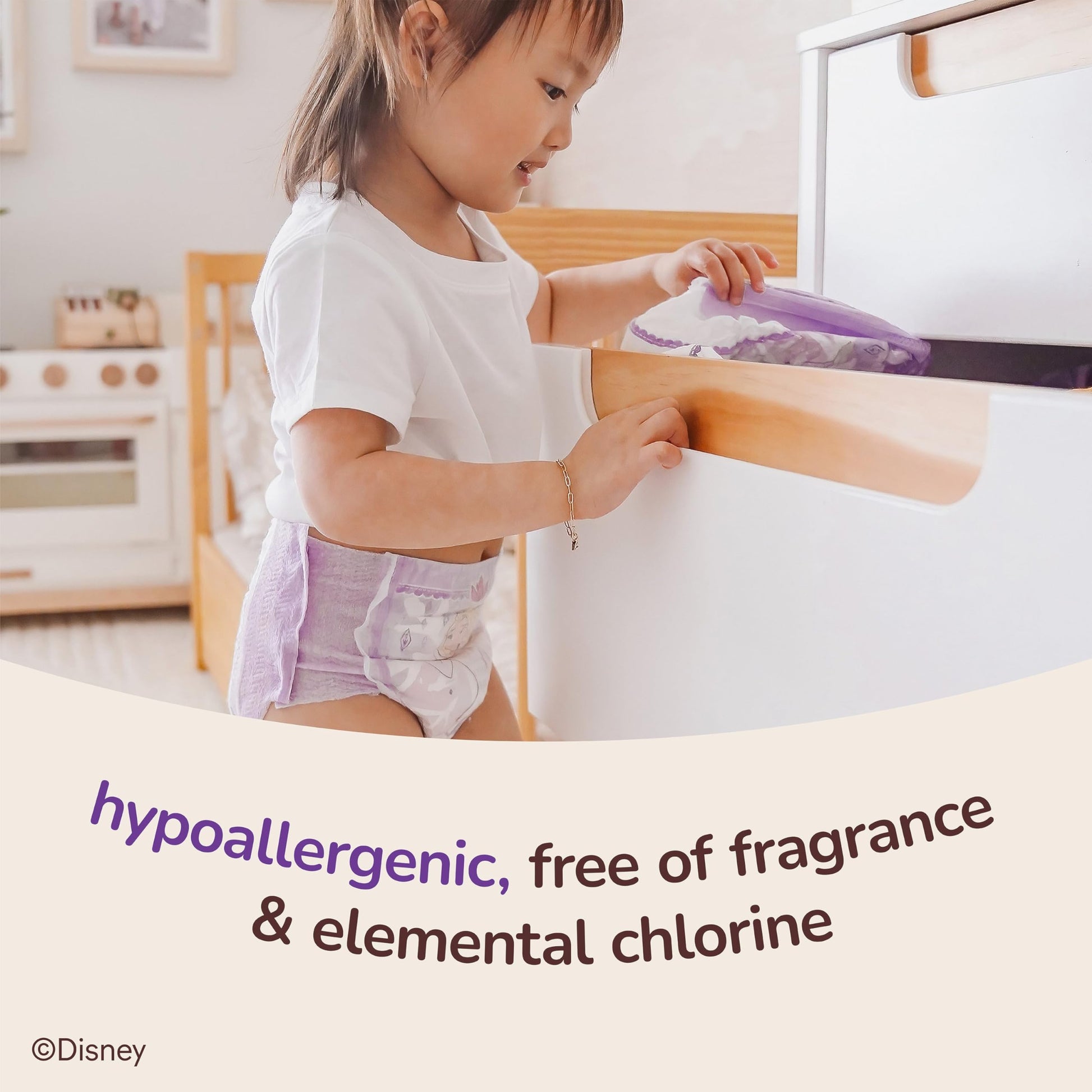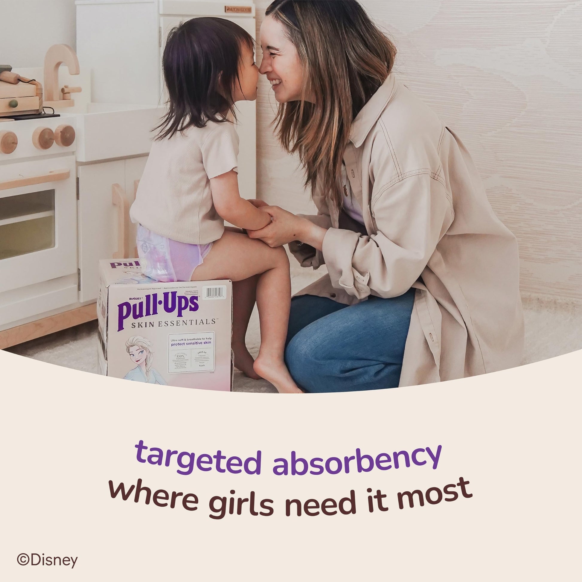 Put your child’s skin health first during the potty training process with Pull-Ups Skin Essentials Training Pants for Girls. Each training underwear is designed with ultra soft and breathable materials that help to keep your child comfortable and help protect their sensitive skin. Up to 100% leak free, Pull-Ups Skin Essentials Potty Training Pants feature a targeted absorbency zone to protect girls where they need it most and help maintain comfortable and healthy skin. Dermatologist-approved Pull-Ups Skin Essentials toddler training pants for girls are hypoallergenic, free of fragrance, elemental chlorine, parabens, phthalates, natural rubber latex and lotions. For little ones who are on-the go, these training pants feature soft, refastenable sides that allow for easy changing. Our girls training pant feature designs from Disney’s Frozen with snowflake graphics that fade when wet to help motivate your child to stay dry. Pull Ups Skin Essentials training pants and Huggies Skin Essentials diapers and wipes give you everything you want for your child’s skin and nothing you don’t. They’re dermatologist-approved and designed to help keep skin clean and healthy from baby to Big Kid. When your child is ready to begin her potty-training journey, the Pull-Ups brand can help. Visit the Pull-Ups website for potty-training tips and resources. Pull-Ups Girls' Training Underwear are available in sizes 2T-3T (16-34 lbs), 3T-4T (32-40 lbs), 4T-5T (38-50 lbs) and 5T-6T (50+ lbs).