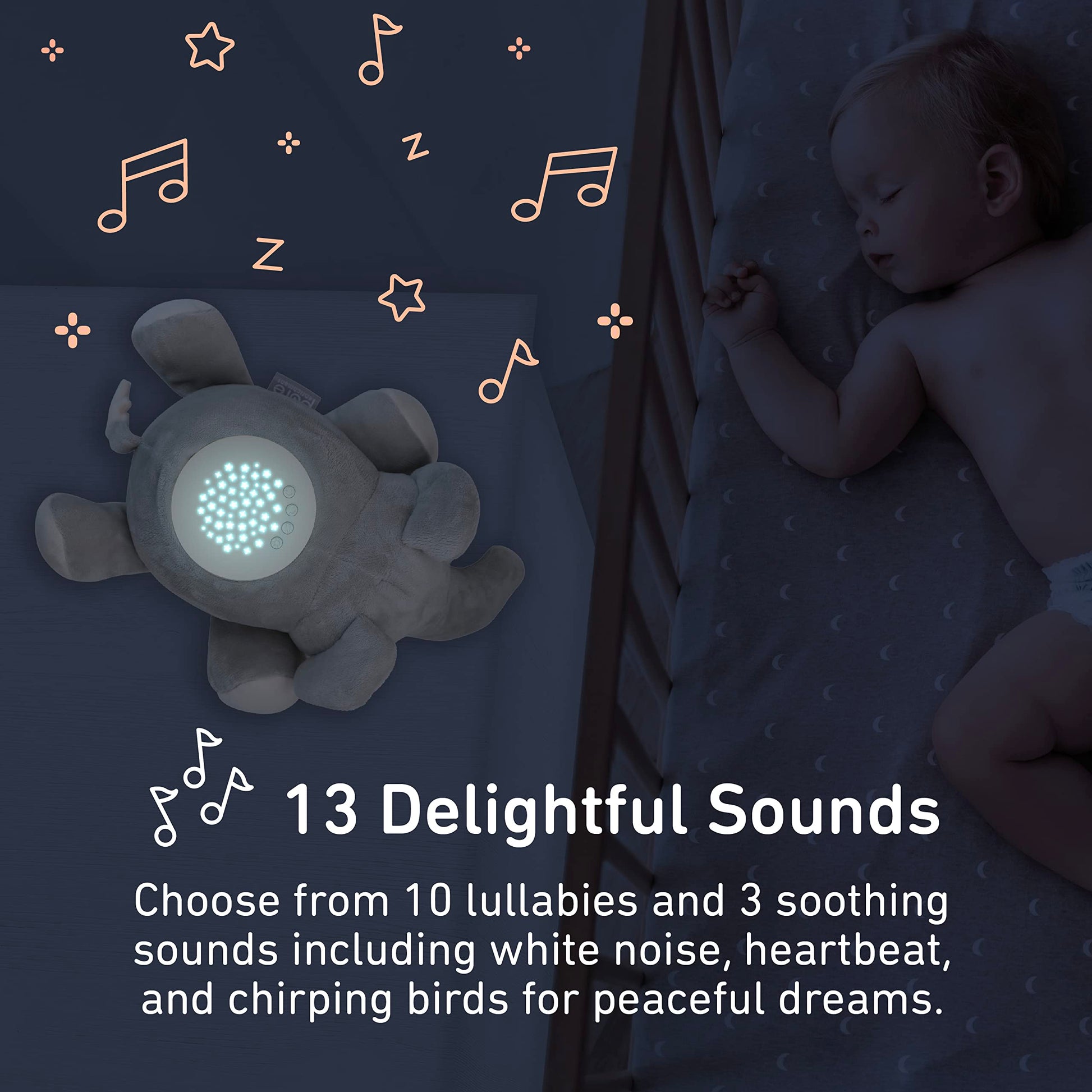 - Peaceful Sleep Training for Baby: Help your little one fall asleep faster by snuggling up to this adorable animal plush soother programmed with 10 lullabies and 3 soothing sounds including white noise, heartbeat, and chirping birds - simply adjust sound for your baby’s comfort with 5 volume settings