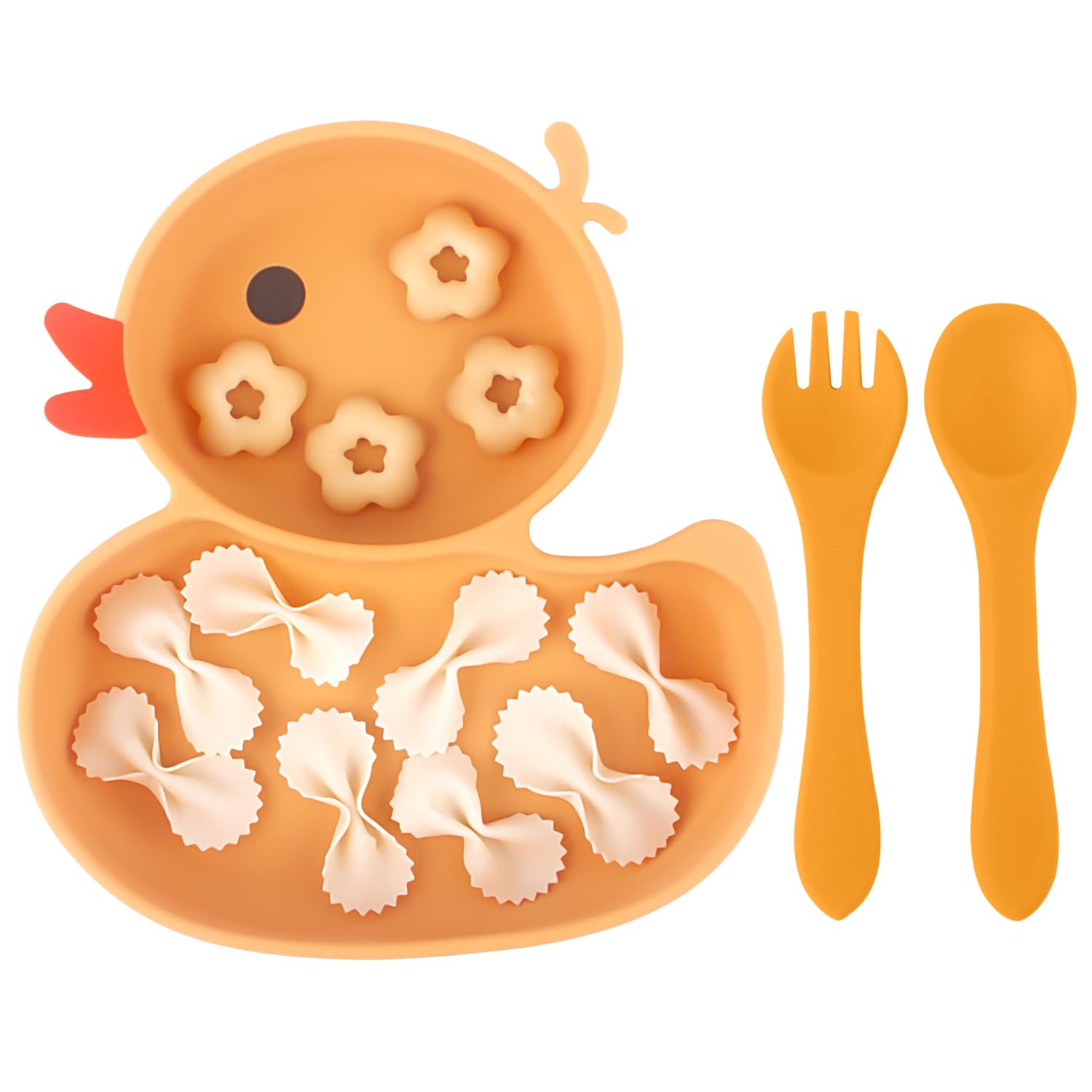 Qshare Powerful Suction Plates for Baby and Toddler,Baby Divided Plate,Thanksgiving Plates with Fork and Spoon,Duck Baby Plate Non-Slip,BPA Free,Microwave & Dishwasher Safe (Orange)