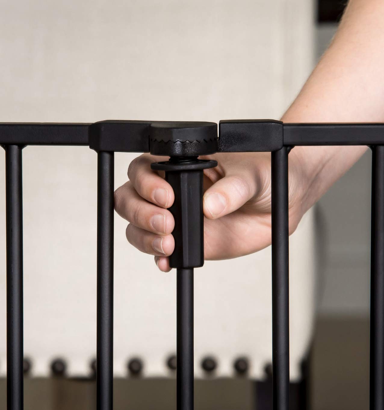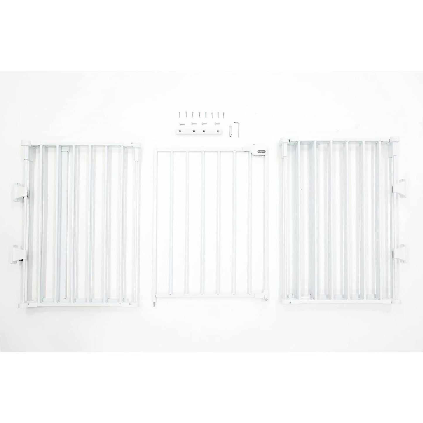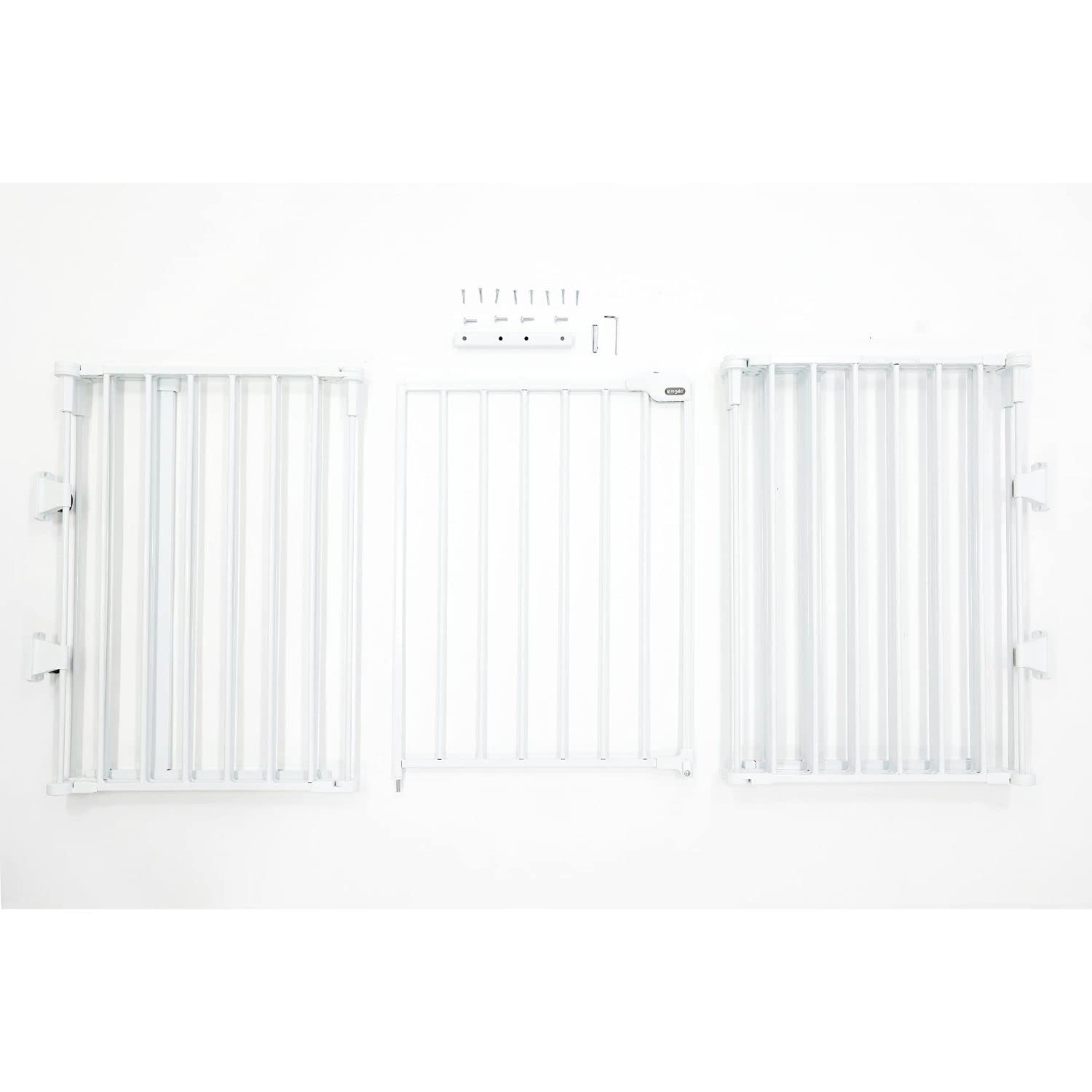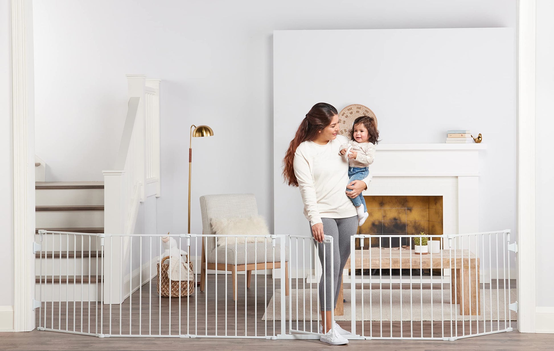 Once your little one starts walking, child proofing your home is a must. Providing a versatile way to keep your child safe, the Regalo Super Wide Baby Gate and Play Yard offers numerous convenient configurations for around the house. This play yard and safety gate features durable all-steel components and a hardware-mount system ideal for large, angled or uneven openings. The super wide gate can be expanded to fit openings up to 192” and comes with eight, 24” panels. The panels connect to hinged posts that offer an amazing variety of shaping possibilities. Easily mounting to the wall, the convenient gate features a walk-through door designed with a double lock lever handle allowing adults to easily pass through. It is ideal as a play yard, fireplace barrier, at the landing of stairs, or a super gate for very wide openings.