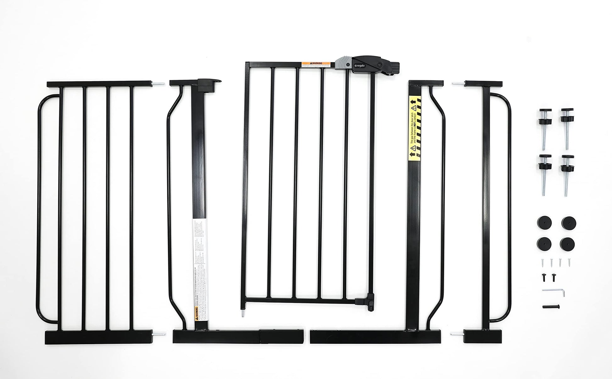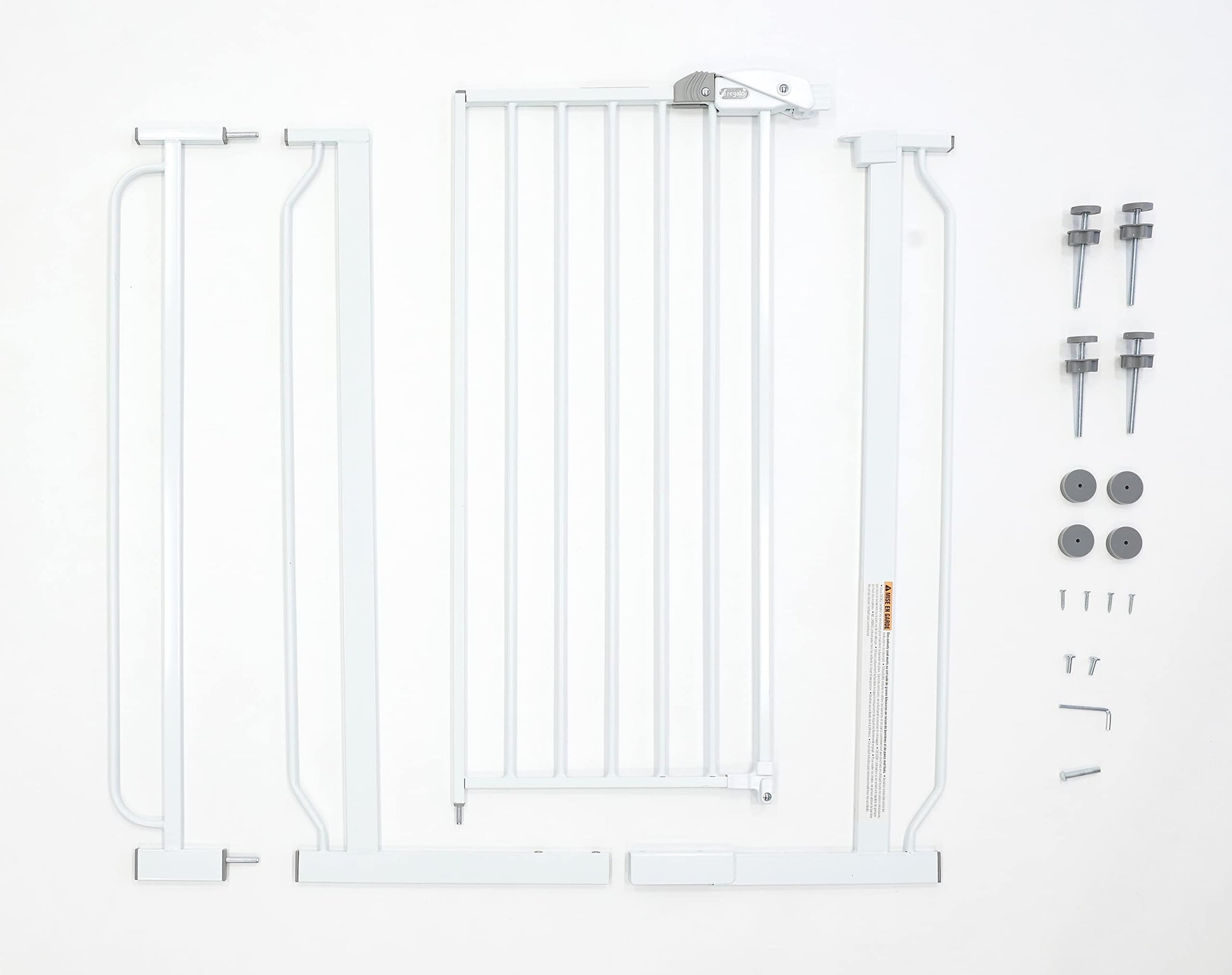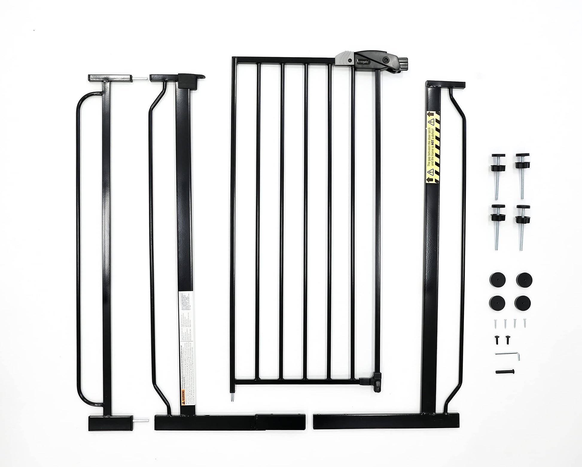 Your baby has started to walk, it’s time to child proof your house. The Easy Step gate hits all the criteria with an all-steel construction, installs quickly by either pressure mount or wall mount and is adjustable to accommodate door openings between 29-34 inches or 35-38.5 inches wide. Space between the bars are 2.5 inches. The gate door is 16 inches wide. Please Read The gate will appear bent before installation There will be a gap at the handle before installation Both of these concerns will be eliminated once the gate is properly installed in your doorway Please measure your opening prior to purchase to ensure proper fit Gate frame design to be assembled at all times Regalo Easy Step Baby Gate Features Fits openings between 29-34 and 35-38.5 inches wide and stands 30 inches tall. Easy to use lever handle features a one-touch release safety lock. Convenient walk through design Easy pressure mount set up Made for children 6-24 months. Can be used for medium to large dogs What’s included in the Box One Regalo Easy Step Baby Gate Instruction Manual One 6-inch extension kit. Four pressure mounted spindle rods. Four wall cups with screws.