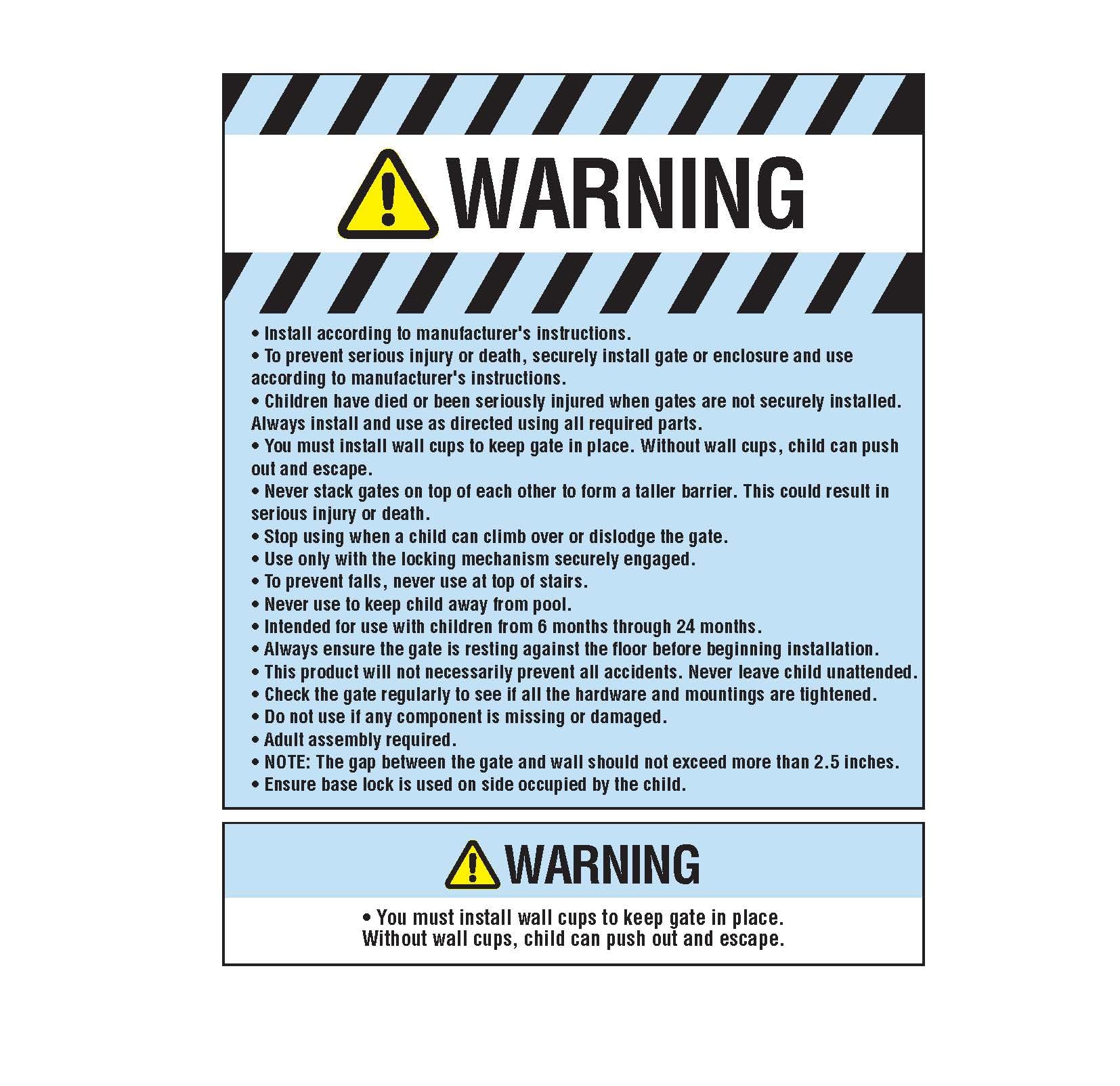- SET UP: Install according to manufacturer’s instructions. You must use wall cups to keep gate in place. To prevent falls, never use at top of stairs.