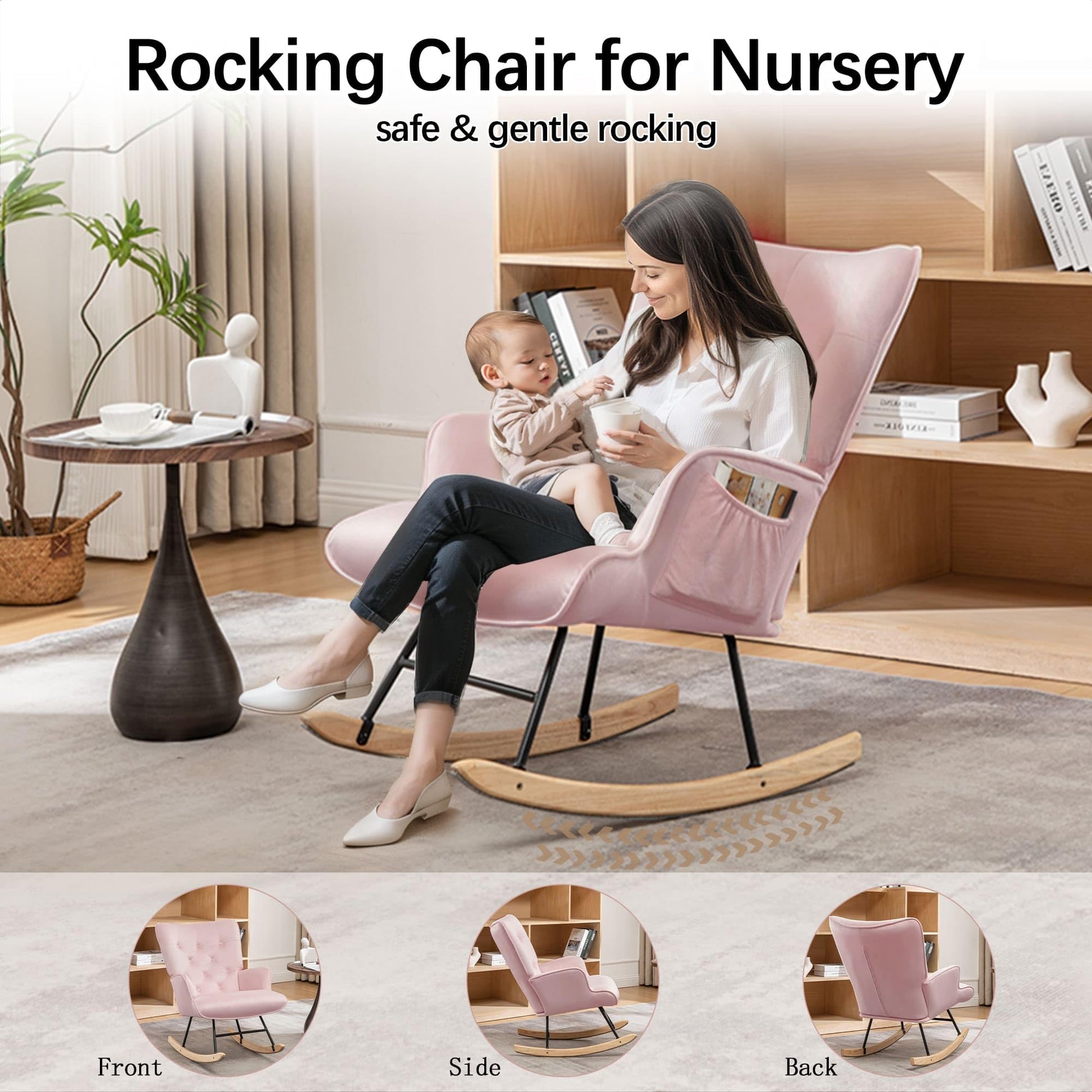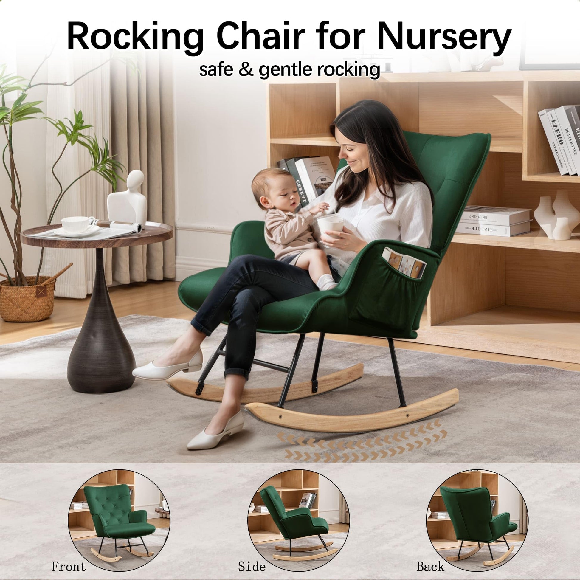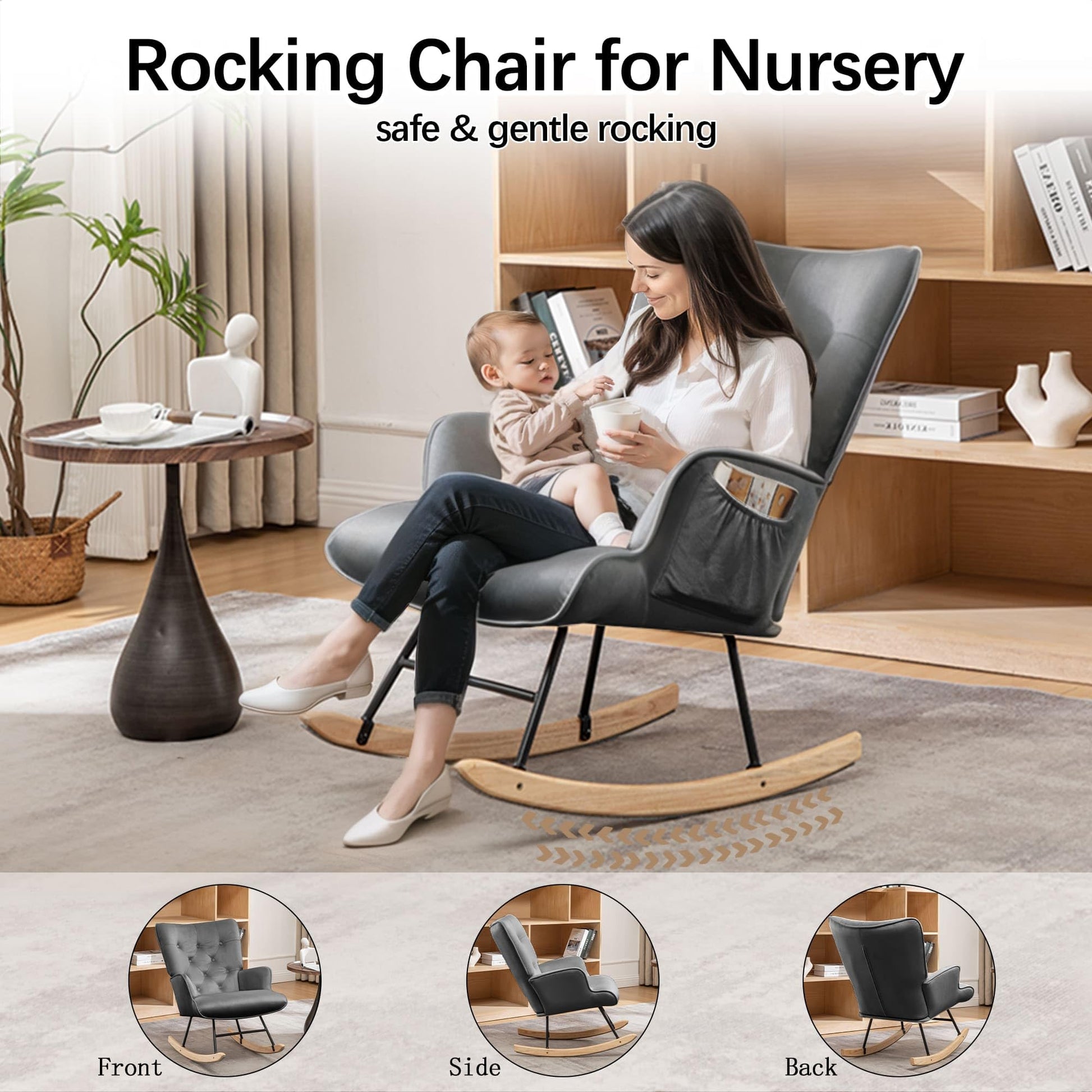 - 【Rocking Chair Full of Thoughtful Details】: Designed to sooth both you and your baby, the gentle rocking rhythm of this nursery chair provides a calming, relaxing experience, perfect for soothing babies to sleep faster. For added convenience, easy-access side pockets allow you to store books or baby essentials. In addition to this, the solid wood legs come with protective pads so you can move them anywhere in your home to protect your floors from scratches.