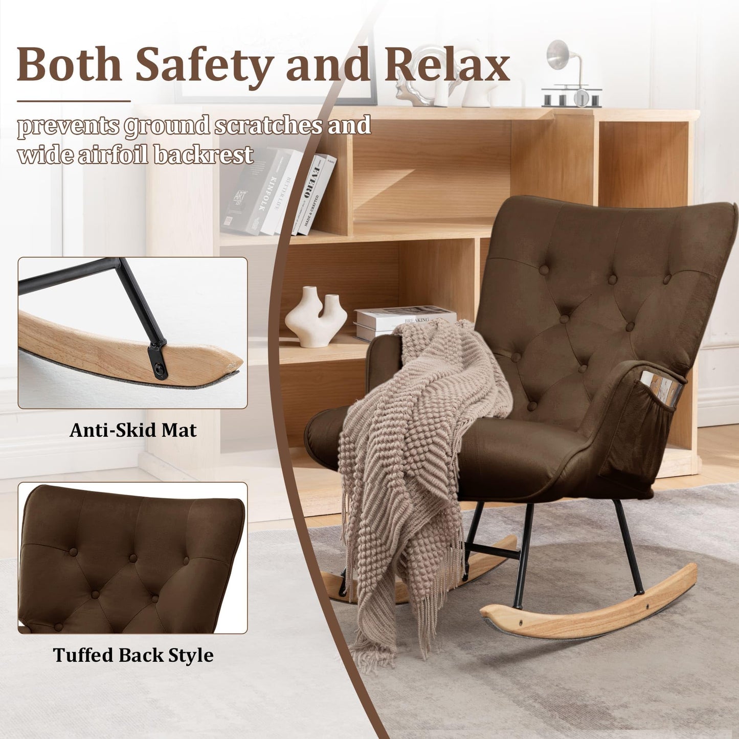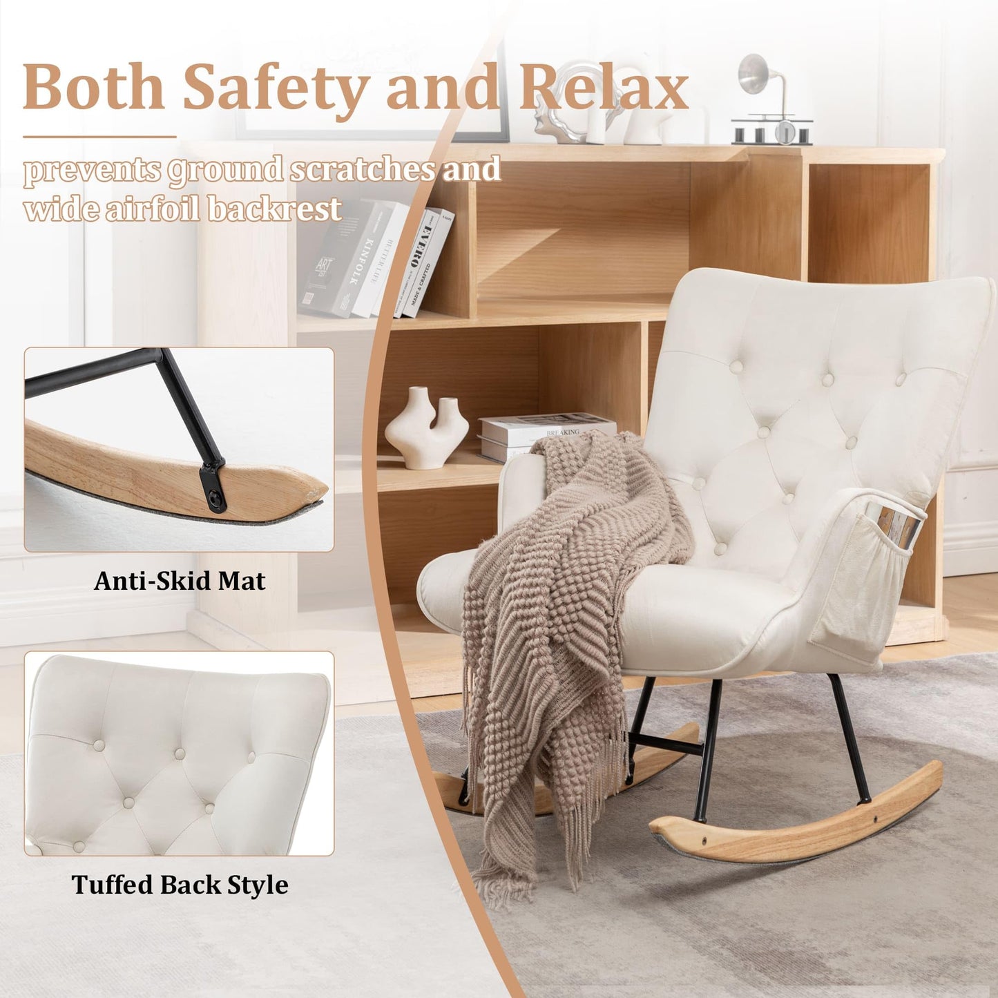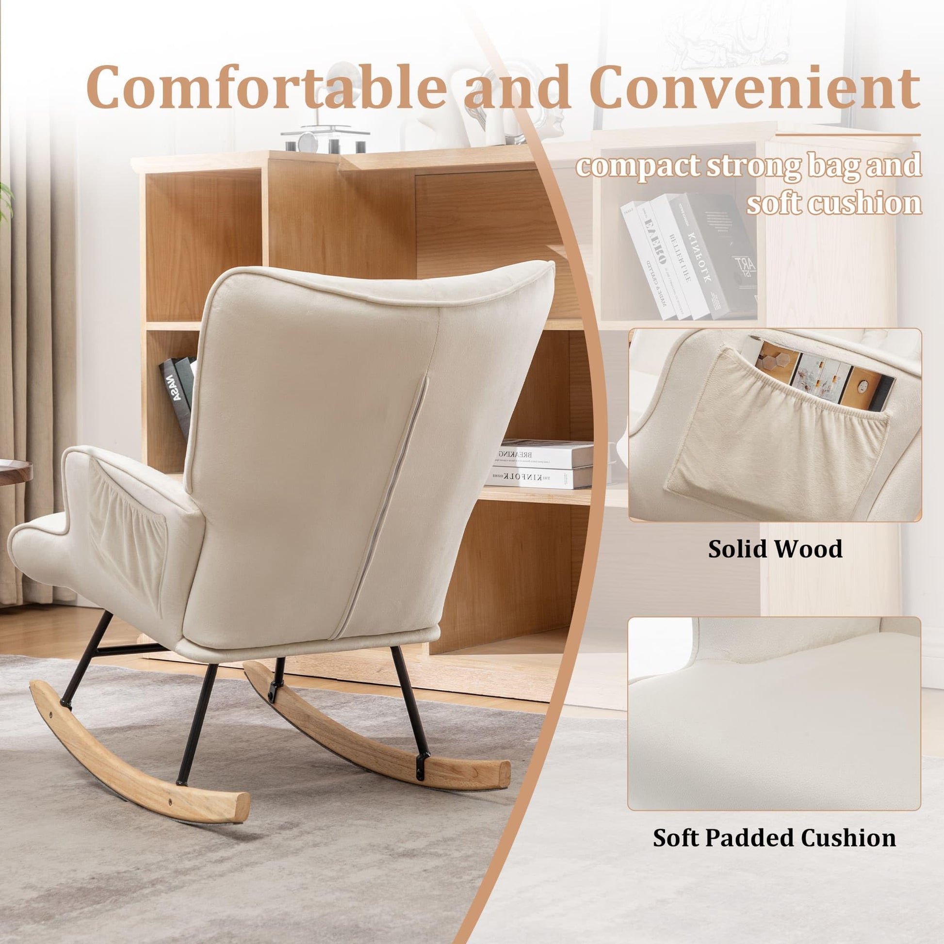 Rocking Chair for Nursery, Comfy Velvet Fabric Glider Rocker, Reading Chair with Support Seating and Side Pockets, Rocking Recliner Chair for Living Room, Bedroom, Balcony, Creamy Beige