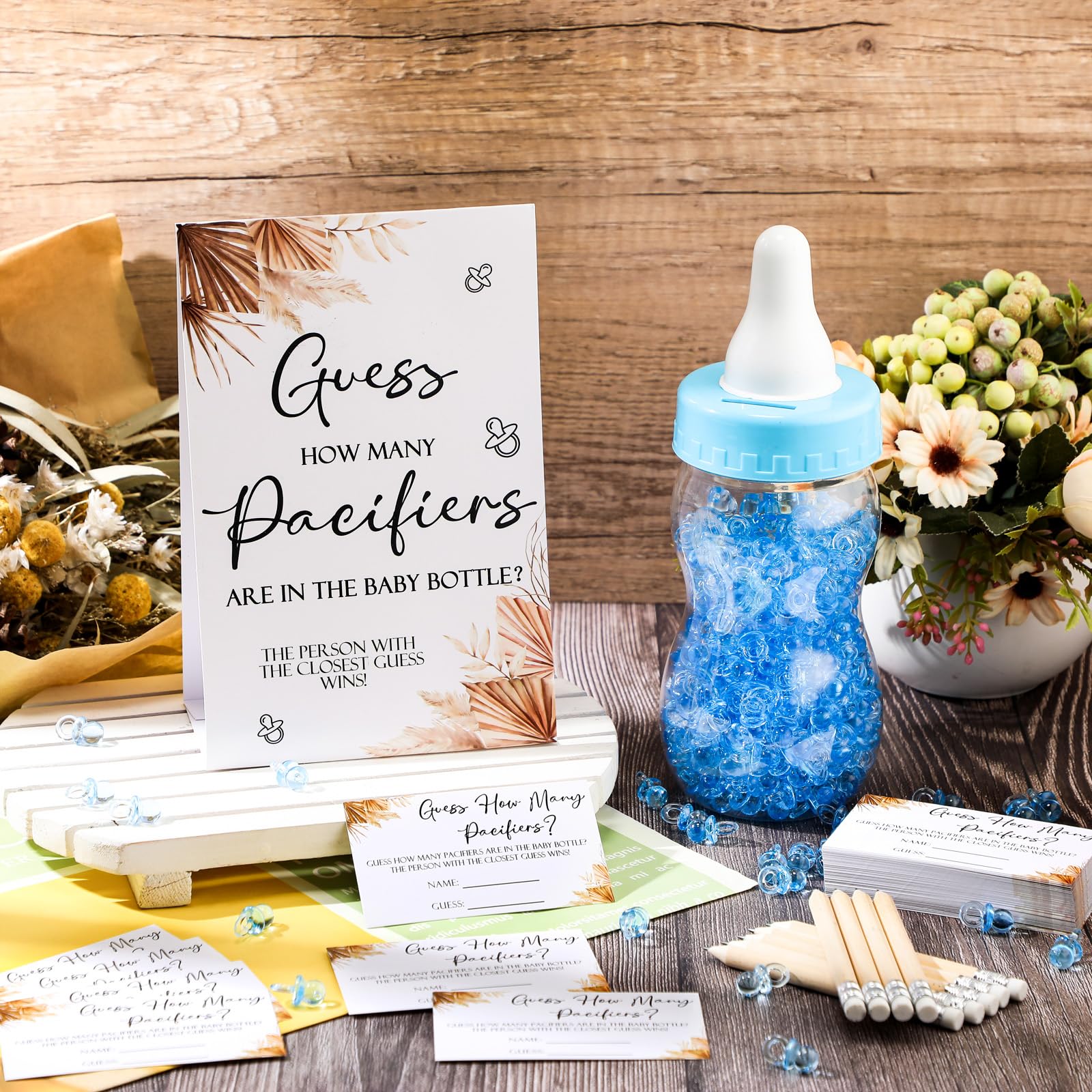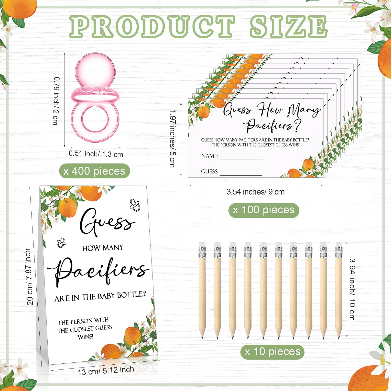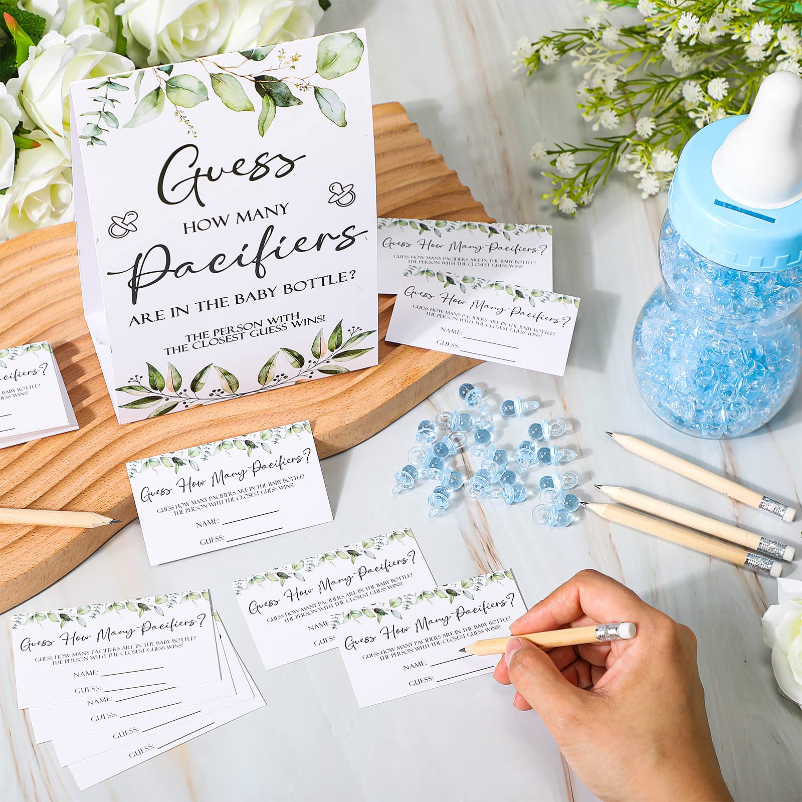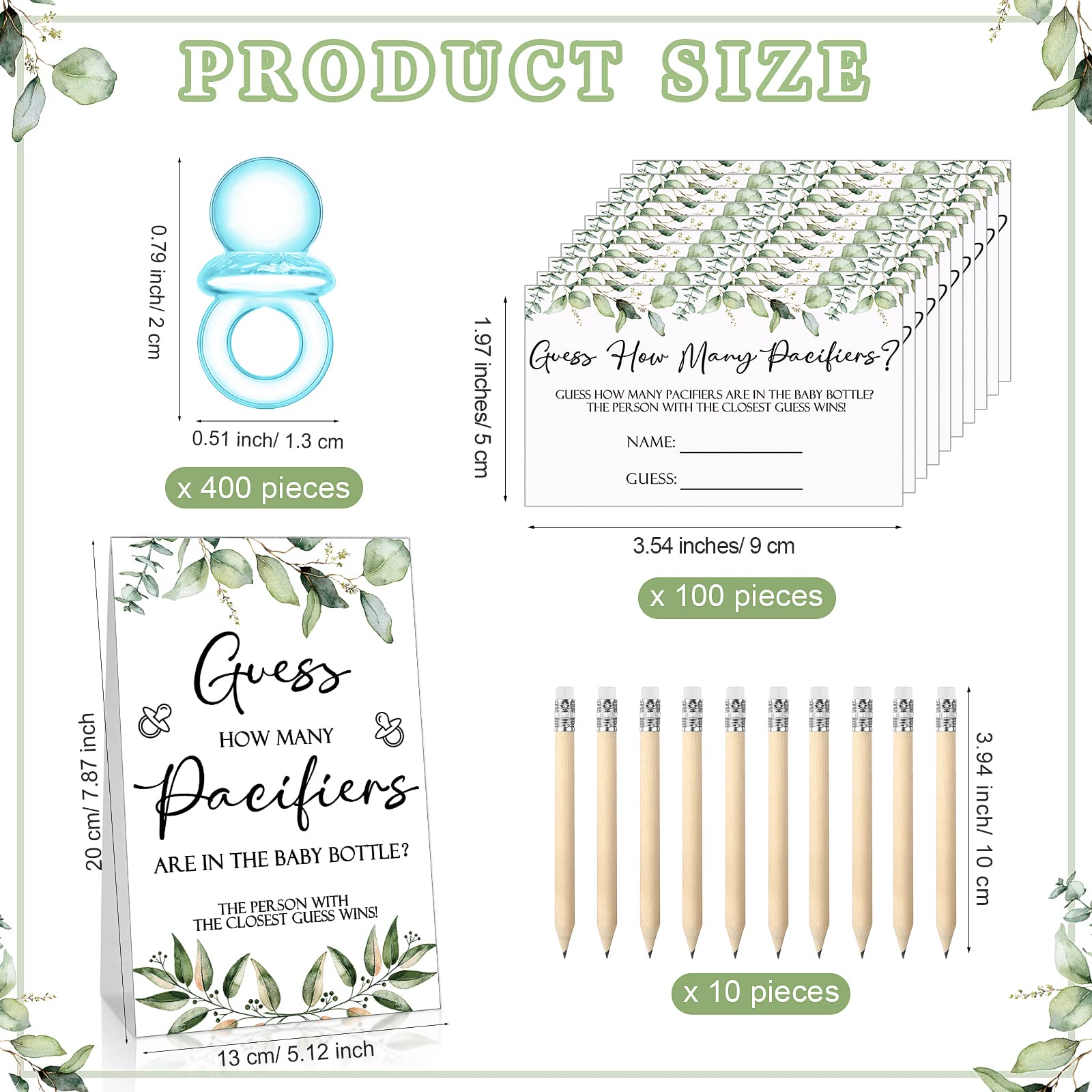 - Greenery Cards Set: you will get 1 piece of Guess How Many Pacifiers game sign, 100 pieces of small cards, 10 piece of HB pencils, 1 piece of milk bottle in 750 ml, and 400 pieces of mini baby pacifiers, which can meet your various demands and bring you a nice playing experience, also ideal for sharing with others