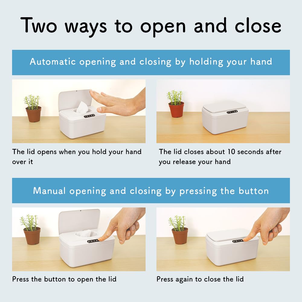 - [Automatic opening and closing without touching] This wet tissue case automatically opens the lid by simply placing your hand over it. The lid closes automatically about 10 seconds after opening, so you don't have to worry about forgetting to close it or the sheets drying out. Even if your hands are dirty, you can take out the sheets without touching the lid, so it is hygienic to use.