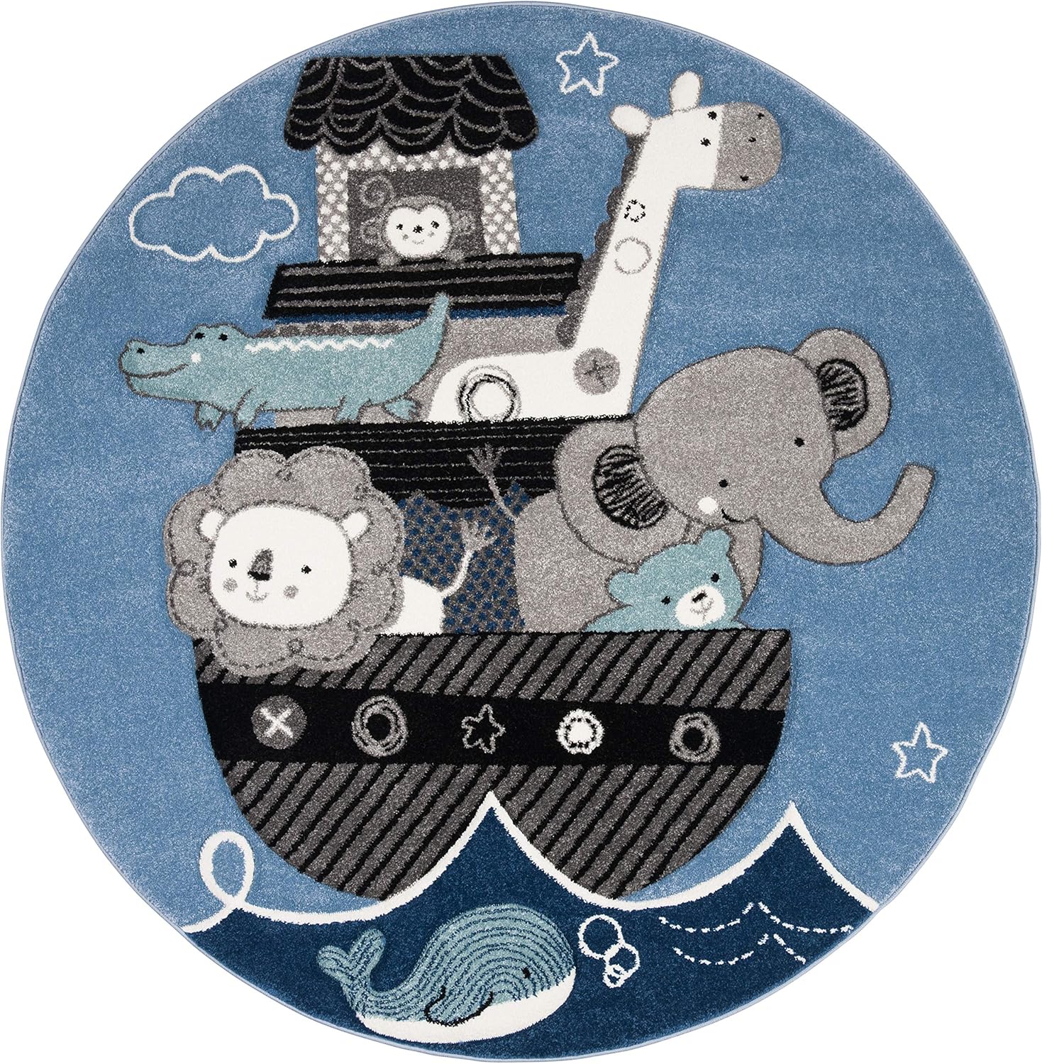 SAFAVIEH Carousel Kids Collection Area Rug - 5'3" Round, Blue & Grey, Animal Design, Non-Shedding & Easy Care, Ideal for High Traffic Areas for Boys & Girls in Playroom, Nursery, Bedroom (CRK121B)