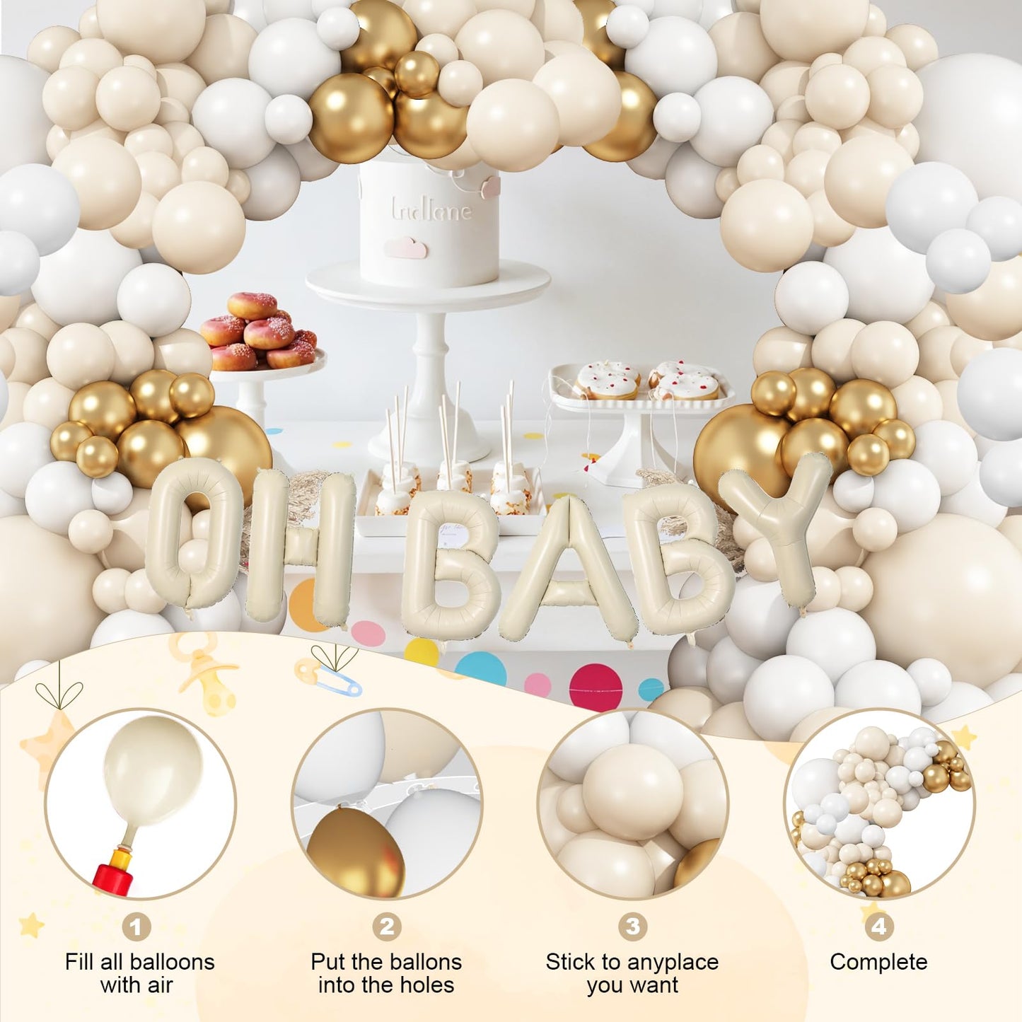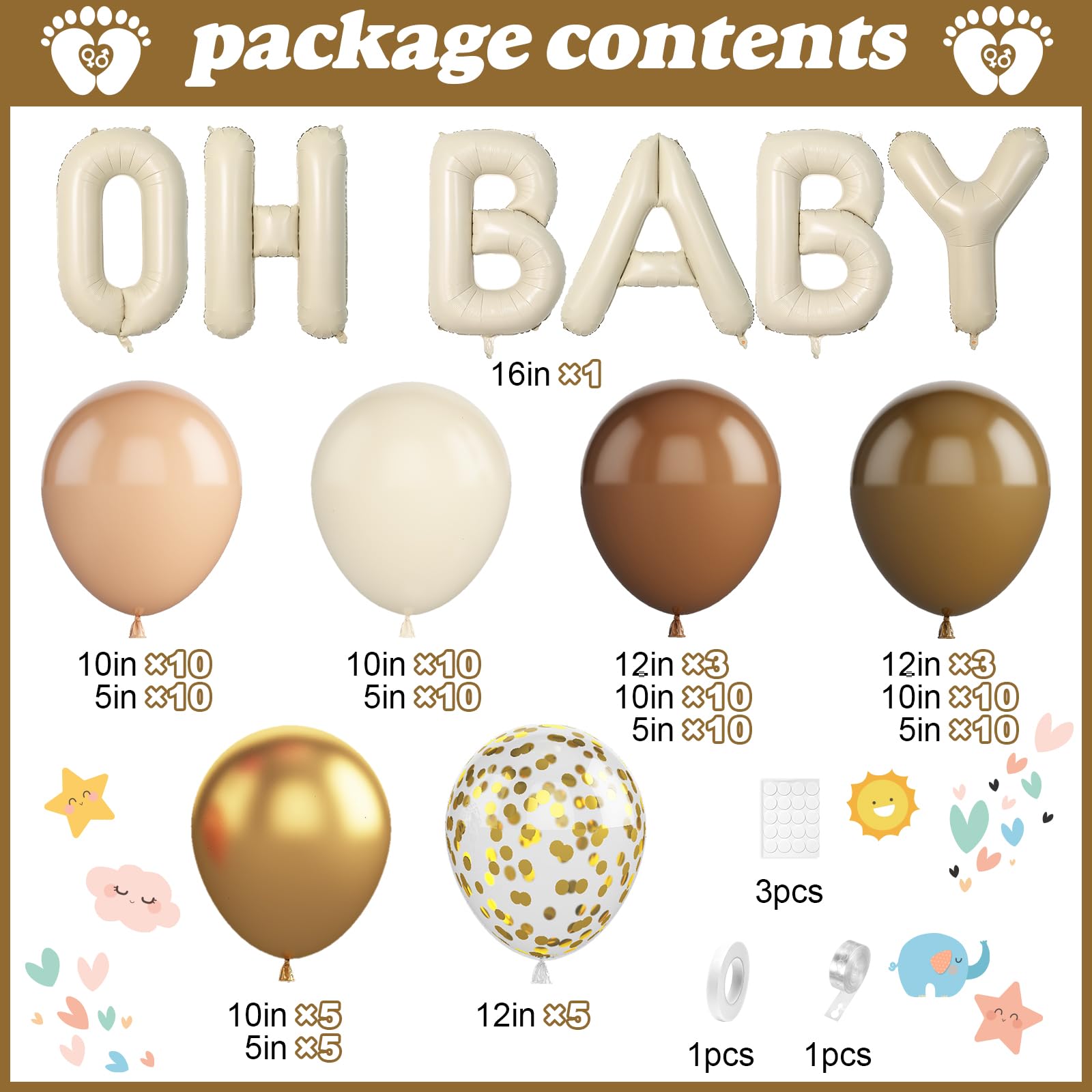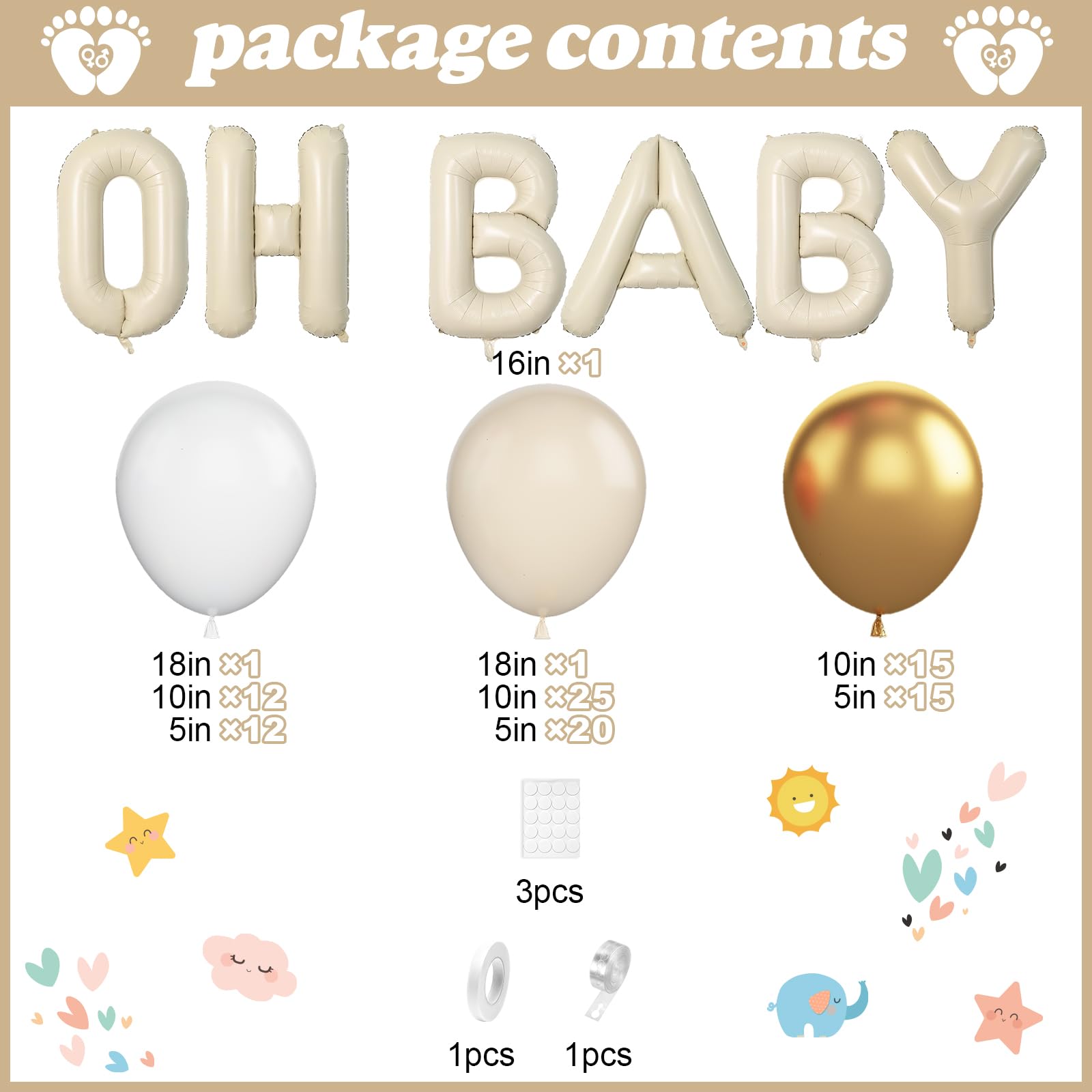 - Package Included: 46pcs sage green balloons balloons(5+10+18"),21pcs white balloons(5+10+18"),20pcs sand white balloons(10+18"),10pcs metallic gold balloons(5+10"),1pcs 16 Inch gold OH BABY balloon banner,glue points,balloon strip tape,ribbon.