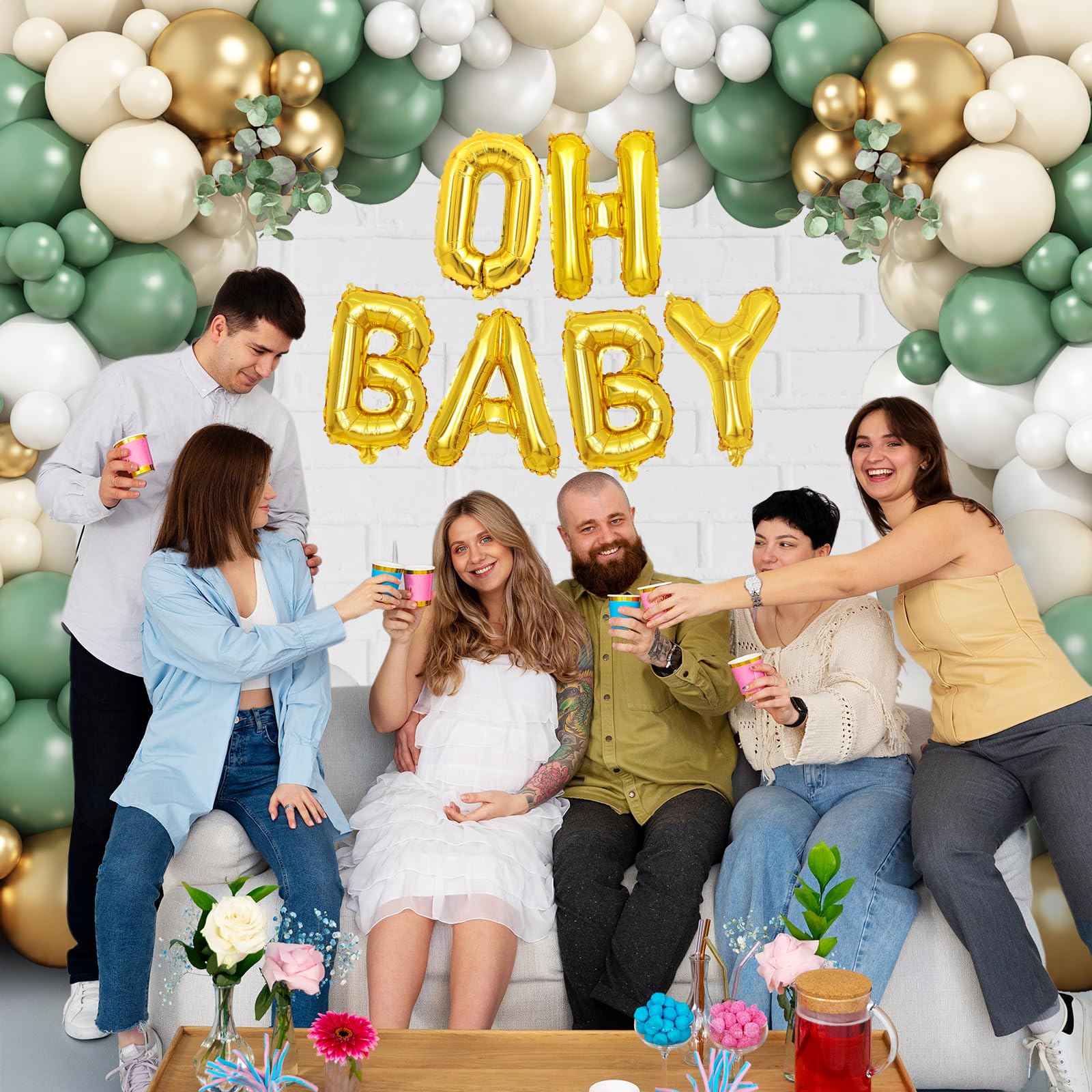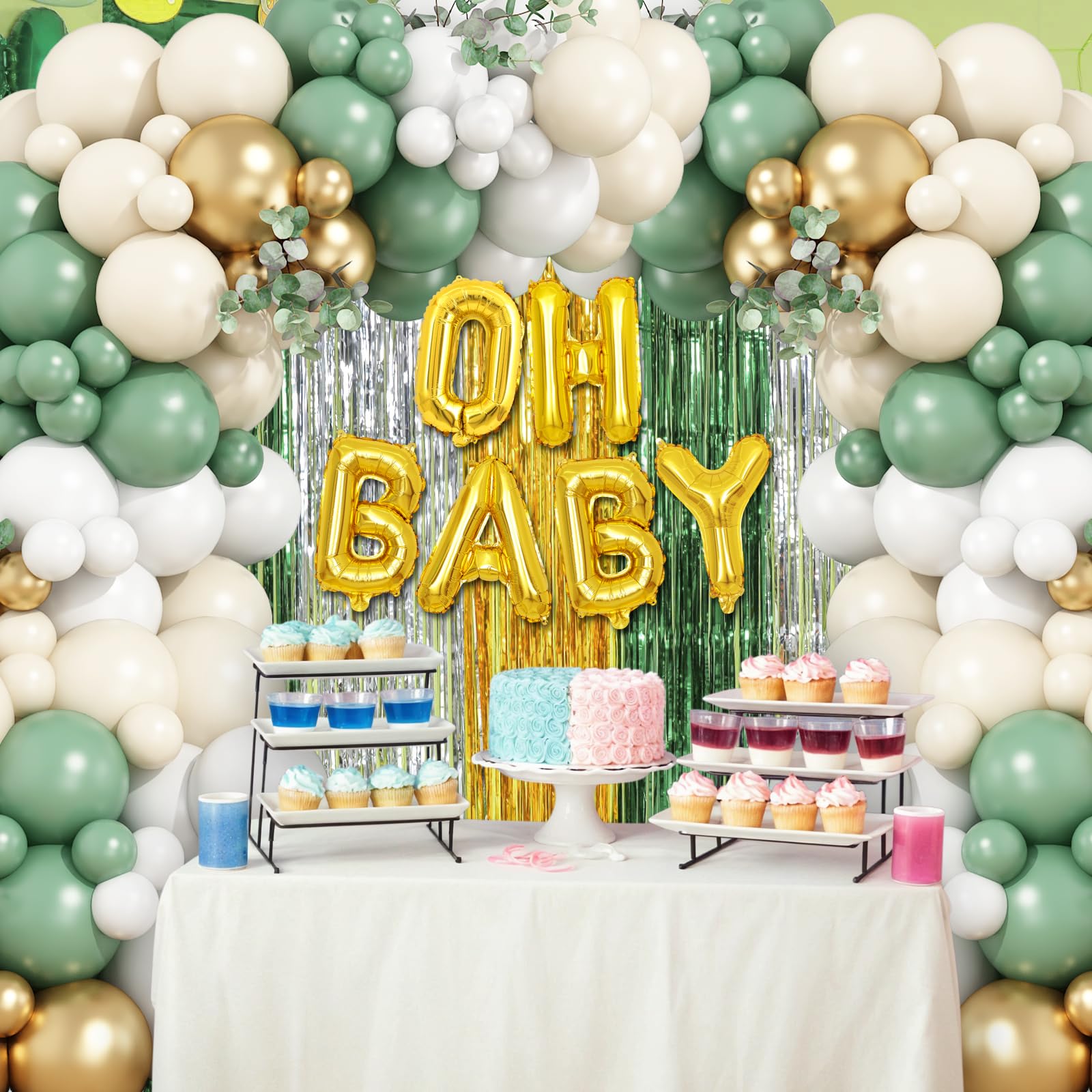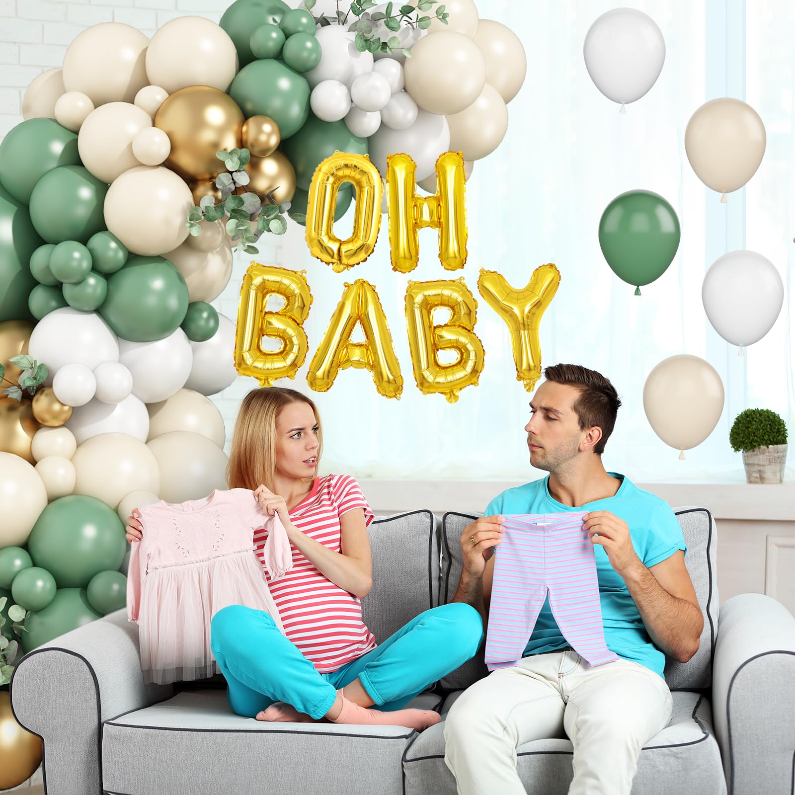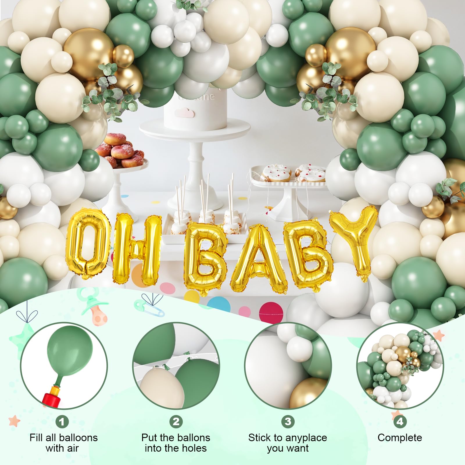 Sage Green Baby Shower Decorations,Boho Greency Neutral Balloon Arch with Oh Baby Balloon Banner Green Gold Balloons For Boy Girl Woodland Baby Shower Birthday Party Supplies