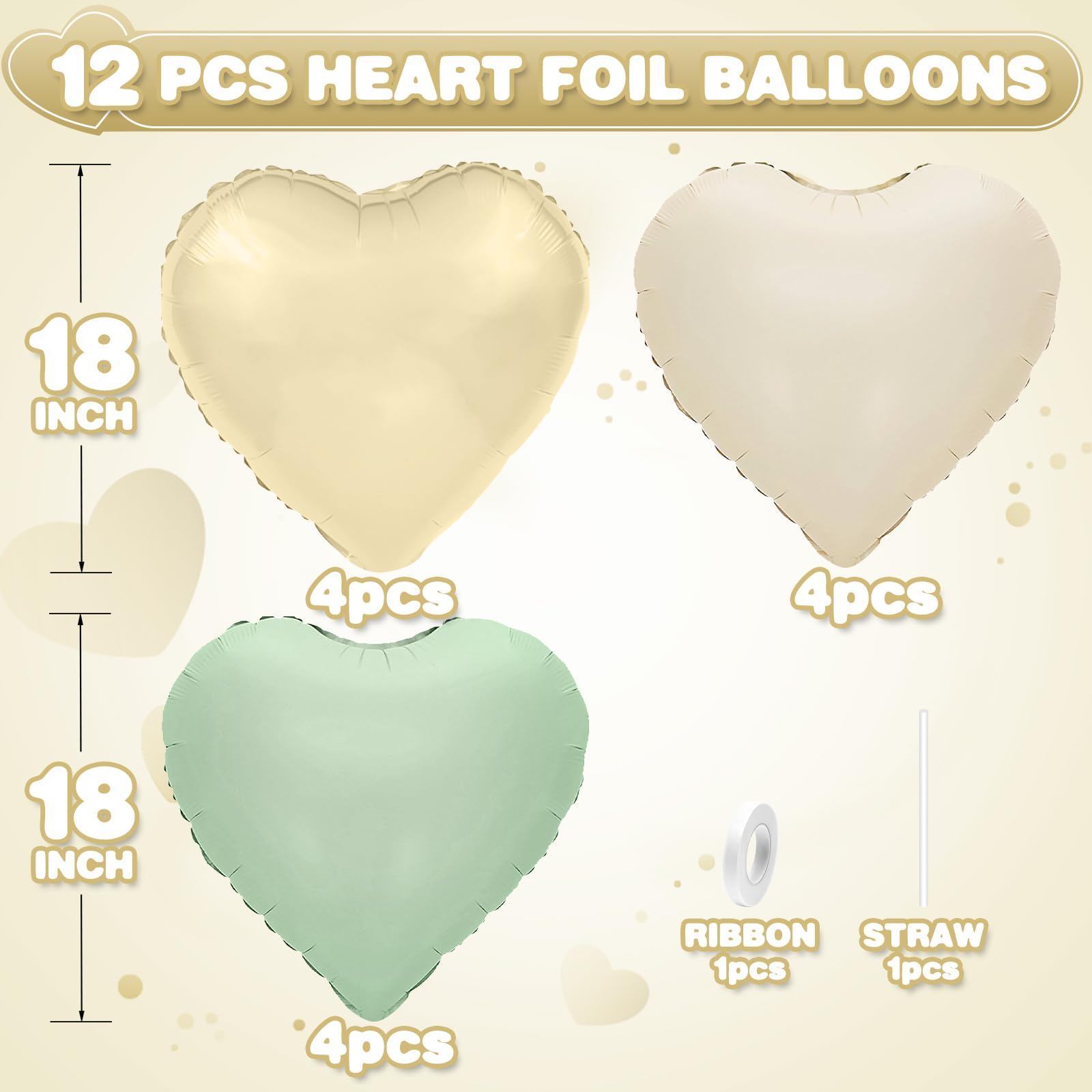 - 【12PCS HEART BALLOONS】Package include 4pcs light gold heart foil balloons,4pcs sage green heart foil balloons,4pcs cream white heart foil balloons,1pc straw.Large enough to help you better decorate your party.