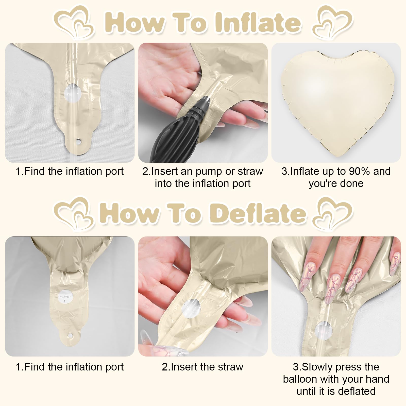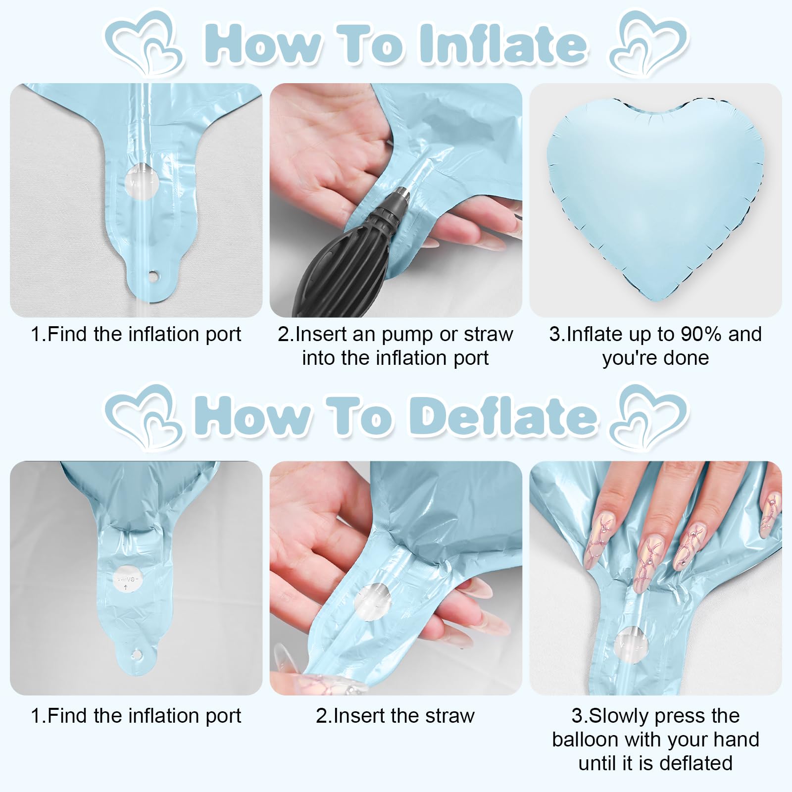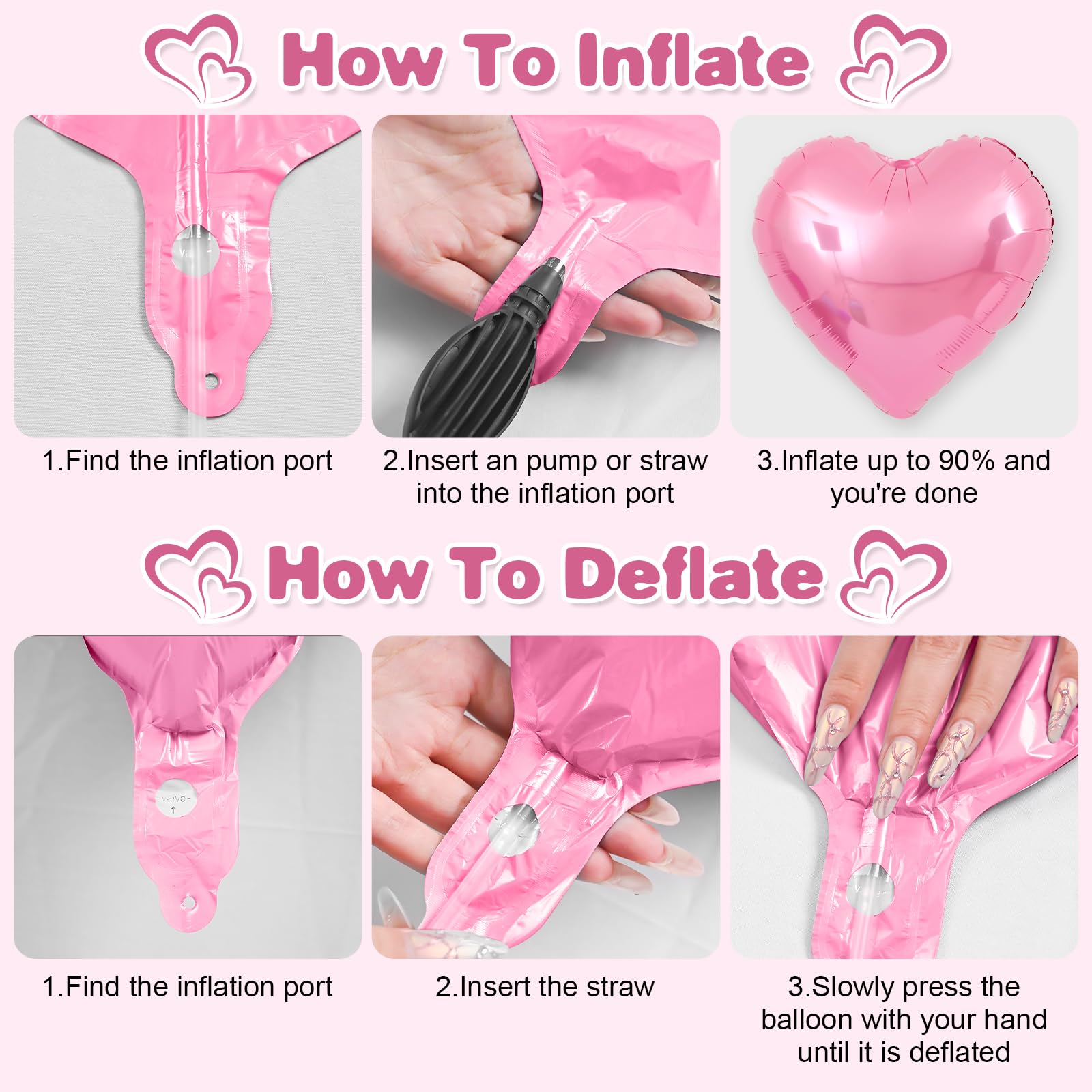- 【EASY USE】Our heart shaped foil balloons are very easy to inflate,the straw inside the package helps you to inflate the balloon, the balloon can be filled with air and helium,after filling the balloon,you can pinch your finger to the position of the inflatable mouth to seal it automatically.