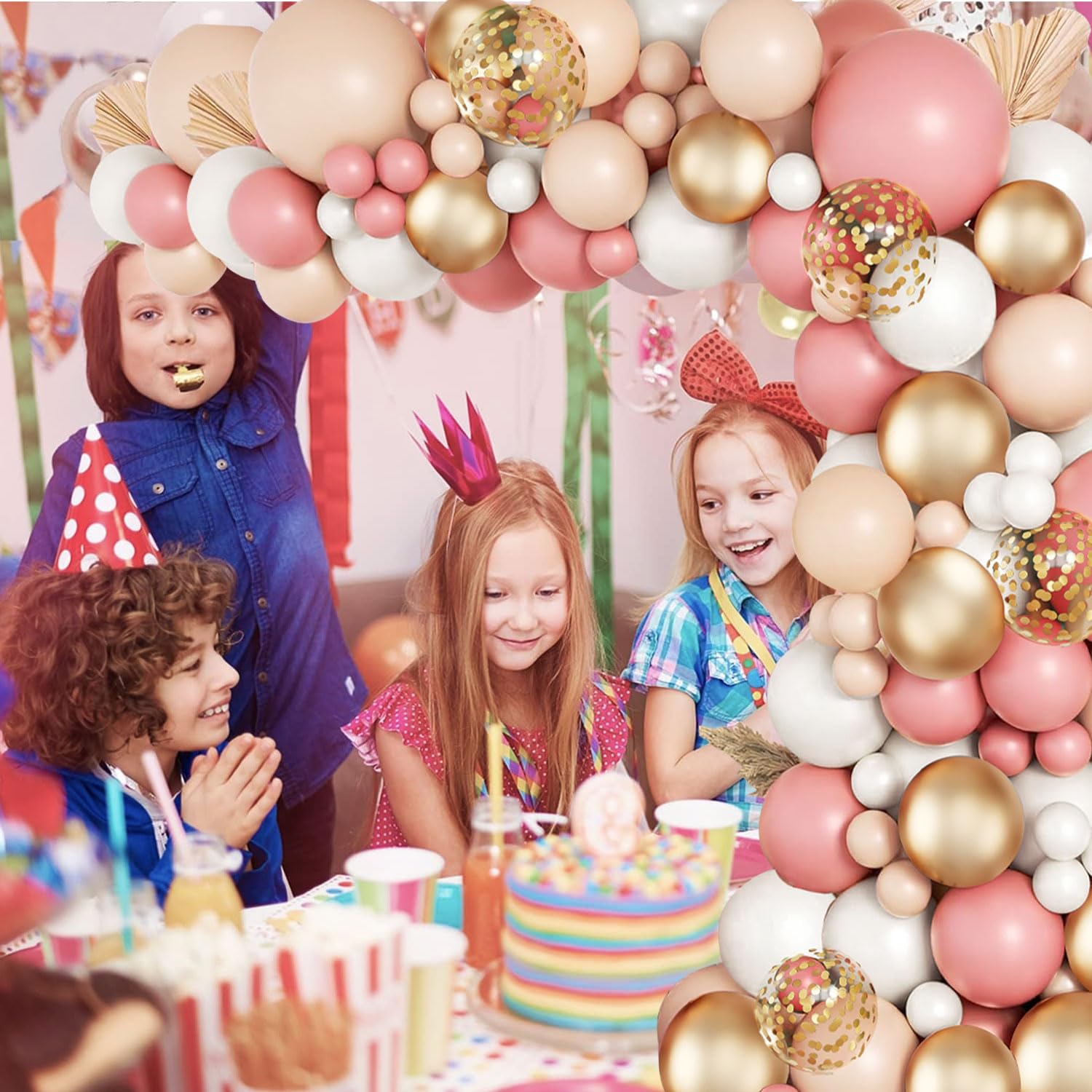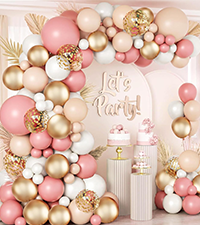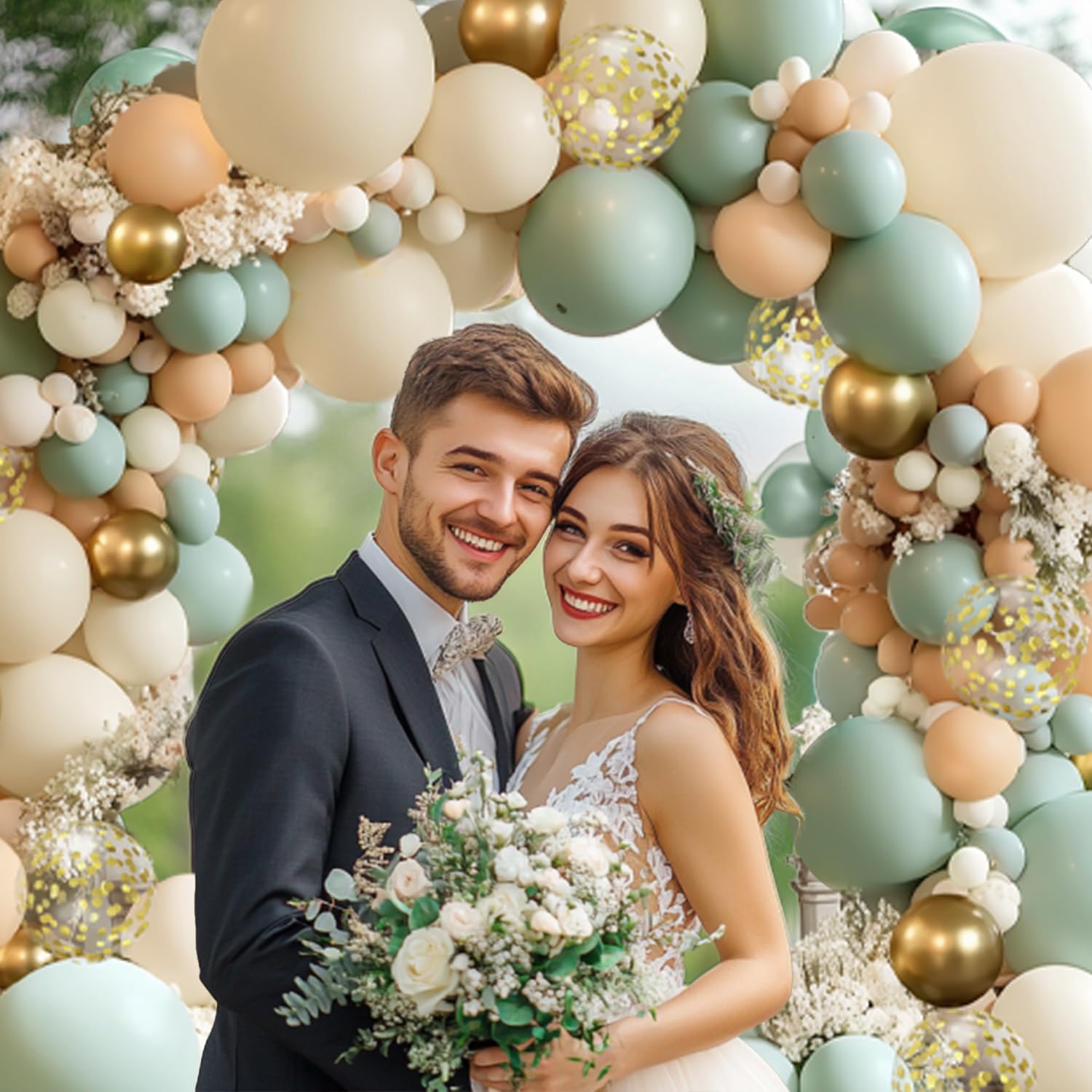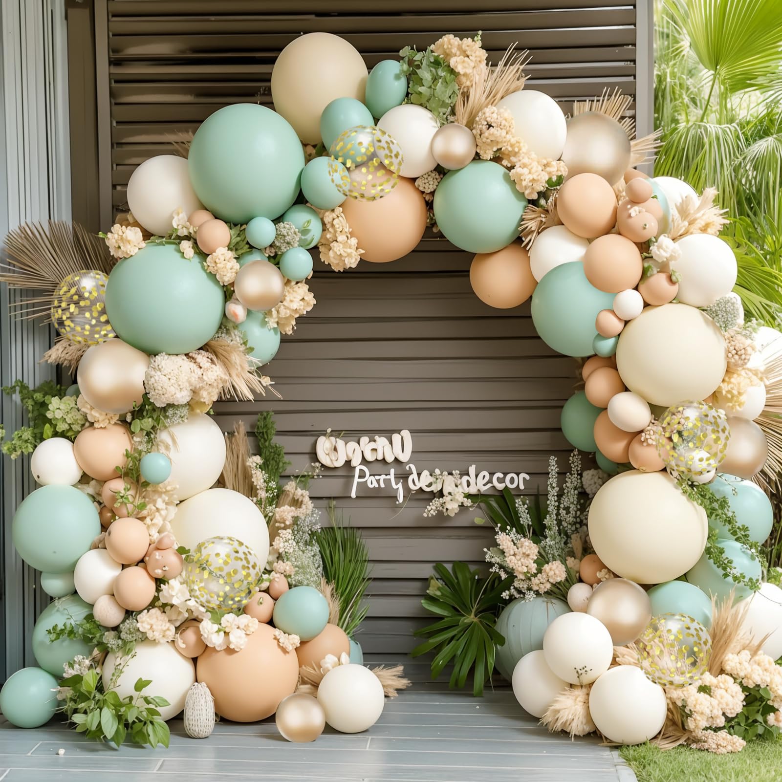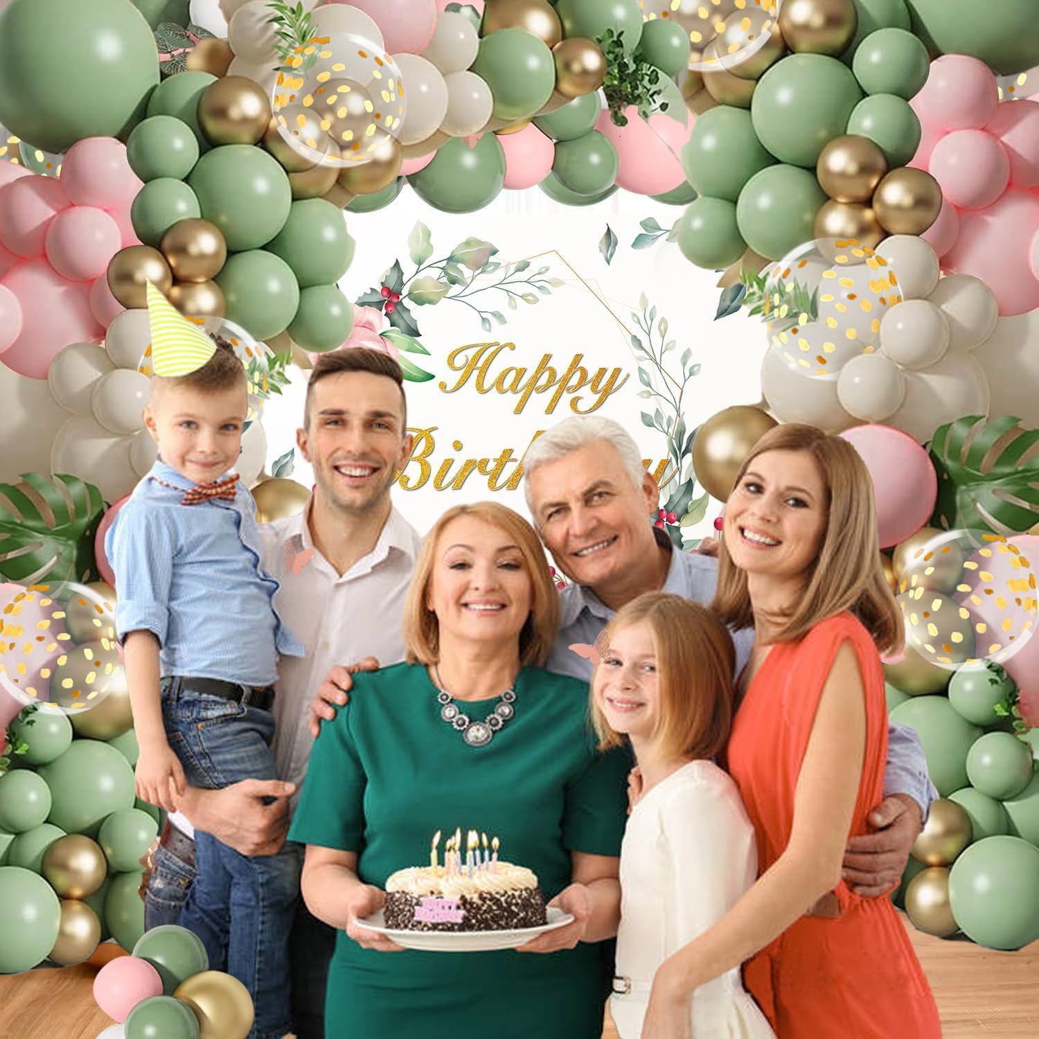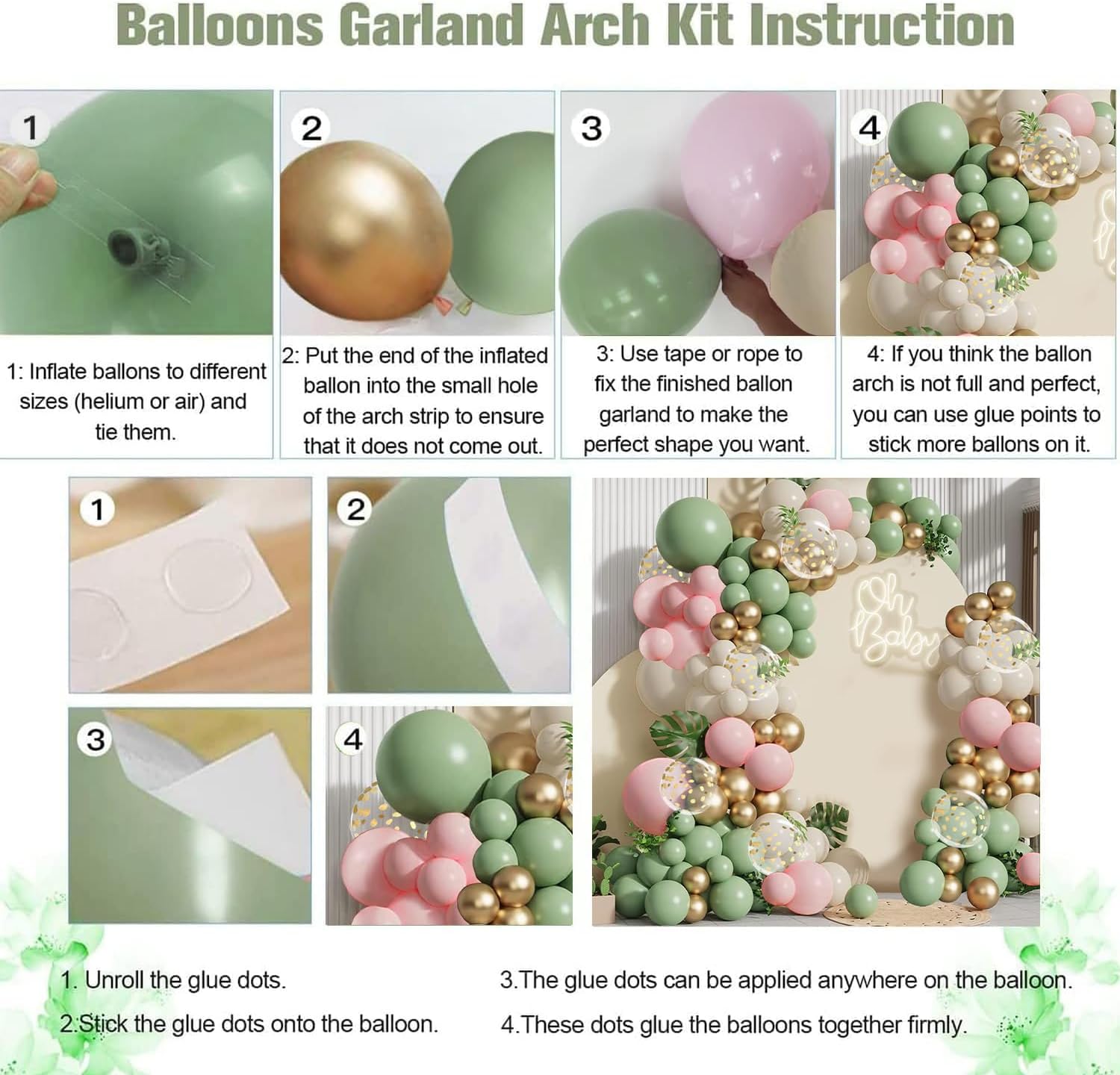 - Pink Green Balloons: Sage green balloon arch kit including: 36pcs sage green balloons, 36pcs macaron pink balloons, 36pcs sand white balloons, 25pcs chrome gold balloons and 10pcs gold confetti balloons. The pink green and gold balloon accessories kit including: 1pcs strip tape, 5pcs glue points.