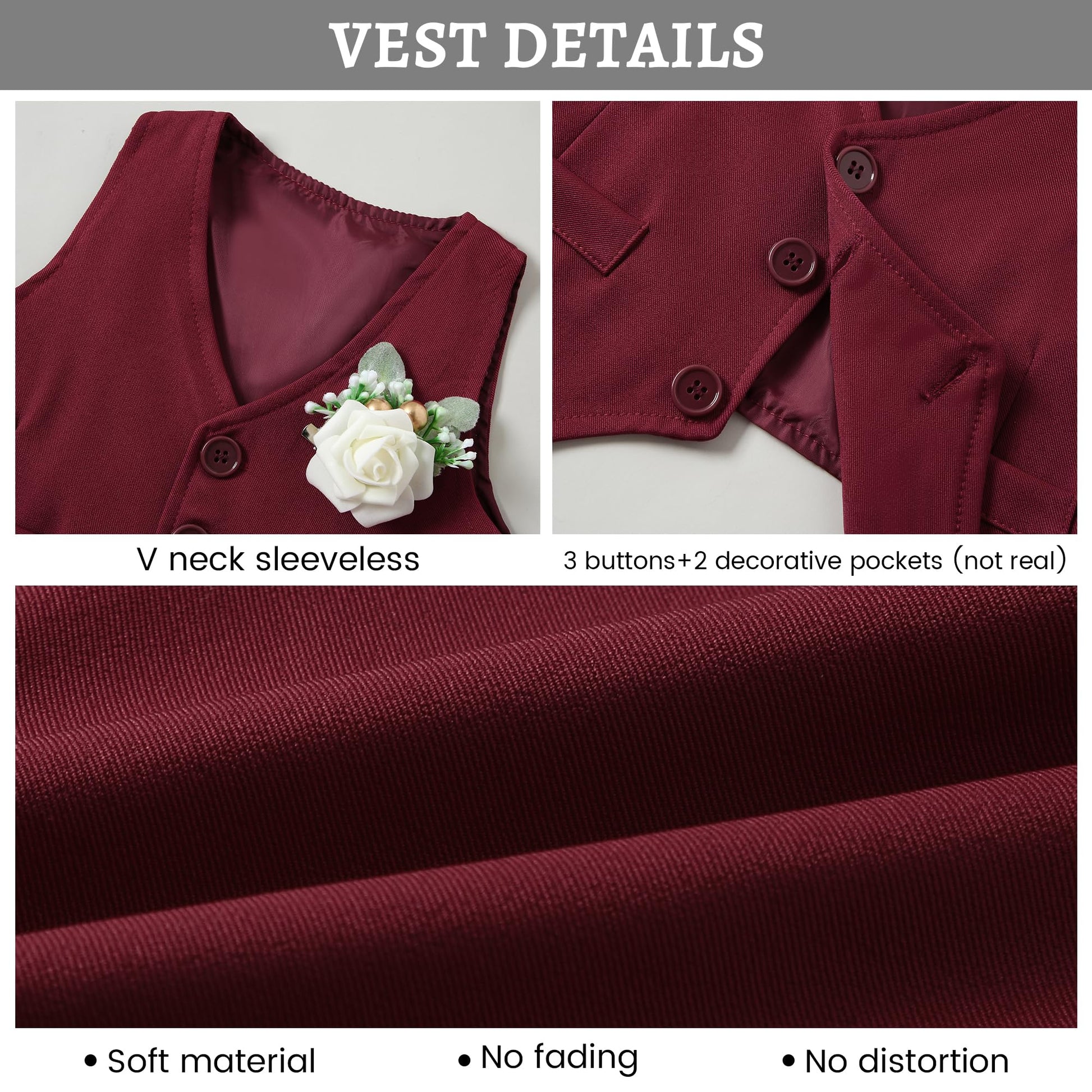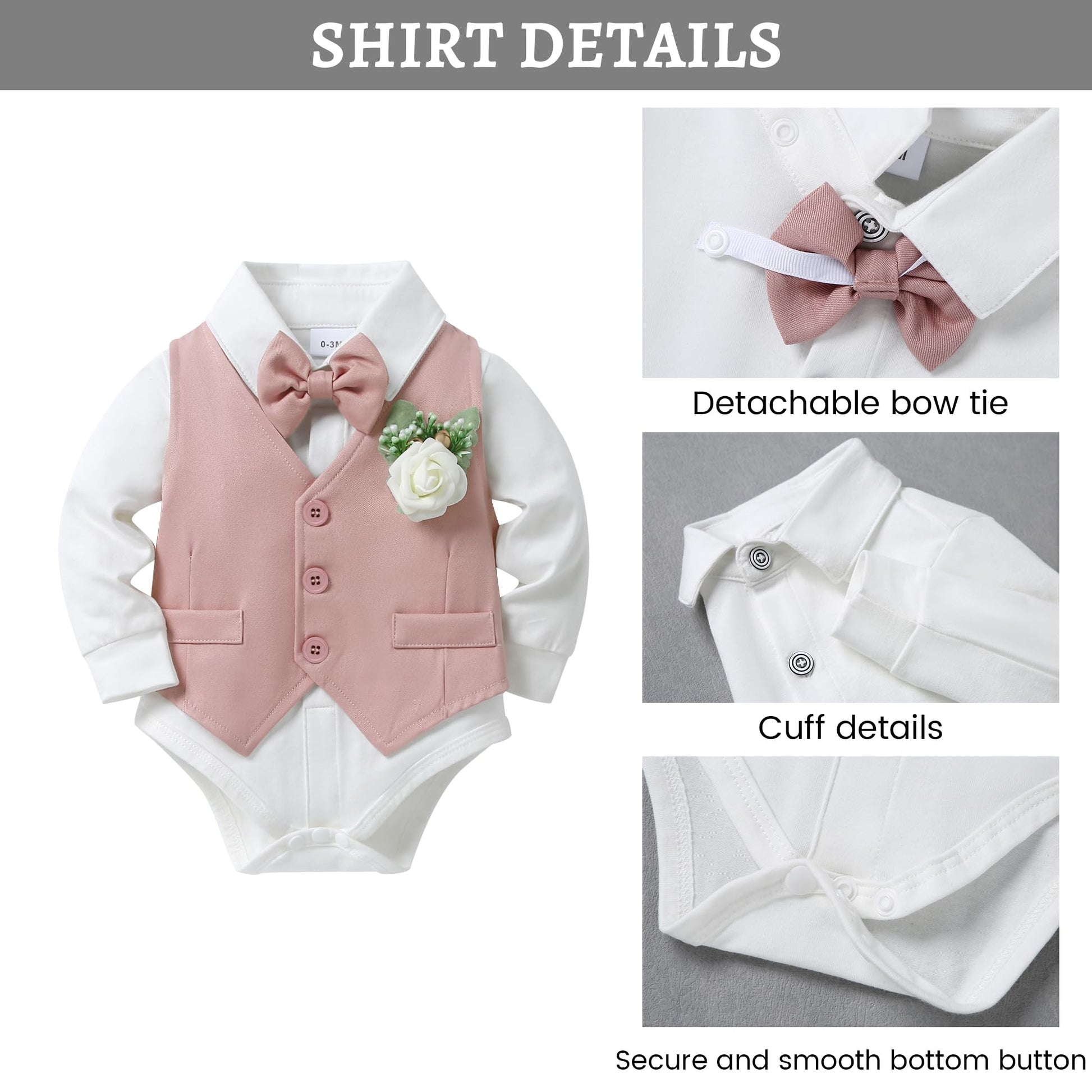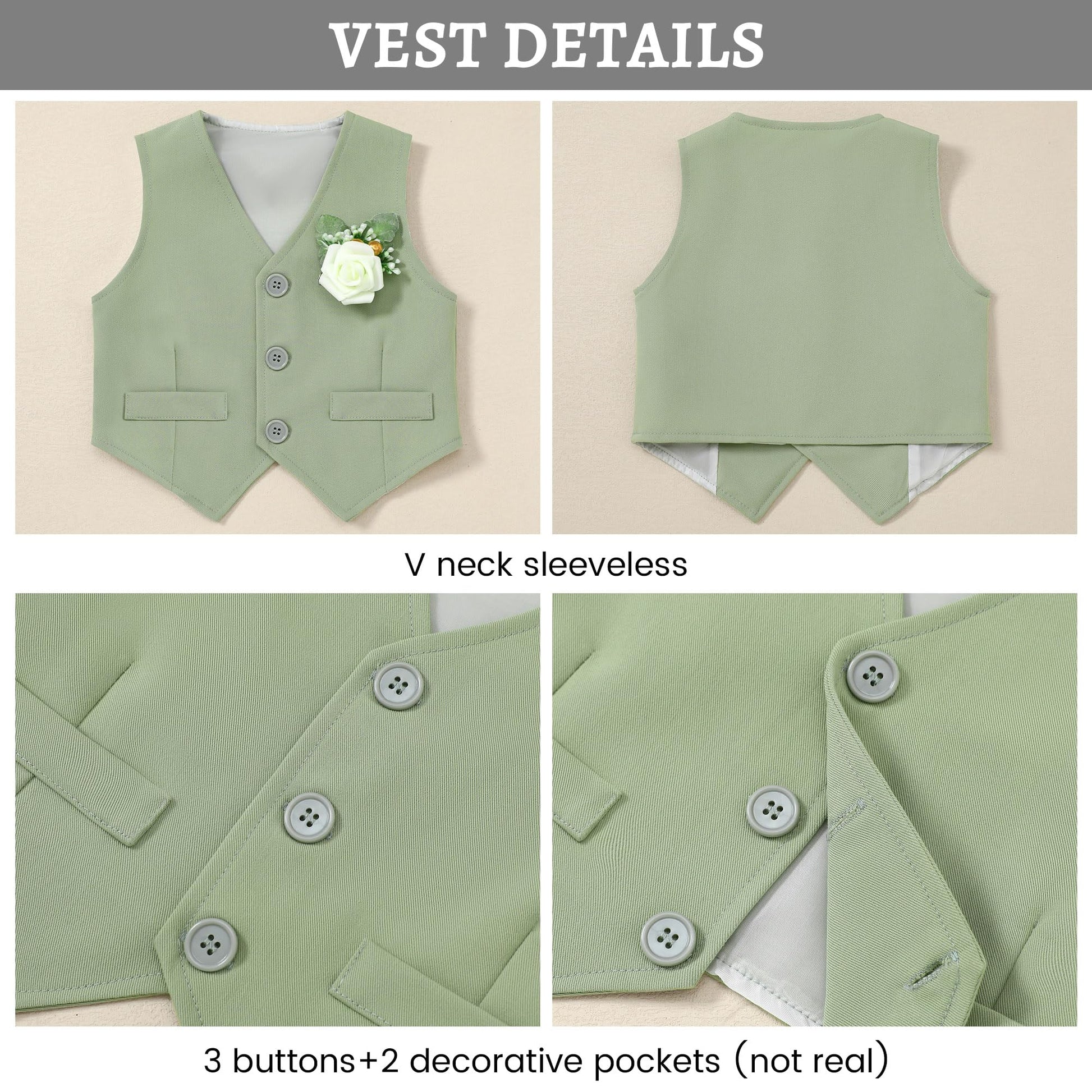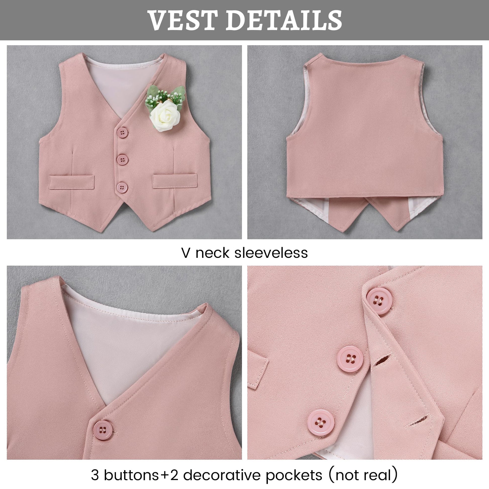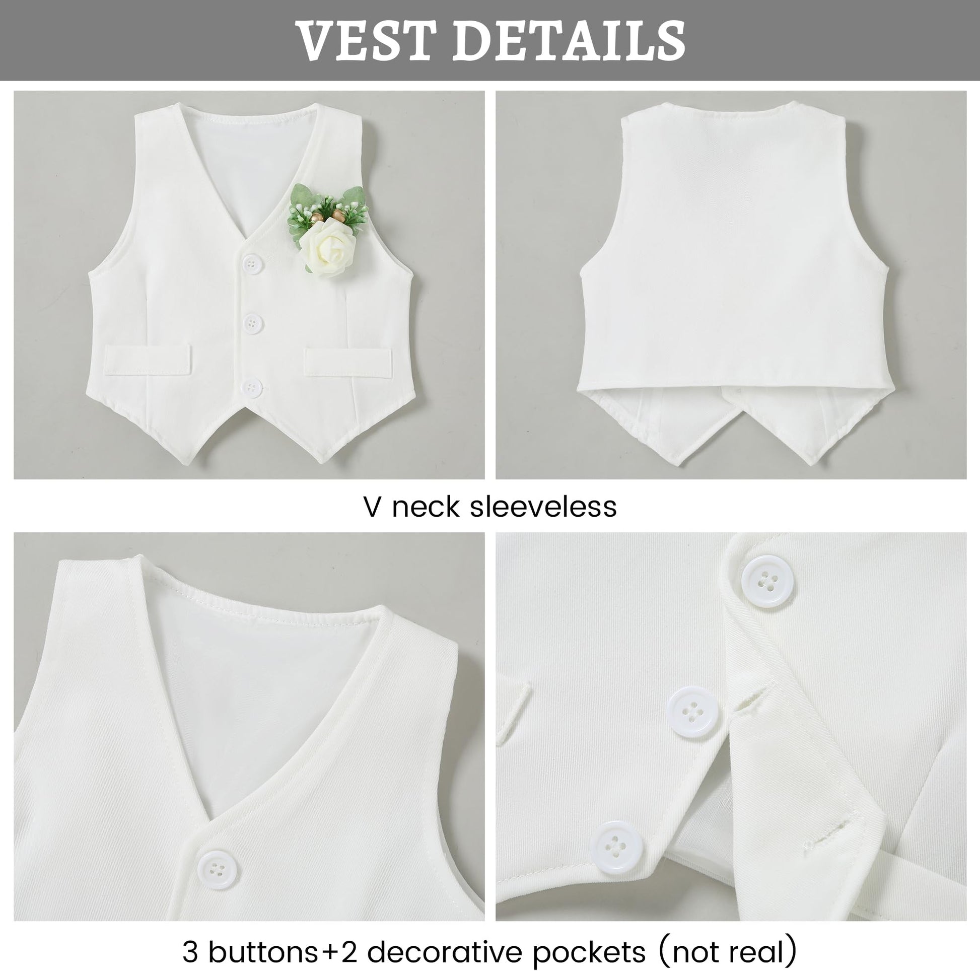 • Vest Details:This baby boy suit 5Pcs baby boy formal outfits set includes a Detachable Boutonniere,a vest that features 3 buttons single-breasted closure and double lining in the back, optimal warmth, and ease of layering