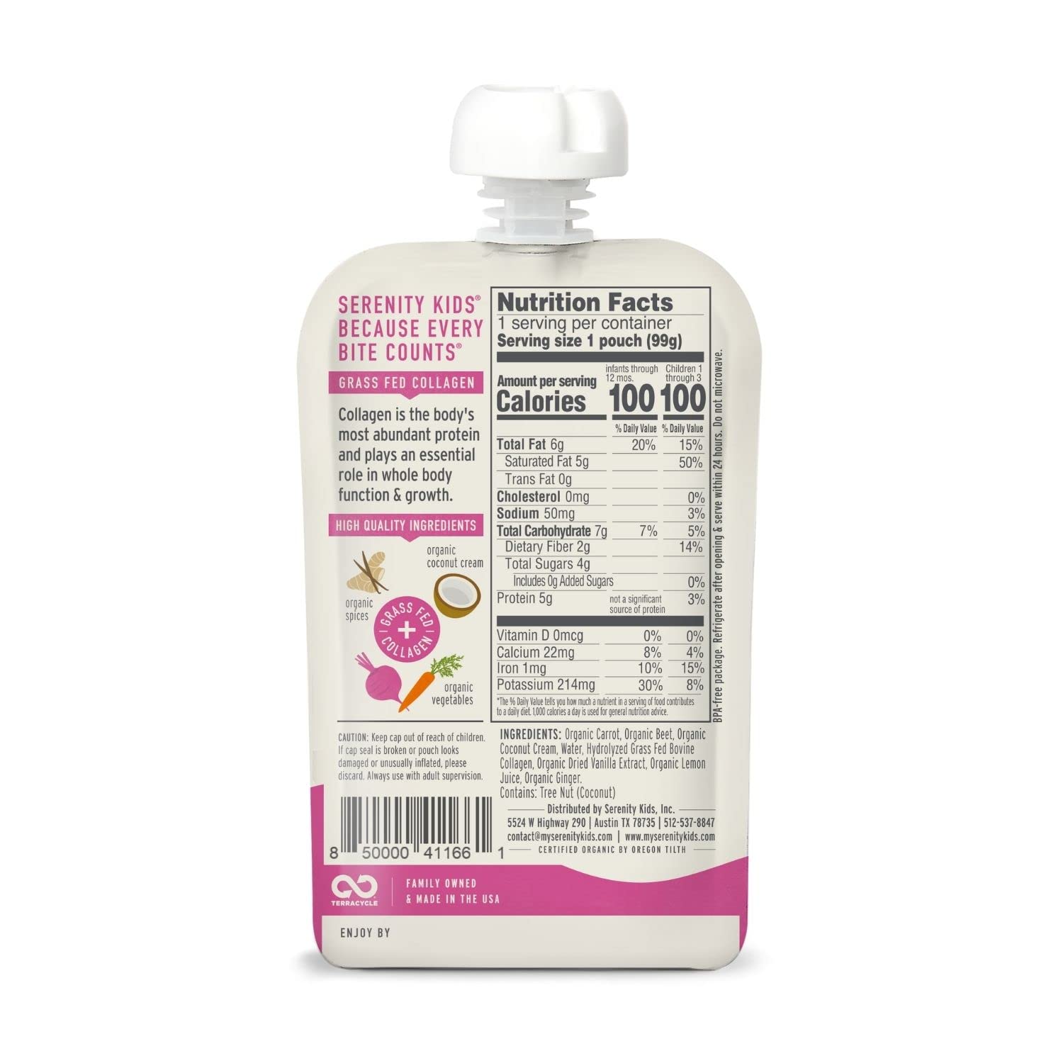 - RECYCLE YOUR POUCHES: Create a TerraCycle account and start collecting finished Serenity Kids baby food pouches in the freezer to prevent any odors. When ready, place the collection into any box you have at home and log into your account to download and print a pre-paid shipping label. Seal your collection box, tape on the printed shipping label, and send it via UPS to be recycled. Feel good knowing that TerraCycle gives your pouches a second life!