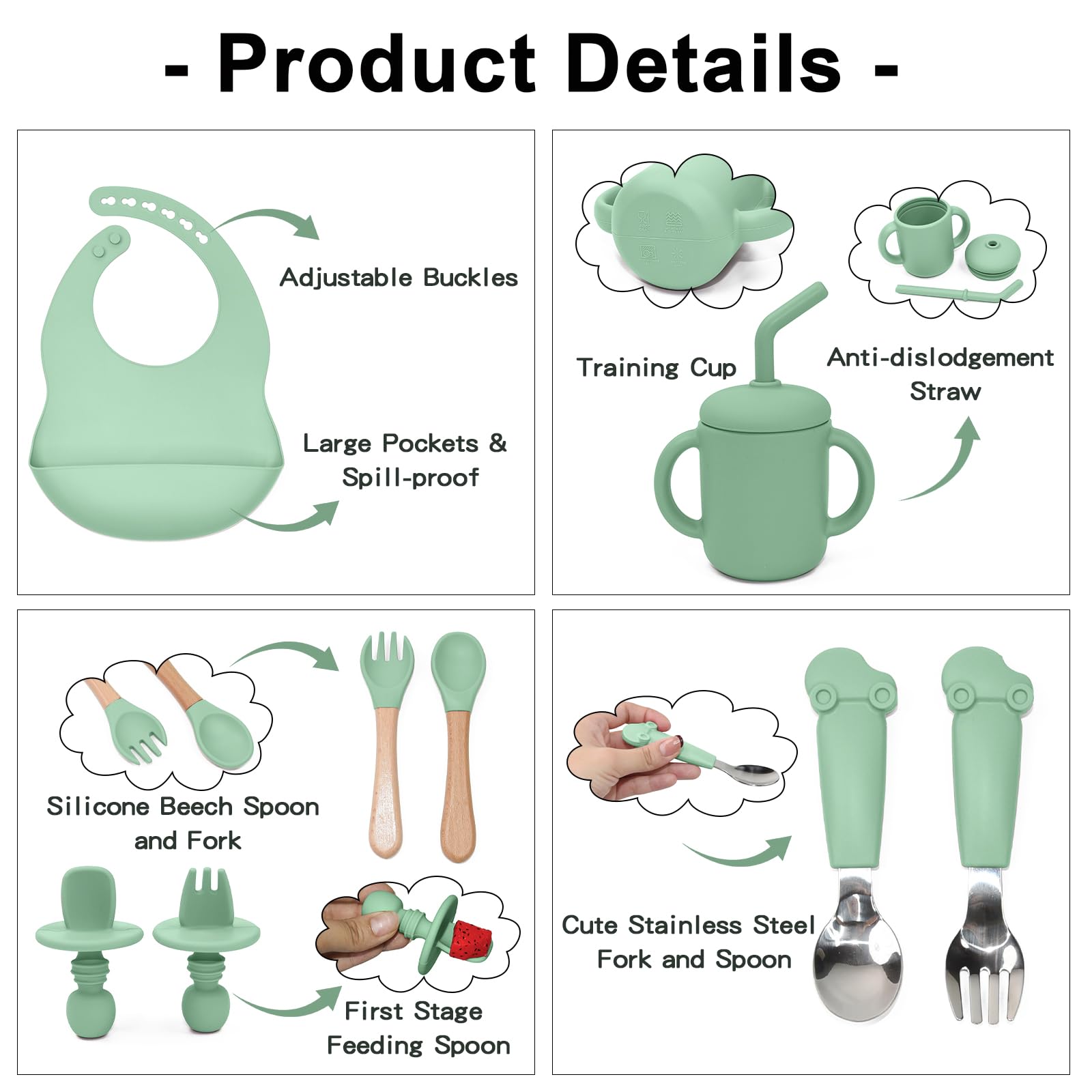 - 【Safe for Baby】 Baby feeding set is made of the quality 100% food grade silicone free of BPA, lead, phthalates and PVC,Making our baby eating utensils absolutely safe and healthy for babies to eat and chew.