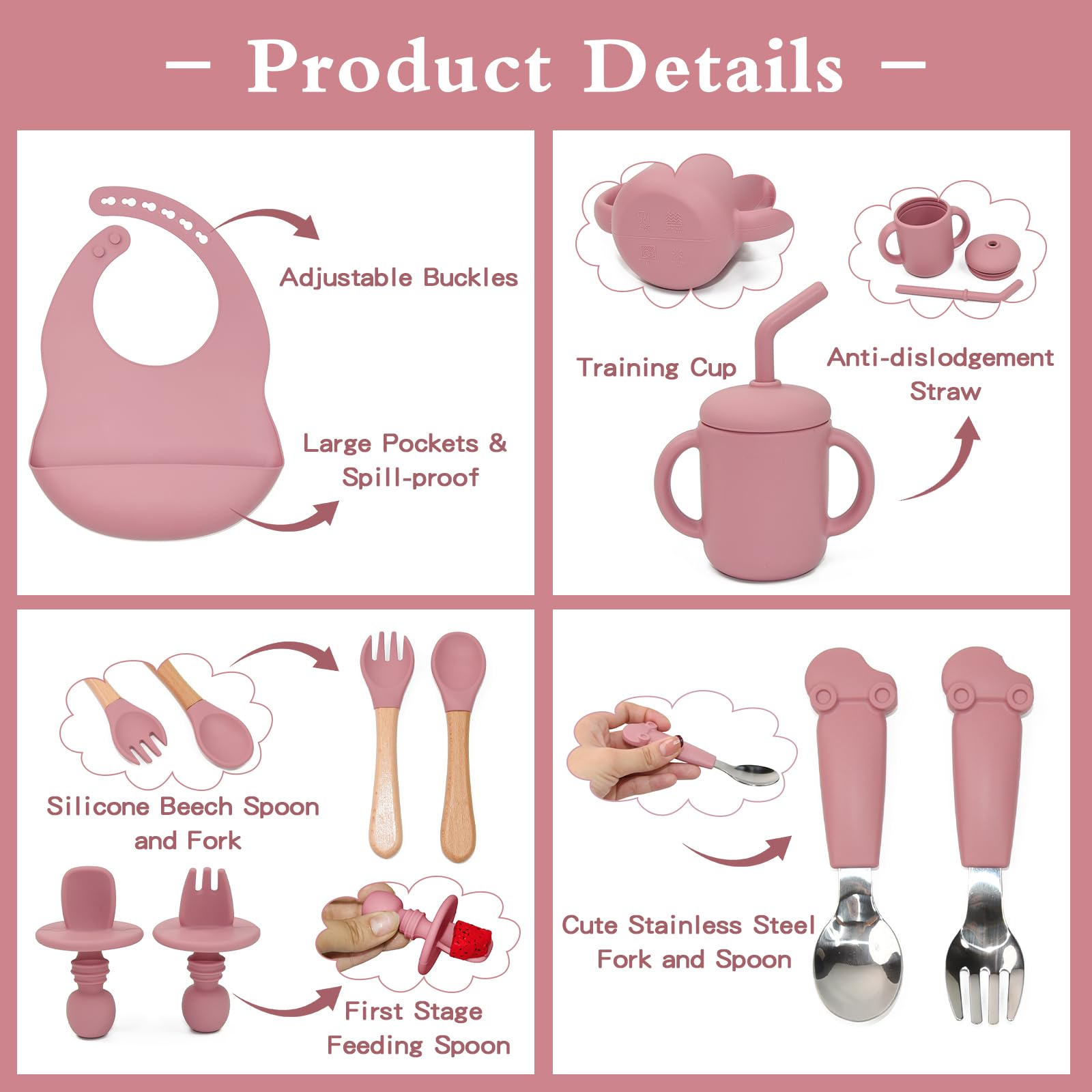 - 【Complete Baby Silicone Feeding Set】Our baby plates and utensils set comes with everything you need to start your baby on solid foods - adjustable bibs, suction plate and bowl, training sippy cup, and utensils. Makes a perfect baby gift!