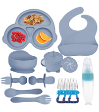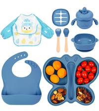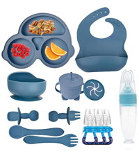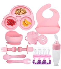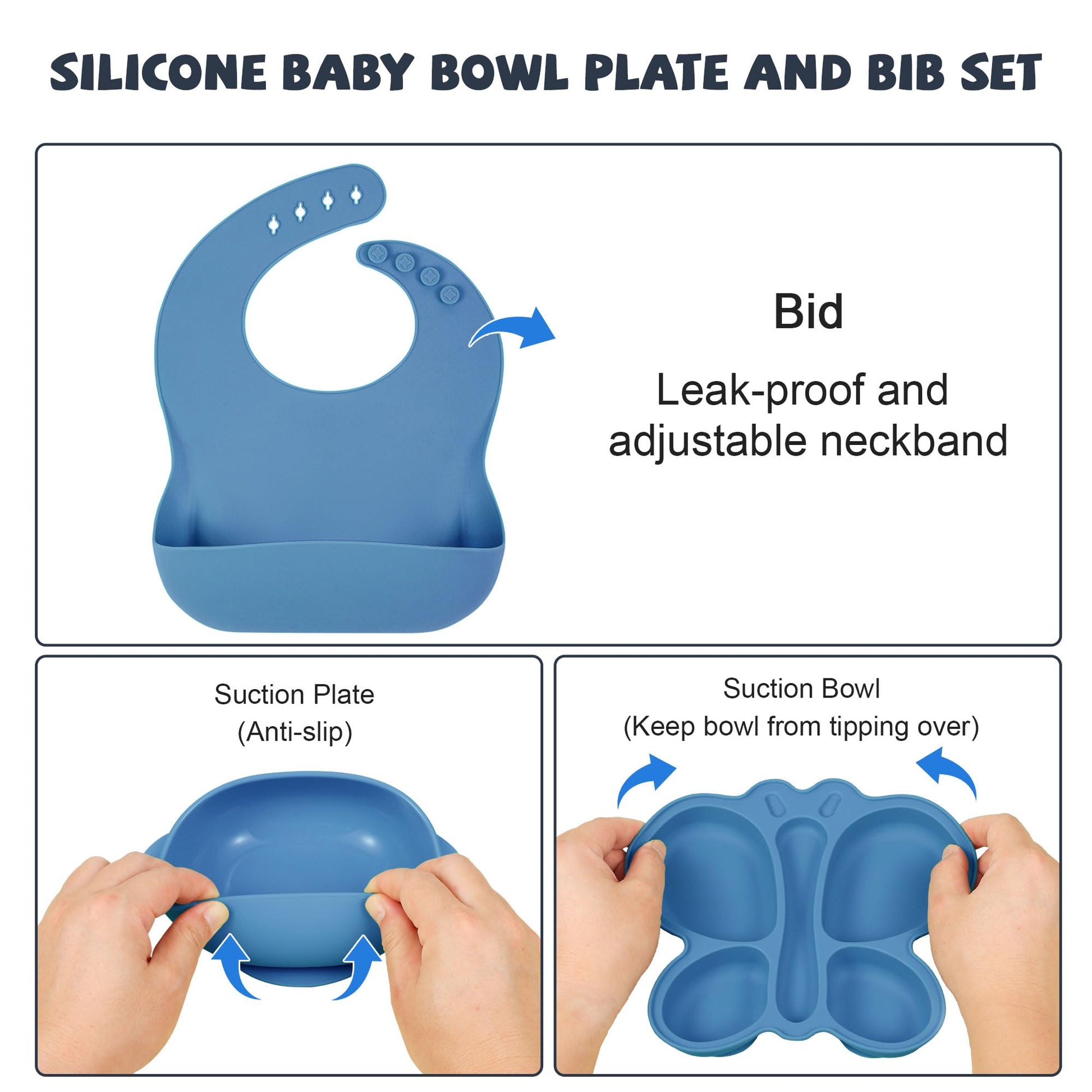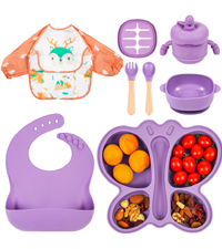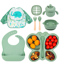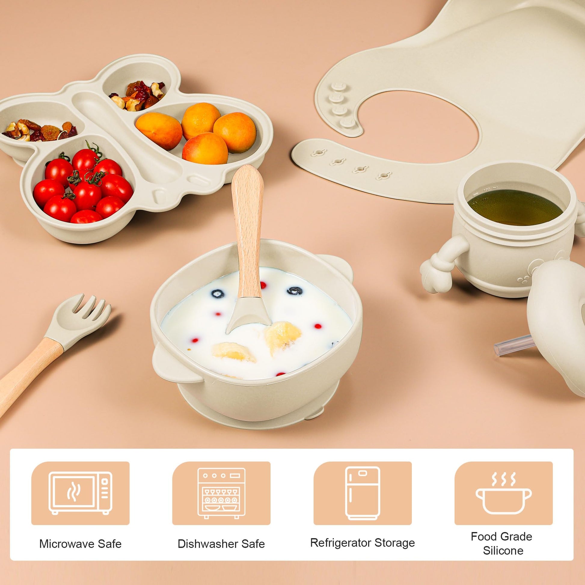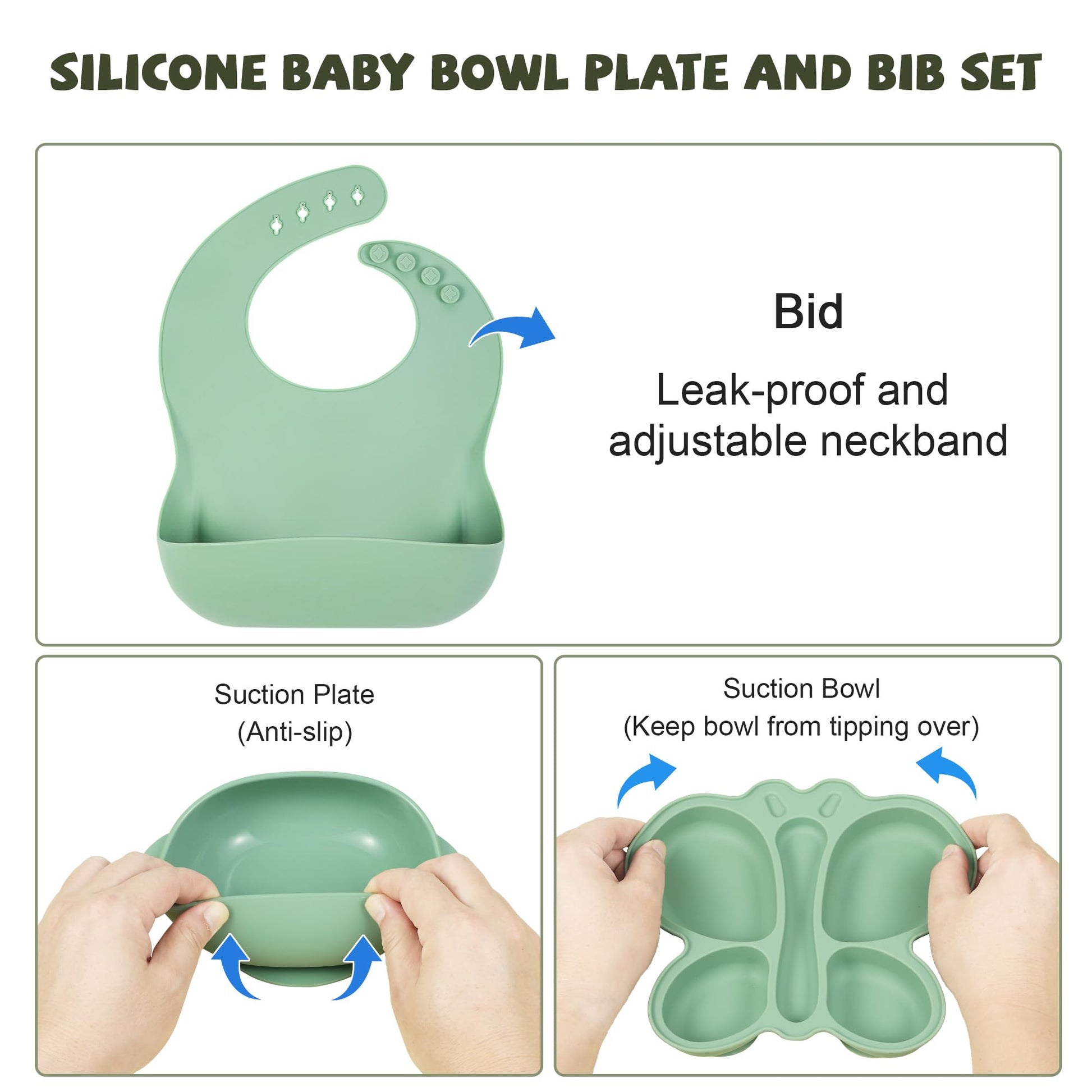 - Terrific Training Tableware: Help baby learn how to eat and drink without help. Our baby eating set includes one suction plate, one suction bowl with lid, one adjustable silicone bib, one drinking cup with straw and lid, one spoon, one fork and one fabric bib. Perfect for baby led weaning, this set provides a safe and convenient solution for feeding babies 6-12 months+