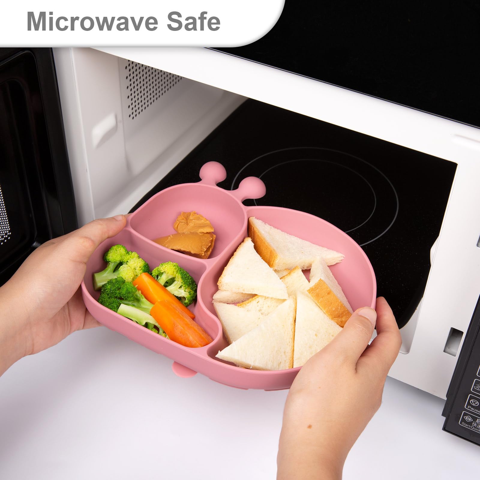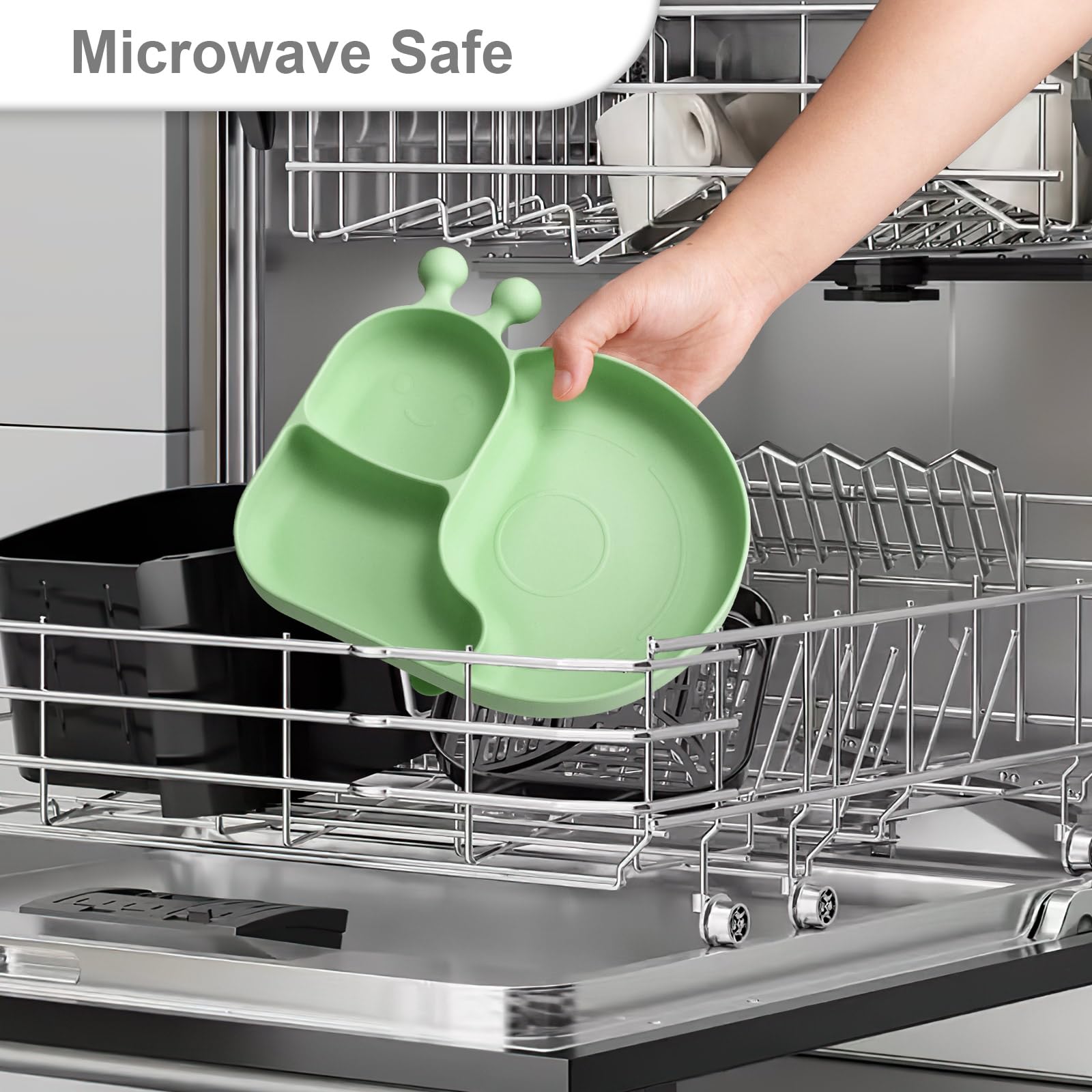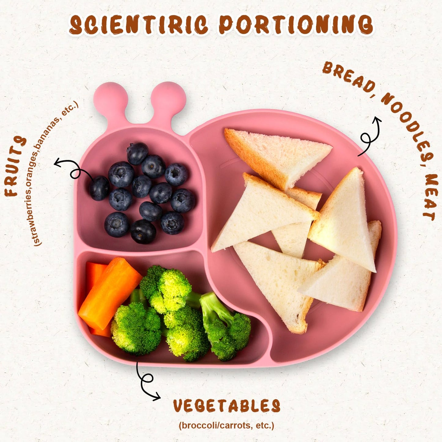 Silicone Baby Plate with Super Suction β Snail Shape 3 Compartment Toddler Food Plate Self Feeding Unbreakable Eating Supplies for Boys and Girls (Pink) (Green)