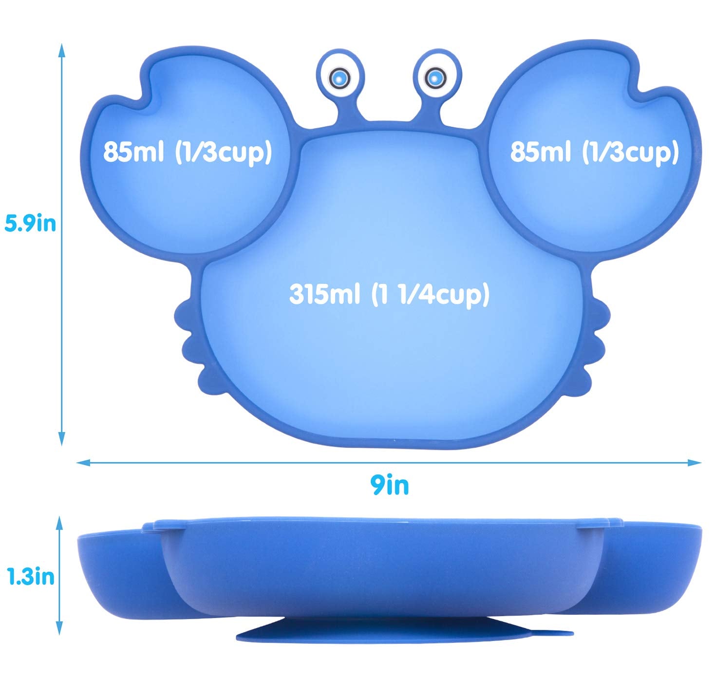 - More Nutritious -The divided plate with Unique Cute-shaped Designed Plate, Divided into 3 compartments, you can put some different food separately, you can put fruit, purees, meat, vegetable in 2 small parts and the belly of the Crab can put main dish, such as baby cereal, noodles, rice, oatmeal and pasta.