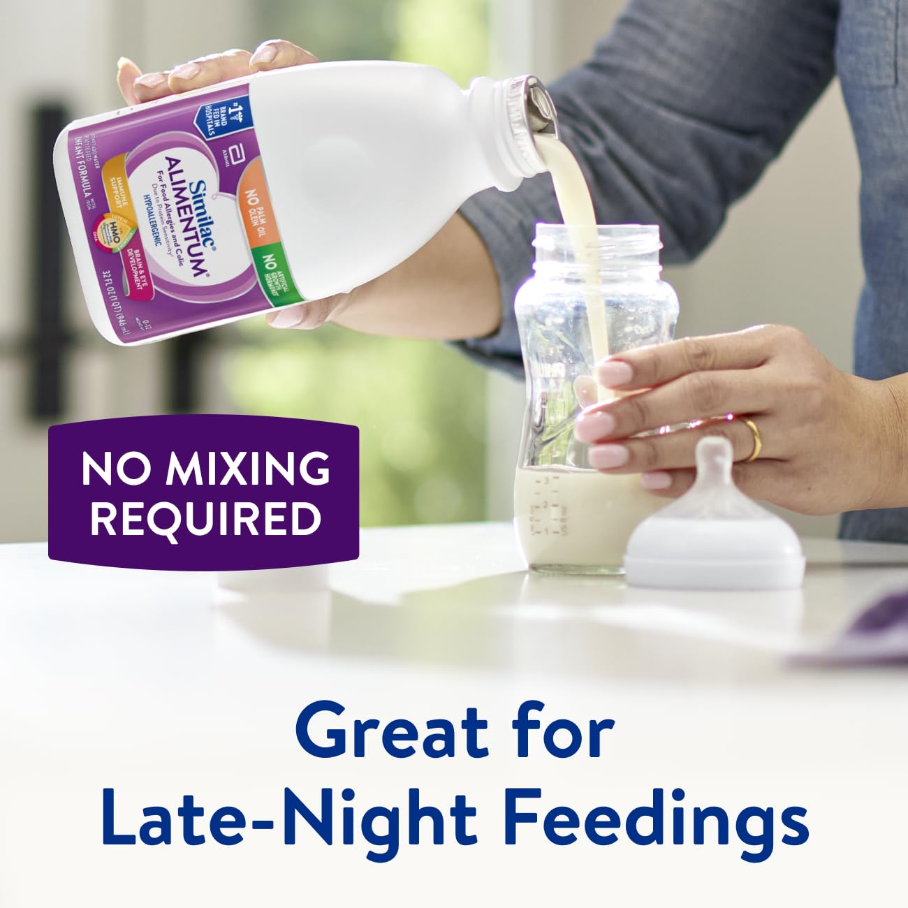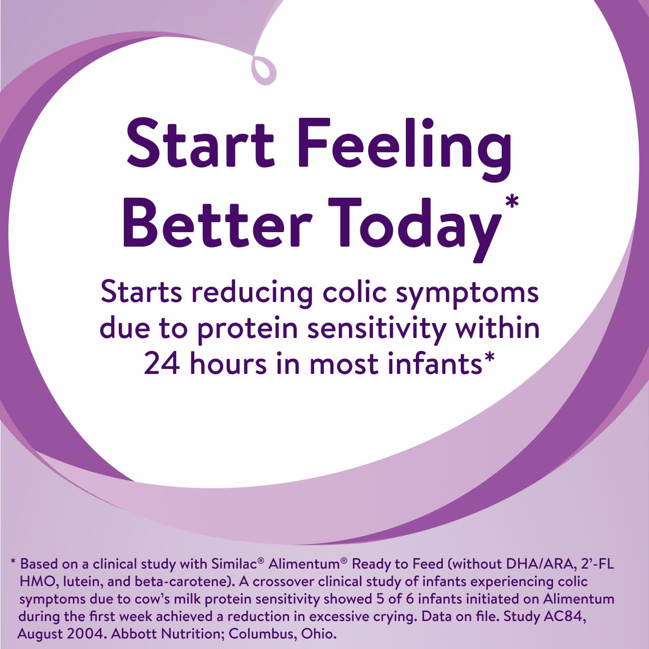 Similac Alimentum infant formula with 2'-FL HMO is the first and only hypoallergenic infant formula with 2'-FL HMO, a unique immune-nourishing ingredient. It starts reducing colic symptoms due to protein sensitivity in most babies within 24 hours,† so your baby can start feeling better today.† * Due to protein sensitivity. † Based on a clinical study with Alimentum Ready to Feed without DHA, ARA, 2'-FL HMO, lutein, and beta-carotene. A crossover clinical study of infants experiencing colic symptoms due to cow’s milk protein sensitivity showed 5 of 6 infants initiated on Alimentum during the first week achieved a reduction in excessive crying. Data on File, Study AC84, August 2004. Abbott Nutrition, Columbus, Ohio.