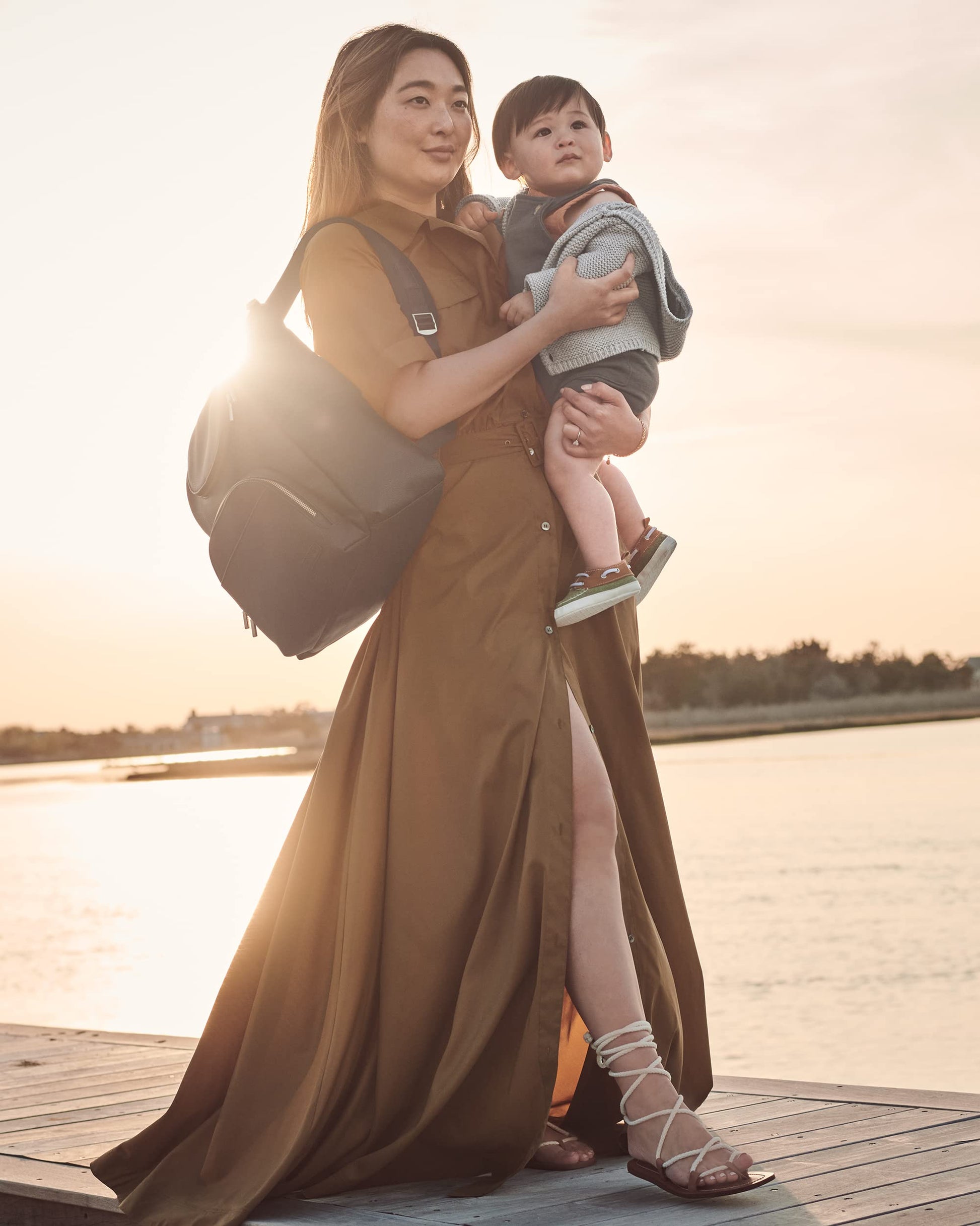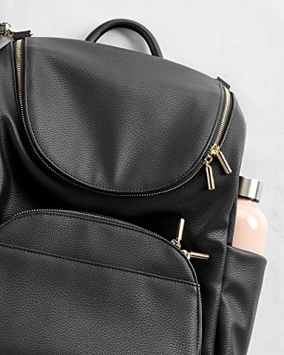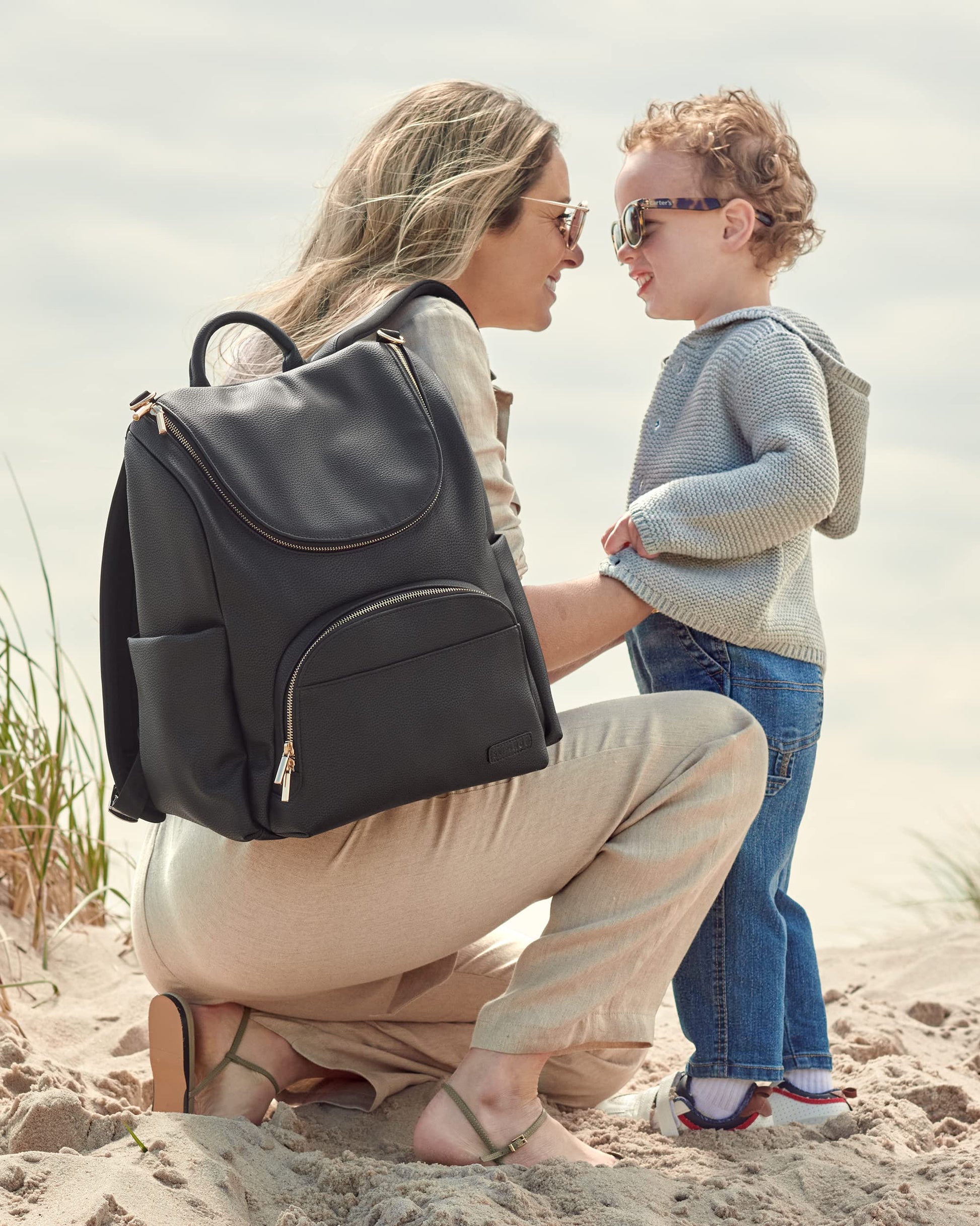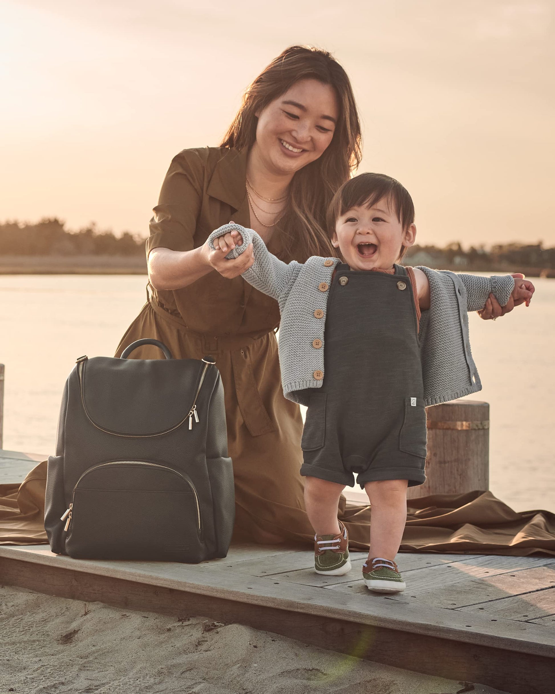Meet the diaper backpack that does it all—every day of the week! Designed to check off all the boxes on your dream bag wish list, we combined ultimate function (check out all the included accessories!) with supple pebbled vegan leather for a luxe look that pivots seamlessly into life beyond baby. Roomy enough to hold all the essentials, the streamlined style features ten pockets (including a padded laptop pocket), plus a matching clip-on wristlet pouch, sanitizer holder and pacifier pocket for quick and easy access.