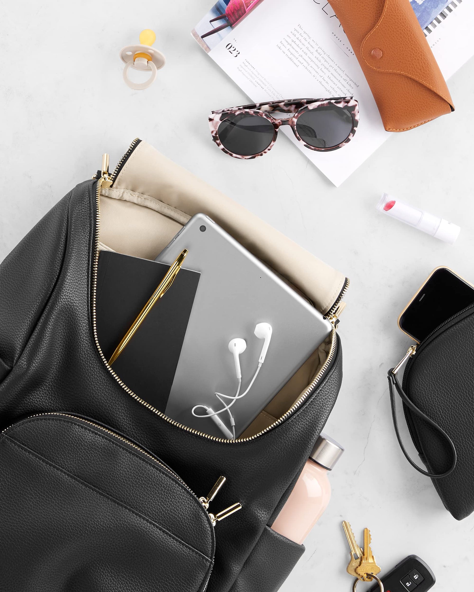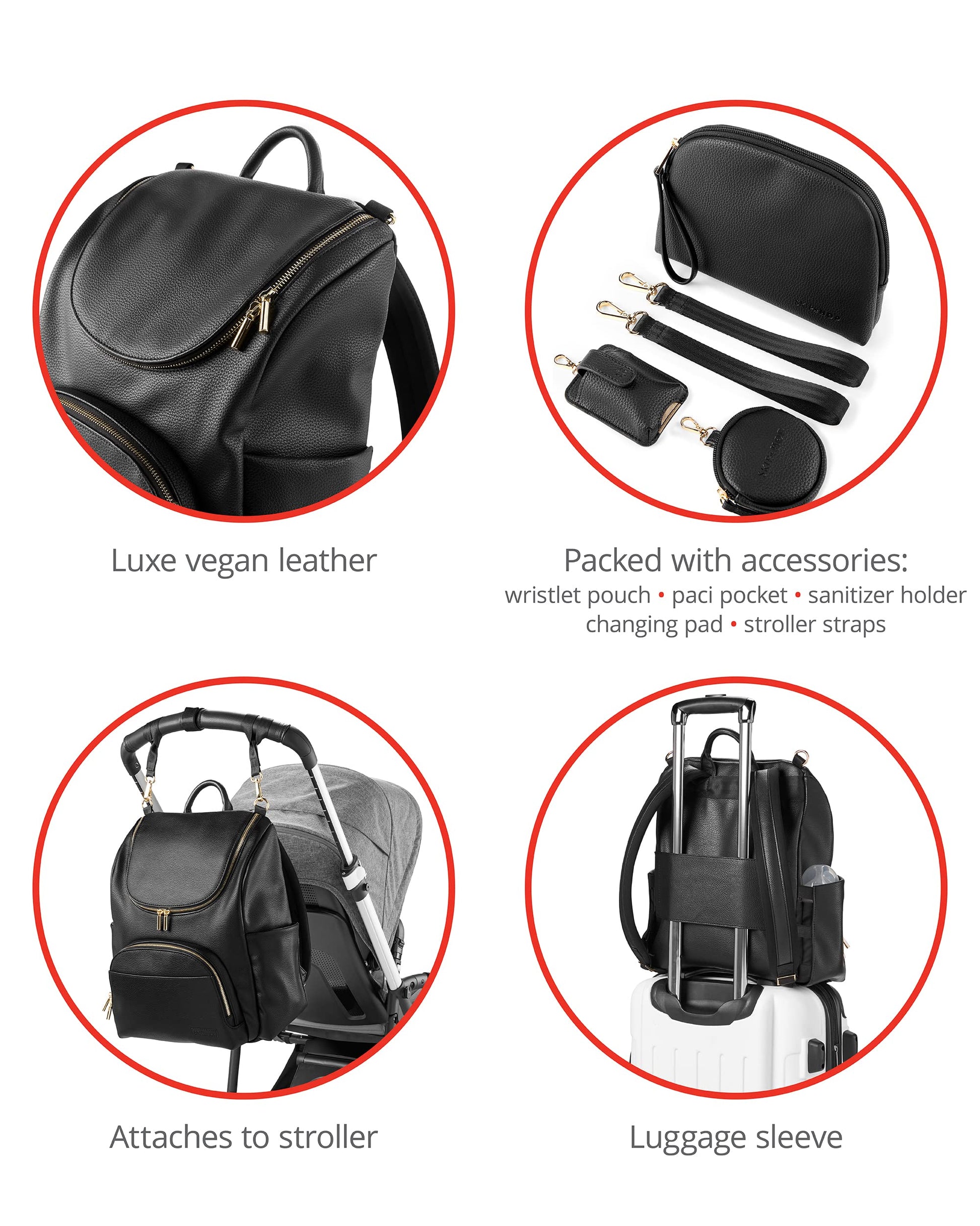 - Designed to check off all the boxes on your dream bag wish list, we combined ultimate function (check out all the included accessories!) with supple pebbled vegan leather for a luxe look that pivots seamlessly into life beyond baby.