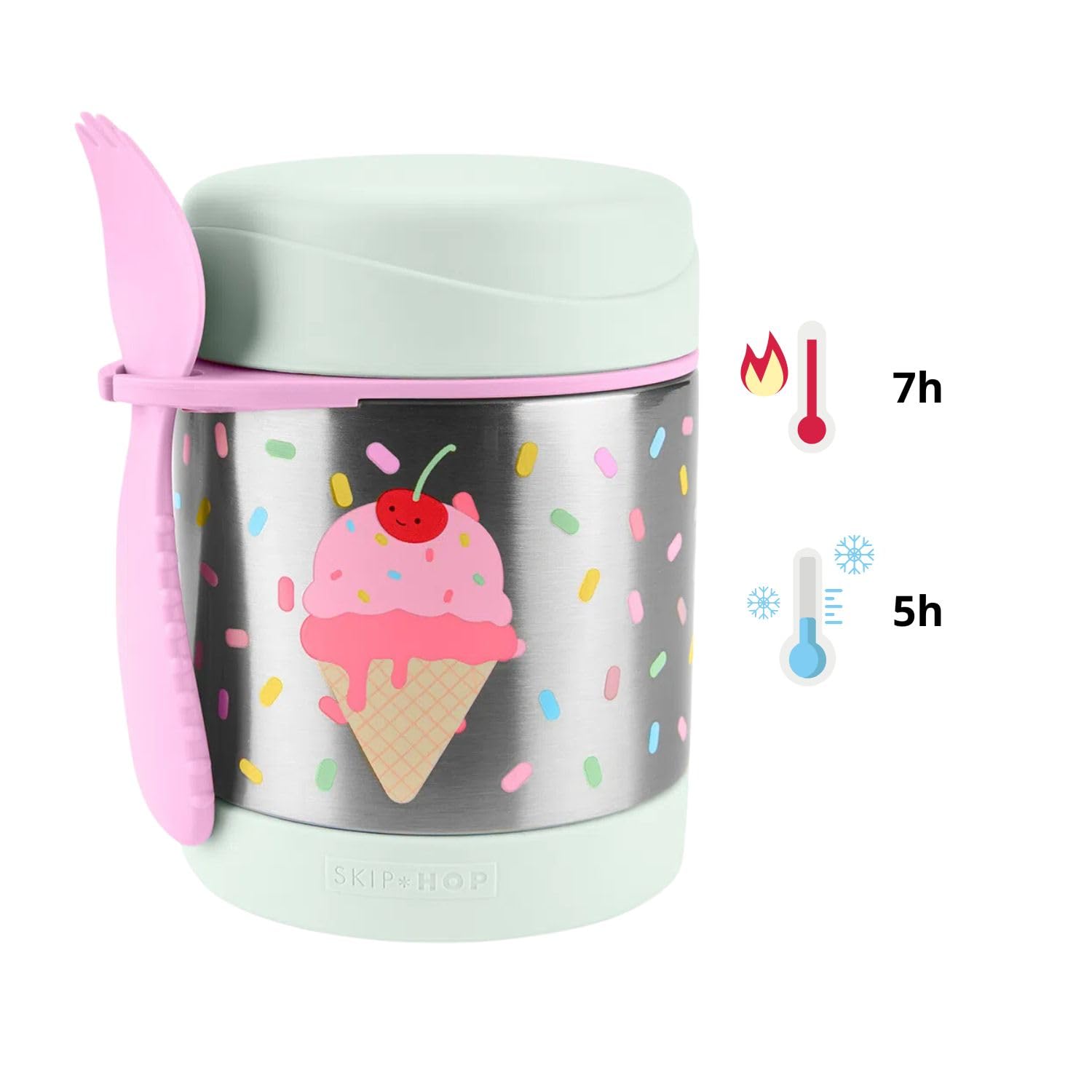 - Featuring cool designs that let little personalities shine, our stainless steel food container keeps kid-sized portions warm or cold for on-the-go munching. We even included a matching spork with a built-in holder (how handy is that?)