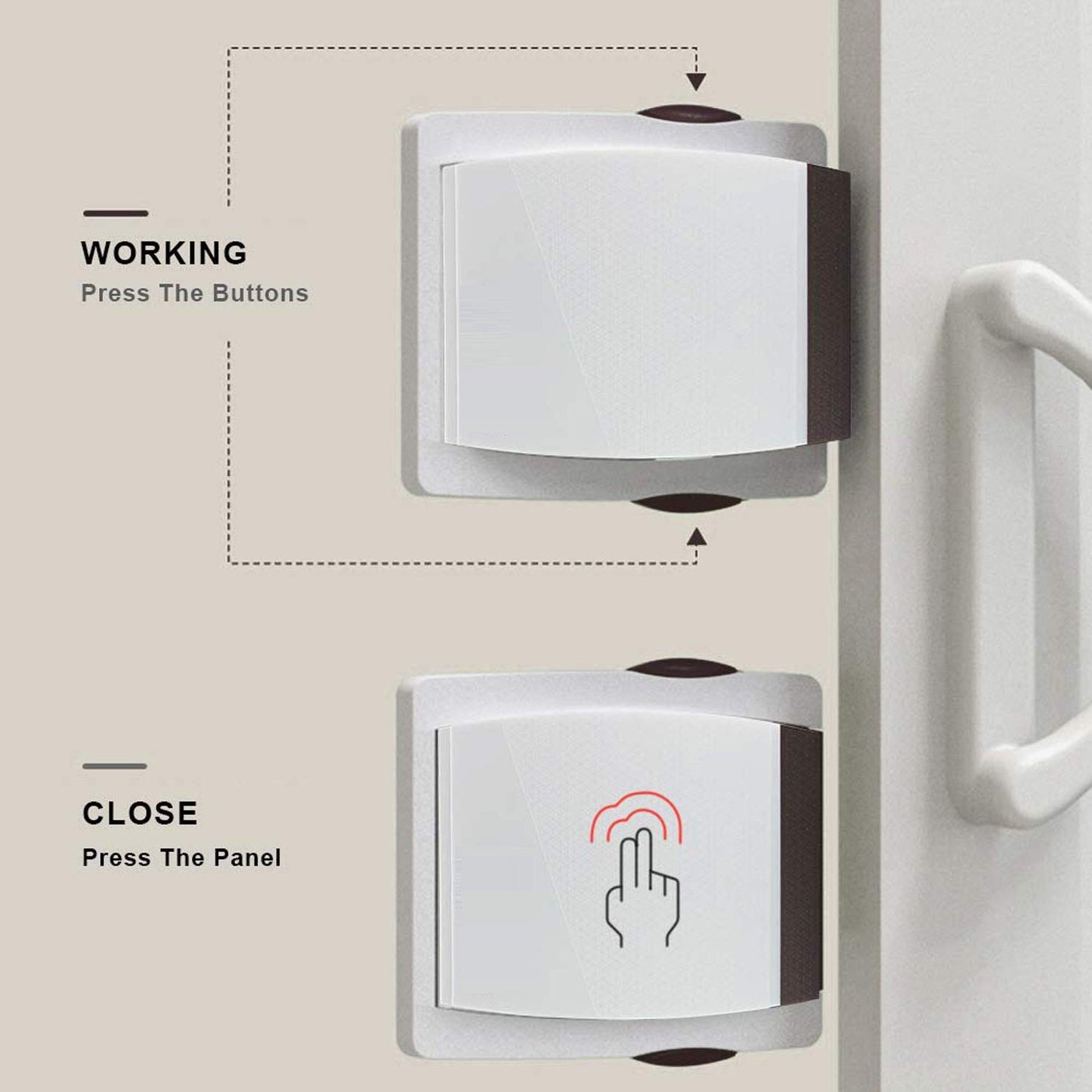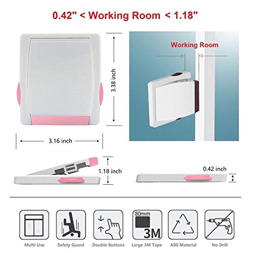 - SAFE DESIGN – Unlike other sliding glass door lock, this sliding door child lock is installed beside door shelf and works once double buttons pressed simultaneously, which stops the door slided and passed each other. This lock is off to press the locking cover for unlock condition!