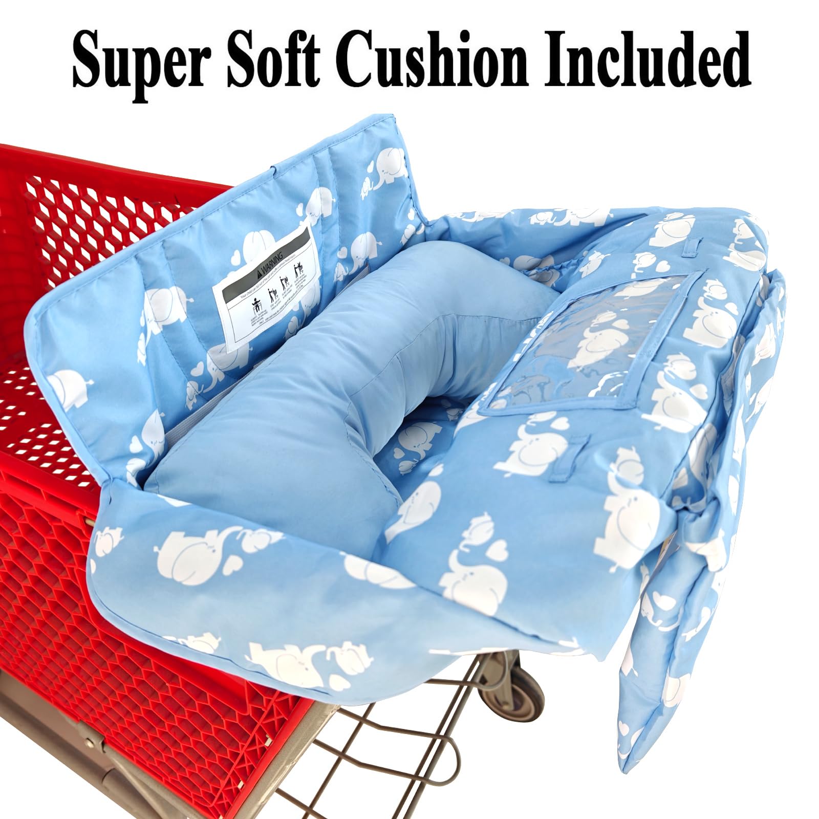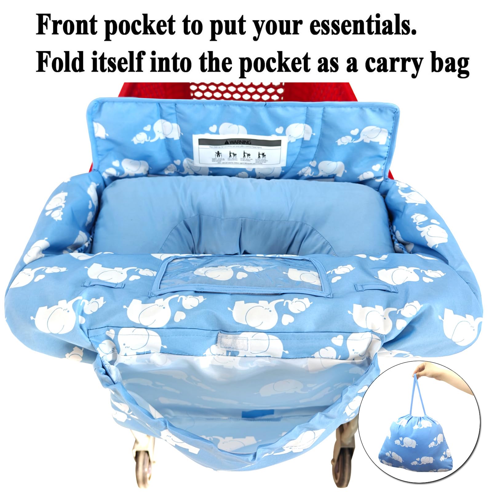 Soft Pillow Attached 2-in-1 Shopping Cart and High Chair Cover for Baby, Cotton Padded Cart Cover, Fold'n Roll Style, Portable with Carry Bag (Blue Elephant)