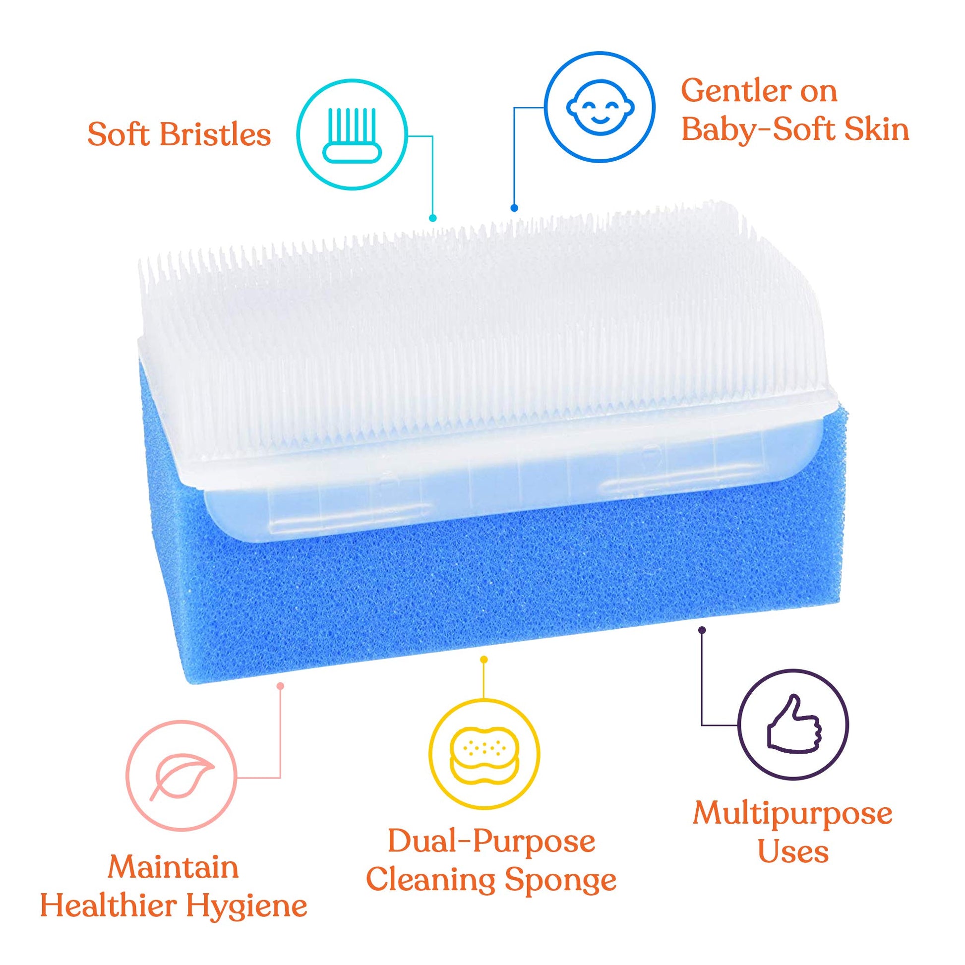 - Dual-Purpose Cleaning Sponge – This baby bath wash sponge features a soft, cushion foam side and a long, gentle bristle side to help clean from little toes to cute faces.