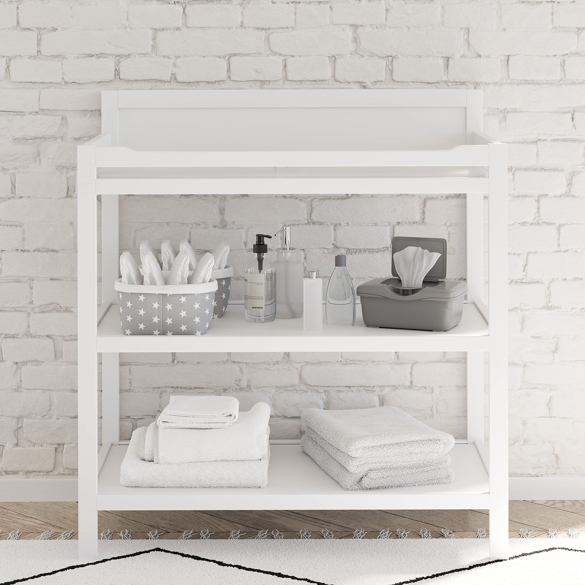 The Storkcraft Alpine Changing Table combines clean lines, modern style, and a universal design that will match perfectly with your baby's nursery. The Alpine includes a water-resistant vinyl changing pad with safety strap, and 2 open shelves to keep your most important nursery essentials nearby. JPMA certified and tested to meet or exceed all applicable ASTM International and CPSC safety standards, the Alpine is backed by Storkcraft's 1-year limited warranty and supportive customer care. Complete the Storkcraft Alpine Collection with the matching Alpine 4-Drawer Chest, Alpine 6-Drawer Double Dresser, and Alpine 4-in-1 Convertible Crib. Exclusively from Storkcraft, proud recipient of the 2020 Women's Choice Award for 9 out of 10 Customer Recommended Baby & kids furniture.
