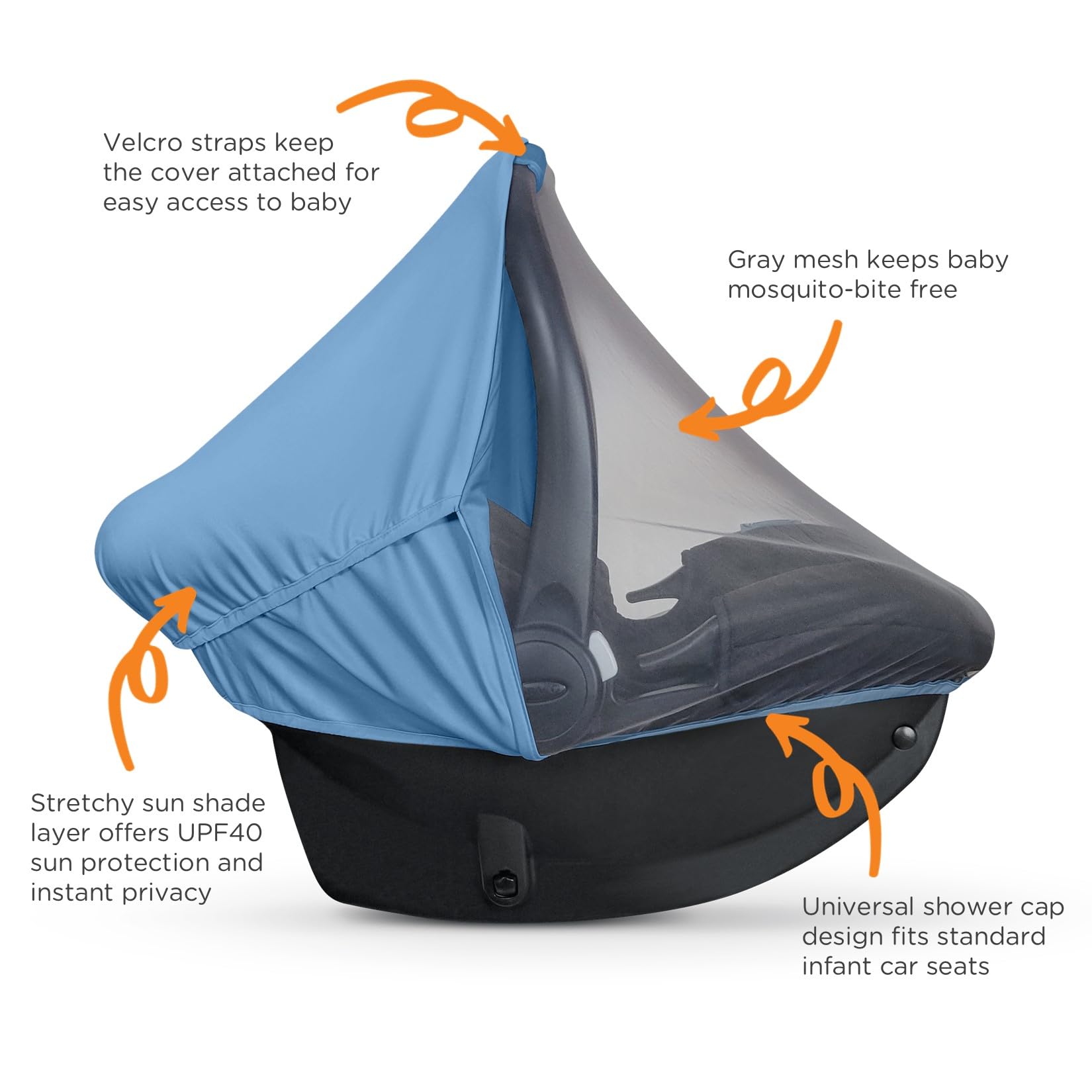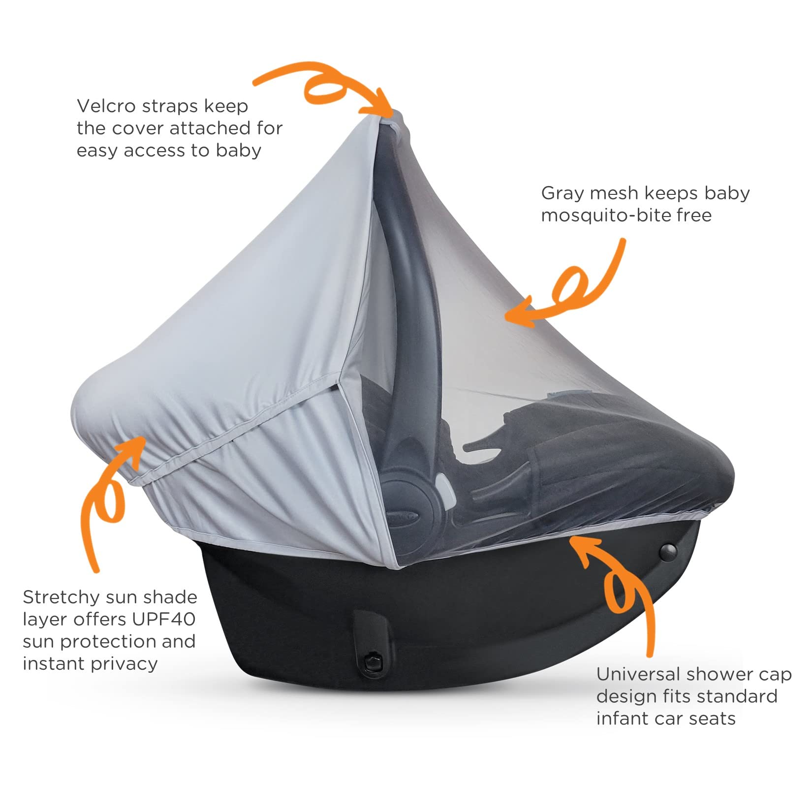 - 【 SUN & BUG PROTECTION 】Keep your baby safe and comfortable from outdoor elements with two layers of protection. The fine, gray mesh keeps baby mosquito-bite free during walks, picnics, and other outings, while the stretchy sun shade layer offers instant privacy and sun protection blocking 97.5% of UV (UPF40). liuliuby’s universal 2-in-1 car seat cover comes with elastic edges to ensure a snug fit on standard infant carriers.
