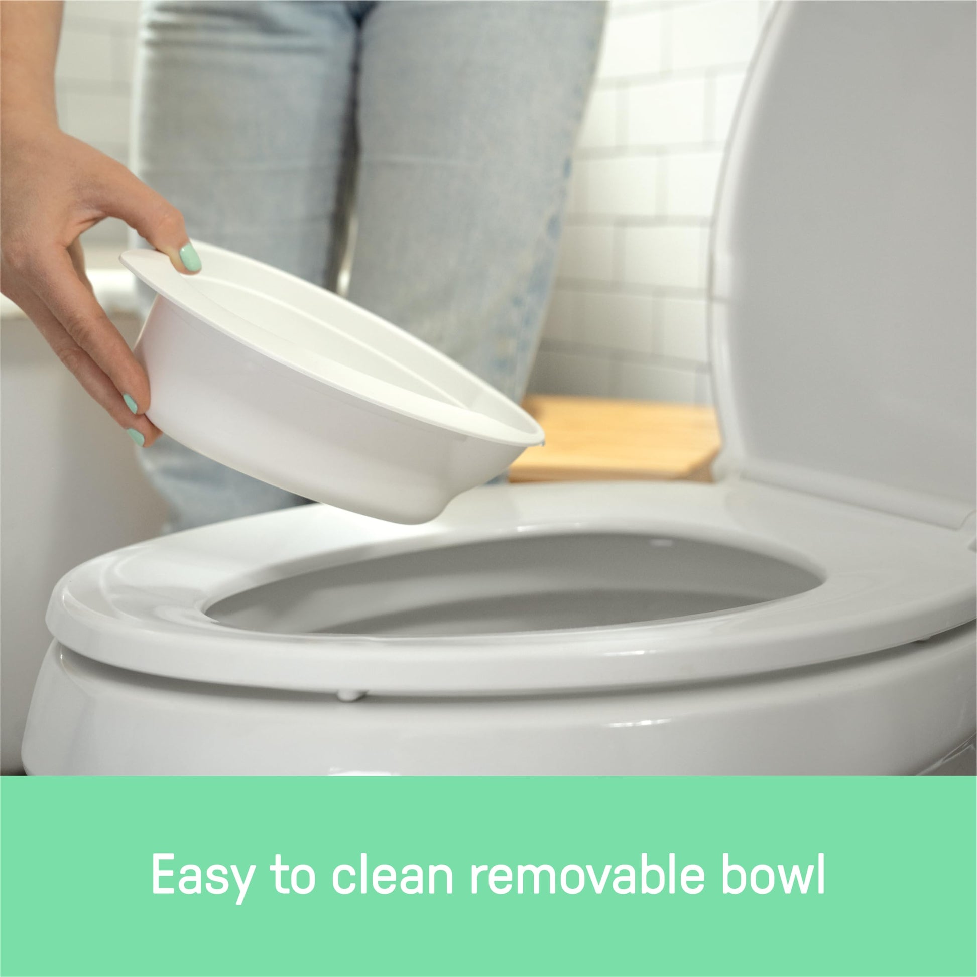 - Detachable potty ring fits on a full-size toilet to help child transition to adult toilet; The removable bowl is easy to clean and features a built-in splash guard to keep messy moments contained