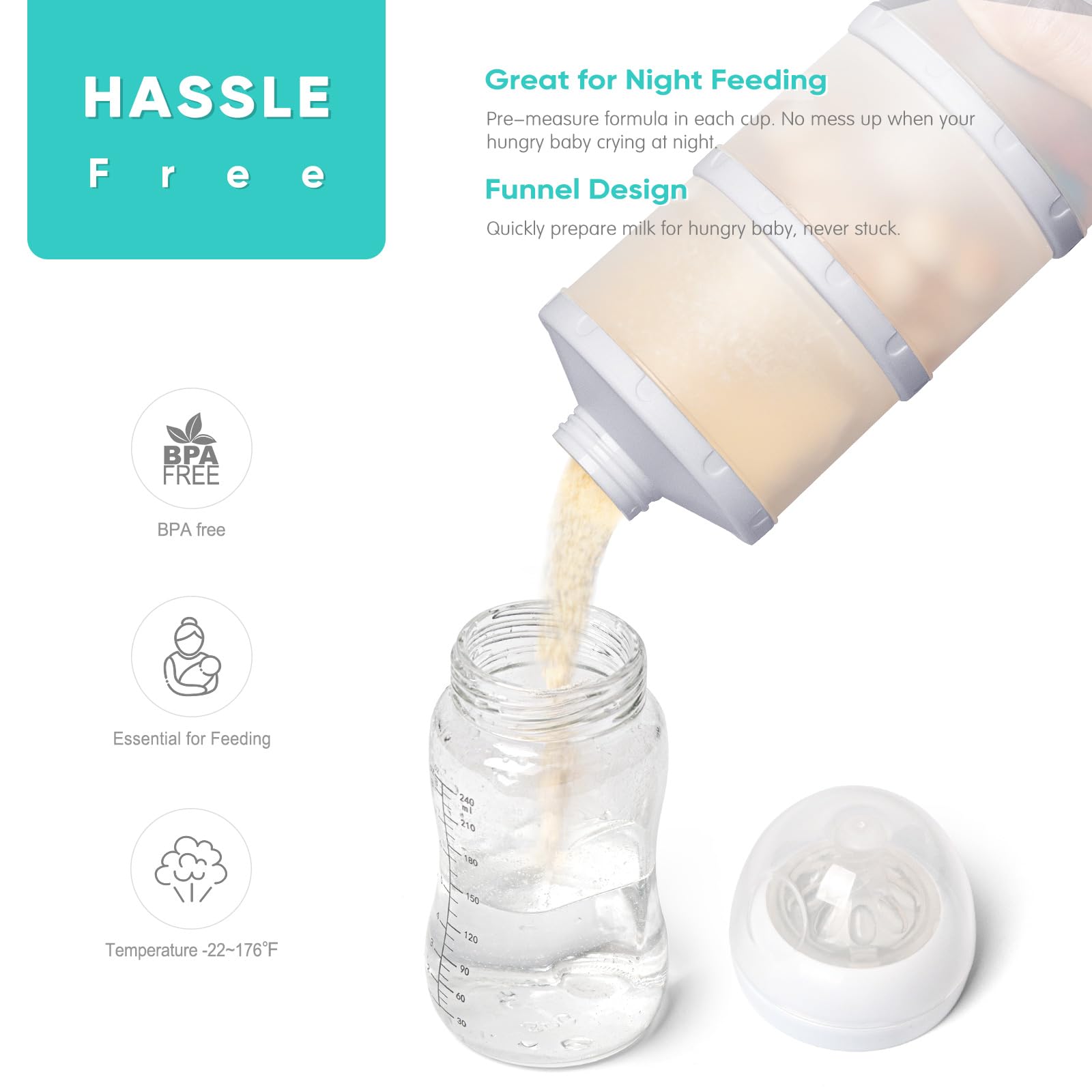 - Convenient for on the Go: The formula dispenser can be easily stored in a diaper bag. Formula can be quickly poured into bottle through the funnel without spilling out, even in a moving car. Perfect pack & go companion.