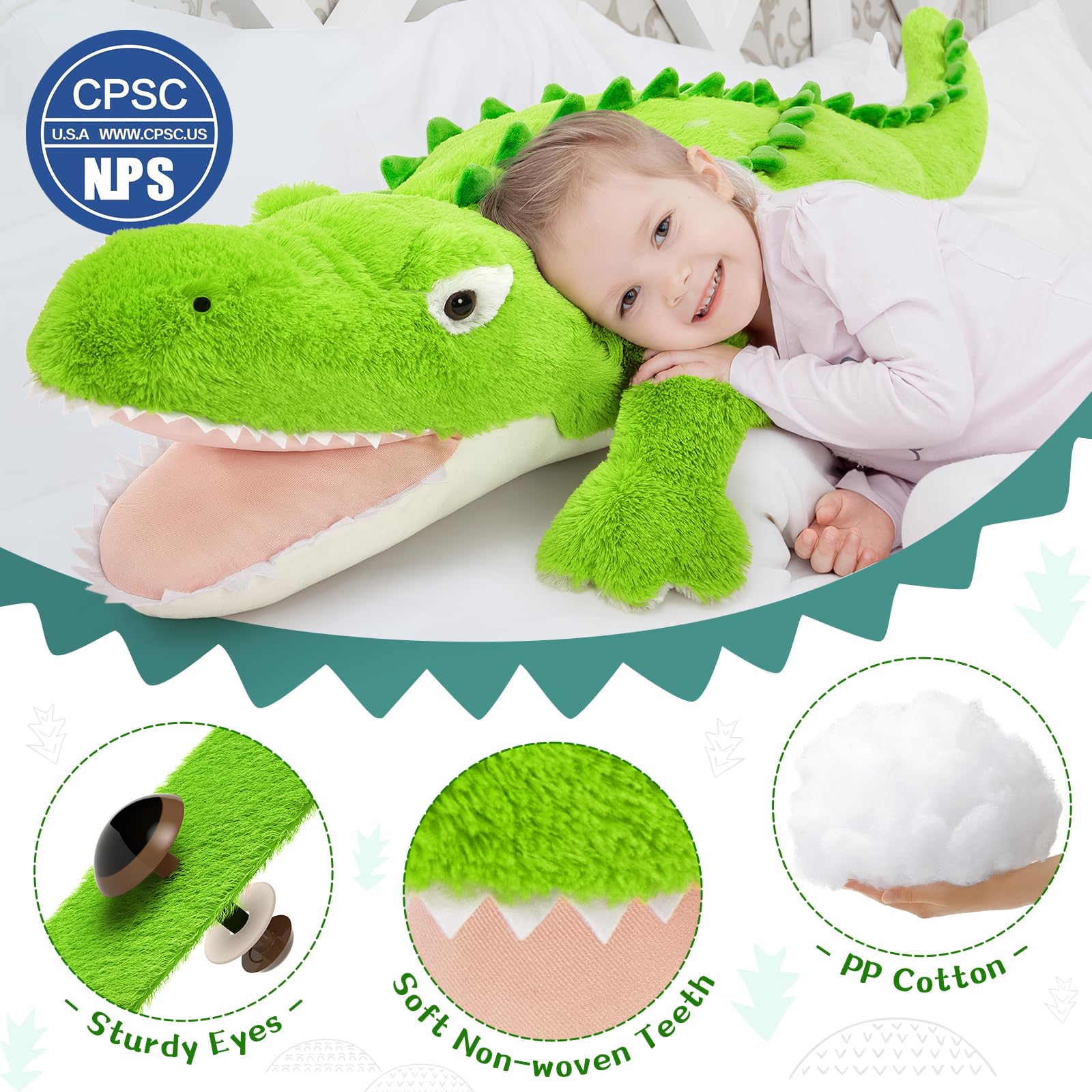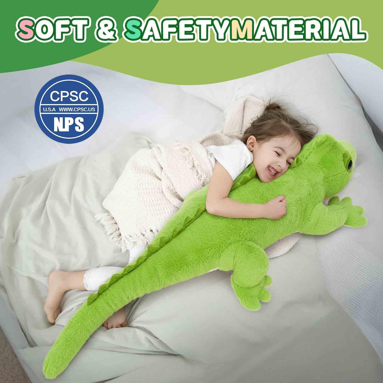- Safety for Children: Our realistic giant plush crocodile toy has no detachable small parts, making it safe and comfortable. The eyes of the crocodile pillow are secured by a facet from the inside, so the eyes are not easily bitten off or removed by young children, which also ensures their safety. Stuffed crocodile has passed CPC/CE, safe for all ages.