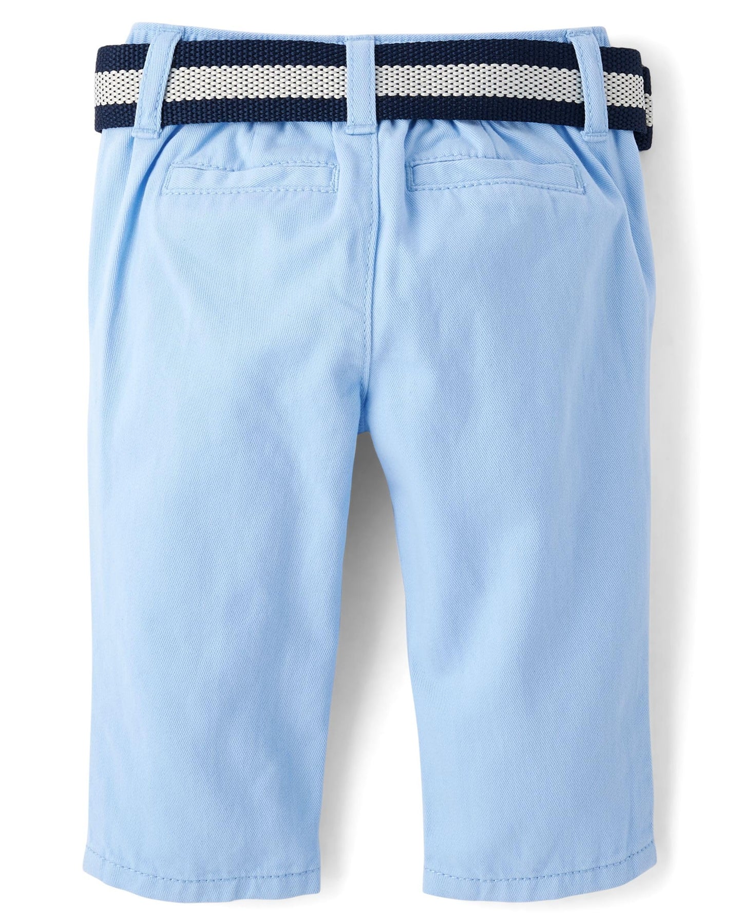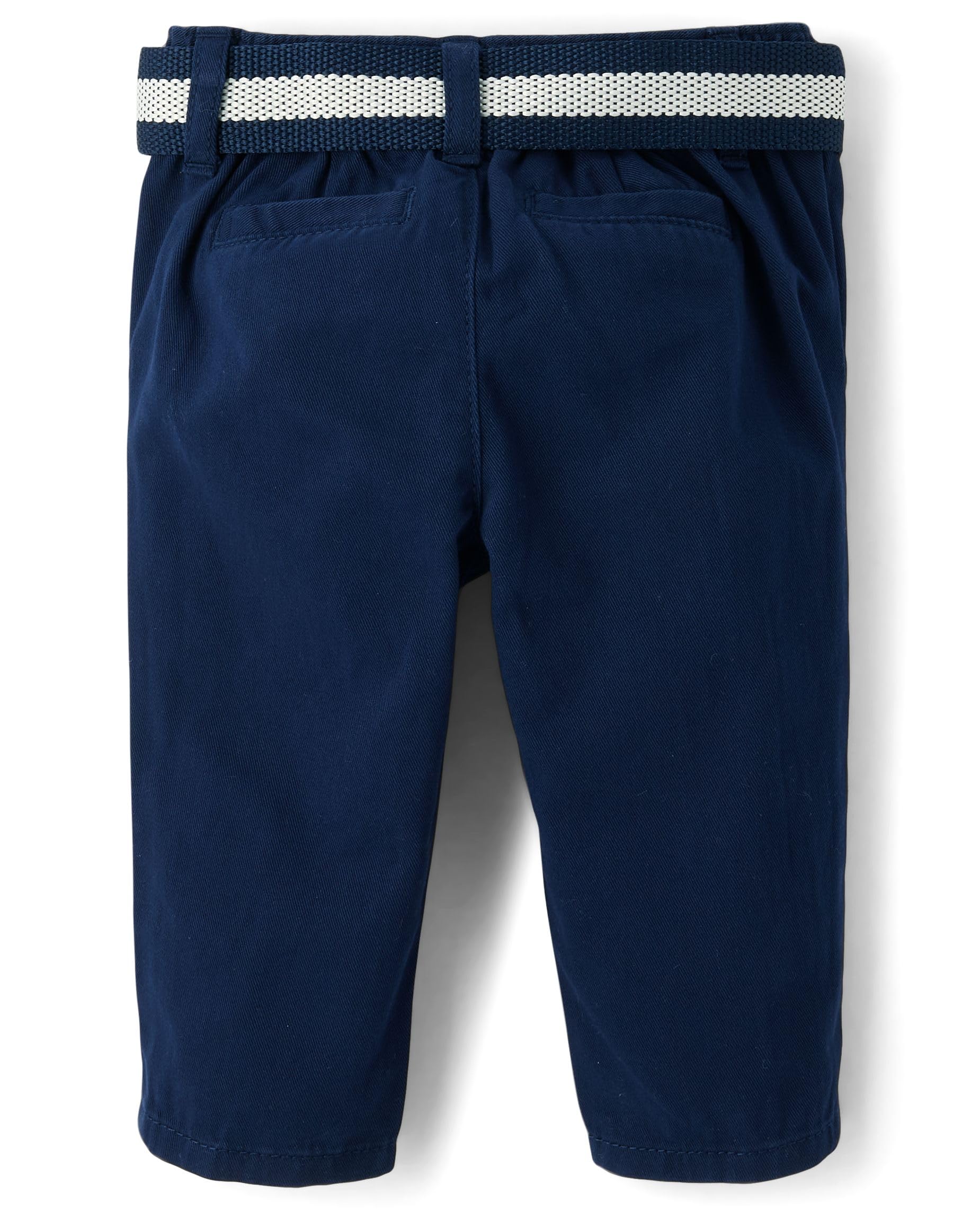 - CHINO PANTS: Functional button & no-zip fly, elasticized back waist, belt loops, removable striped belt, non-functional front & back pockets