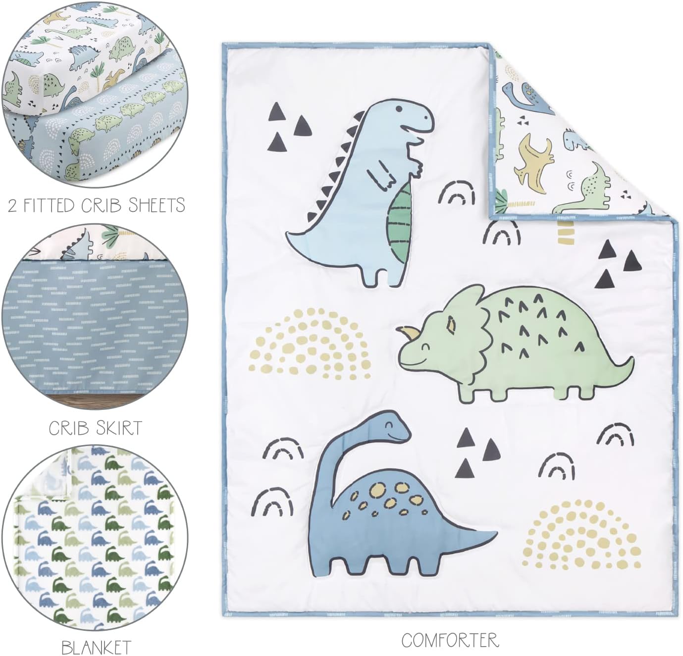 The Peanutshell 5 Piece Baby Crib Bedding Set for Boys - Newborn, Infant & Toddler Nursery Bed Set Decor with Fitted Crib Sheets, Blanket, Dust Ruffle Comforter - Blue Dino