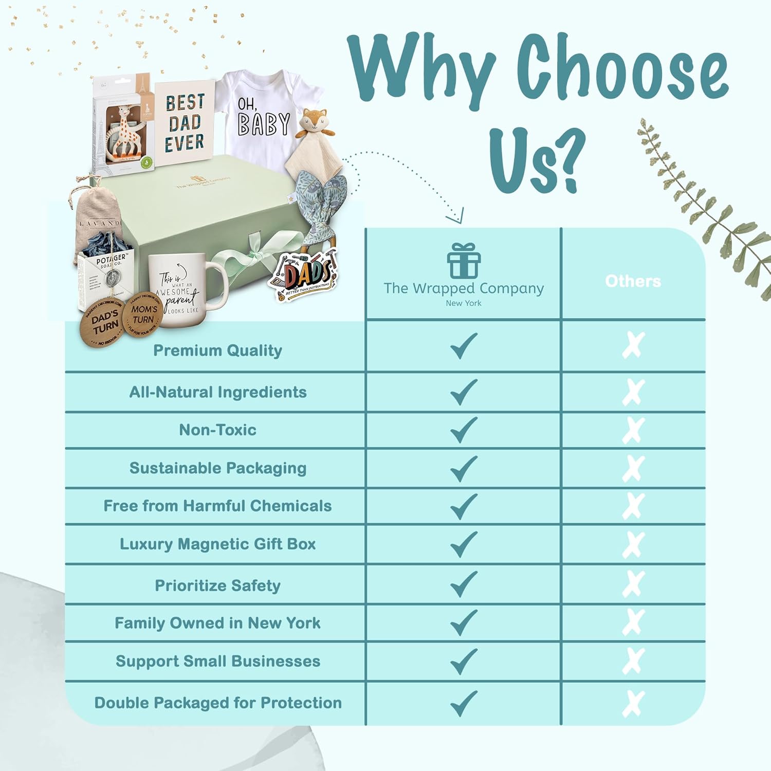 - BOX INCLUDES 10 PREMIUM GIFTS - Oh Baby Cotton Onesie (0-3 Months), Best Dad Ever Greeting Card, Fresh Lavender Sachet, Organic Lavender Charcoal Soap, Awesome Parent Mug, Parent Decision Wooden Flip Coin, Dads Better Than Instructions Sticker, Organic Cotton Fox Snuggle Blanket, Bunny Ear Natural Wood Teether, Sophie Giraffe Teether Ring