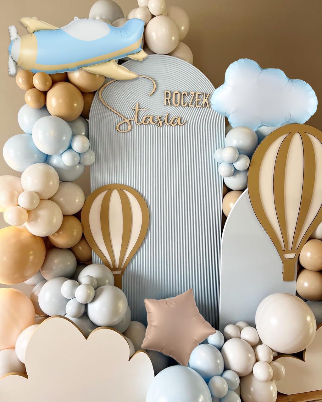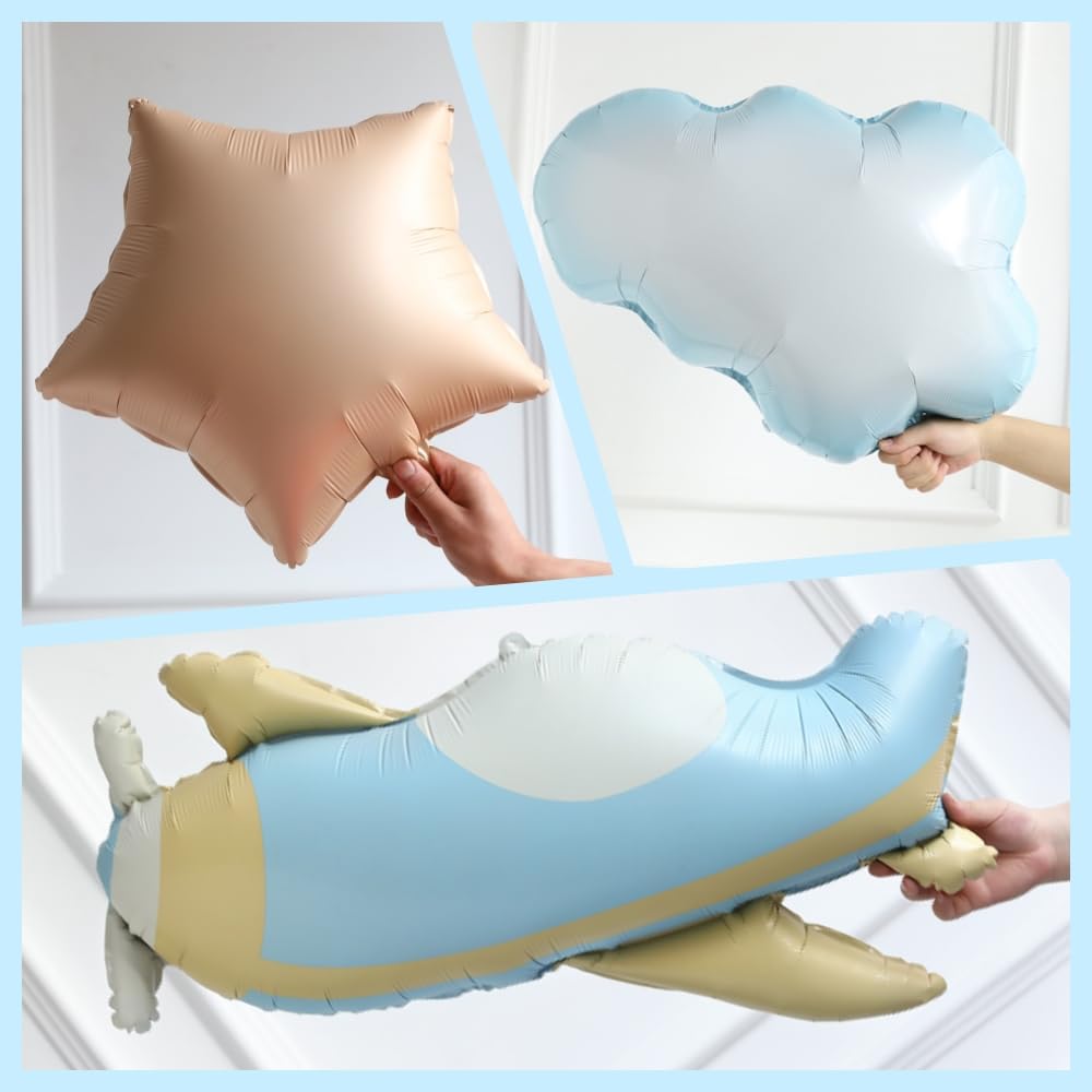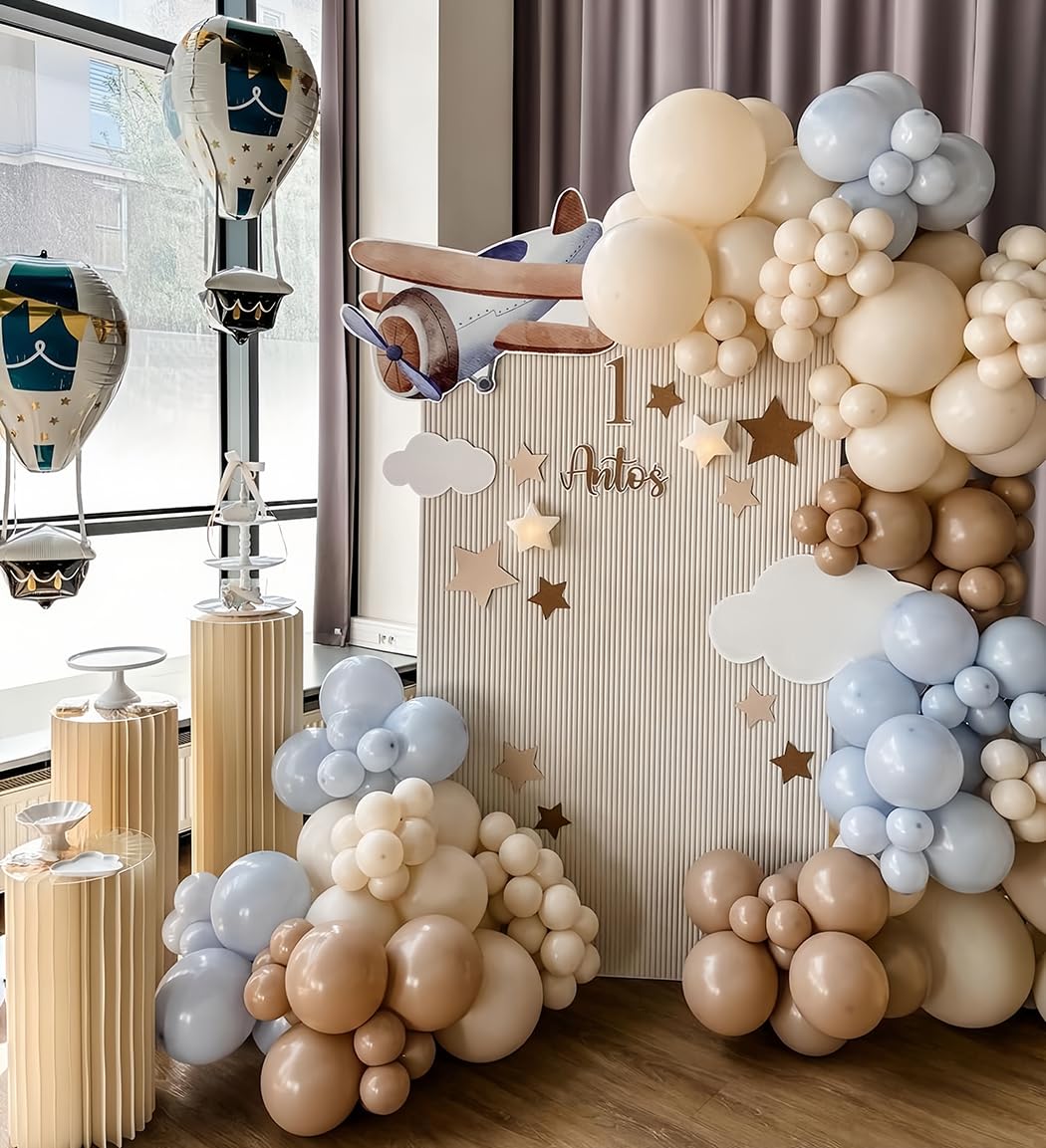 - All-in-one Package: Oh baby, how time flies! Here comes the Enanal 155pcs Brown Blue Time Flies Airplane Themed Balloon Garland Arch Kit! The kit contains 150pcs latex balloons (including 15pcs chrome gold balloons), 1pc airplane foil balloons, 1pc cloud foil balloons, 1pc star foil balloon, and 2pcs balloon arch accessories. These boho color balloons will bring you a memorable birthday party scene.