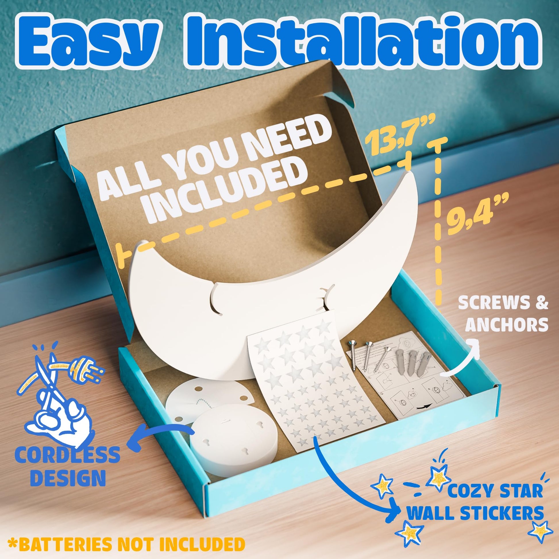 - Battery-operated and easy to install: This Cordless Baby nightlight is powered by batteries, making it a hassle-free option for parents who want to avoid cords and wires in their child's room. It's also easy to install by screwing a screw into the wall and then hanging the lamp on the screws