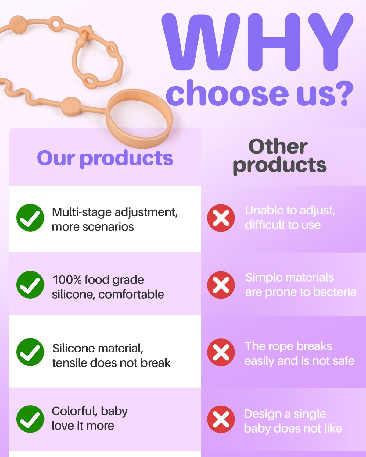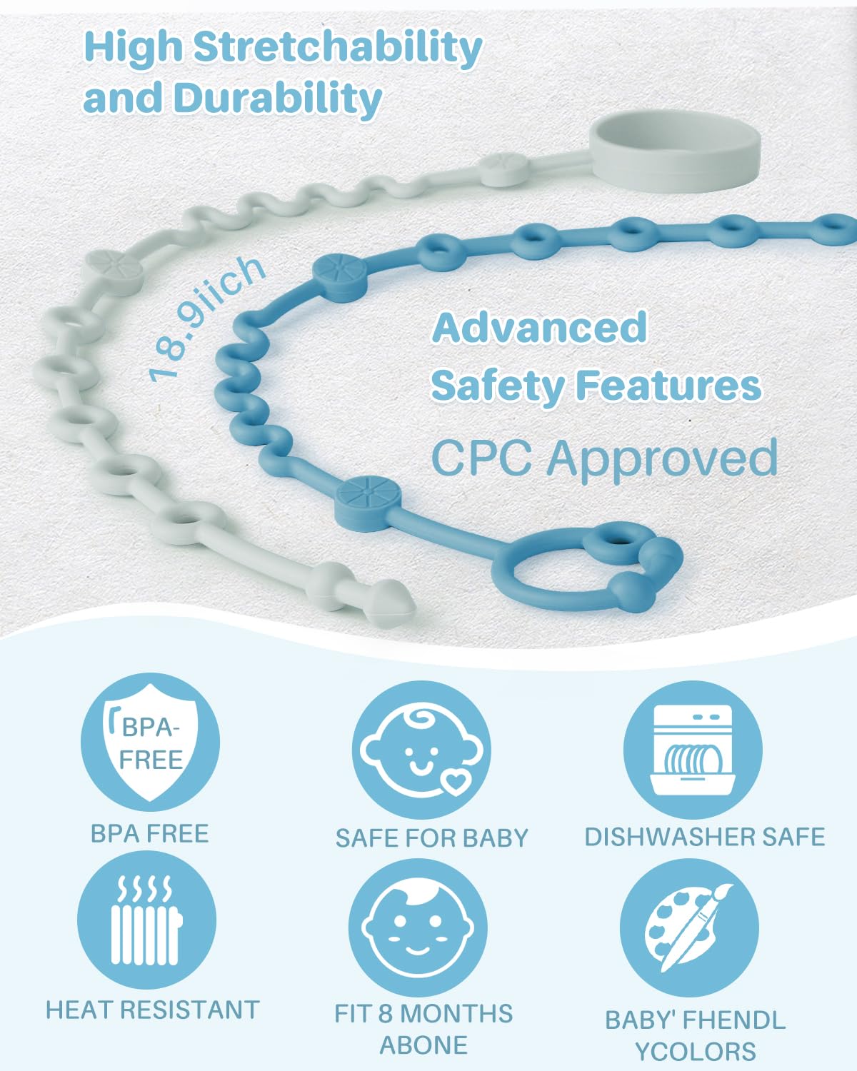 - The baby toy strap is indeed crafted from food-grade, heat-resistant silicone, which allows it to be easily cleaned and sanitized.
