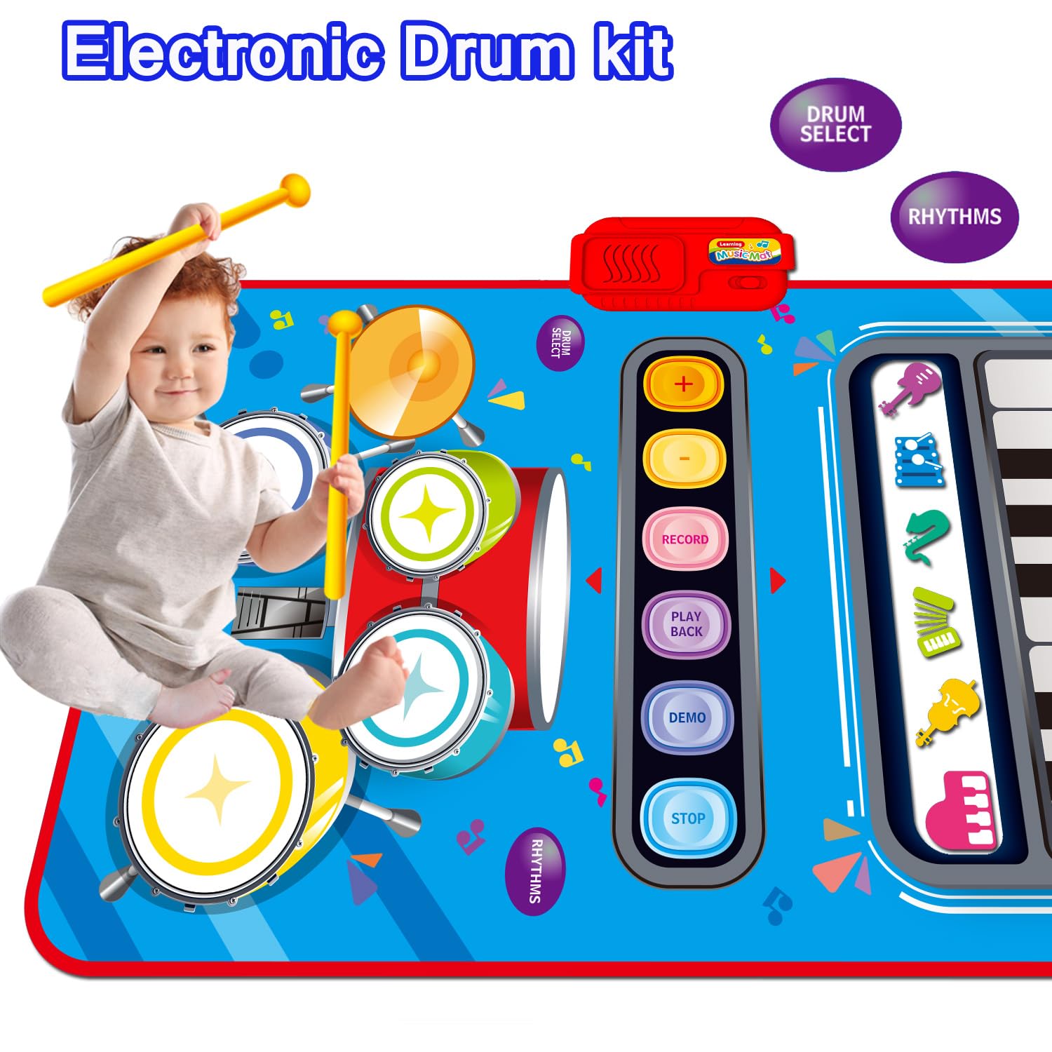 - 【Baby Educational & Learning Toys】Music learning toys for 1-2 year old are perfect for developing your baby musical interest. As they listen to music, they'll be inspired to sing and dance, improving their language skills and hand-foot coordination. Fostering creativity, and promoting exercise at an early age. Drum side improves hand-eye coordination and finger flexibility while striking. Piano Play Mat is designed to nurture your child's musical talent and develop basic musical skills.
