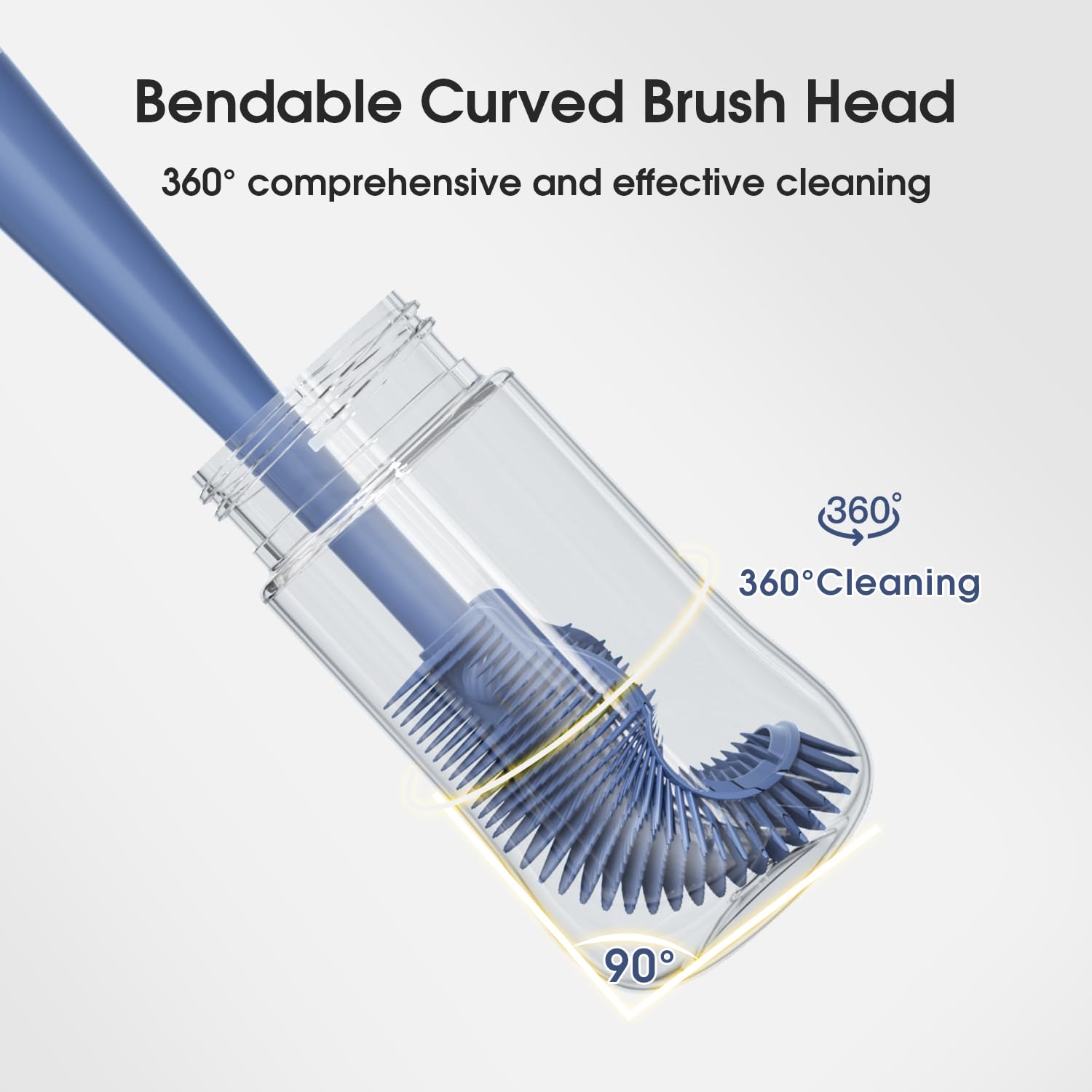 - Curved Bendable Brush Head - Our curved bendable bottle brush can be bent 90° to thoroughly clean the corners and crevices of the bottle. The curved design of the bristles conforms to the push-pull cleaning habit, which is easier and more efficient.