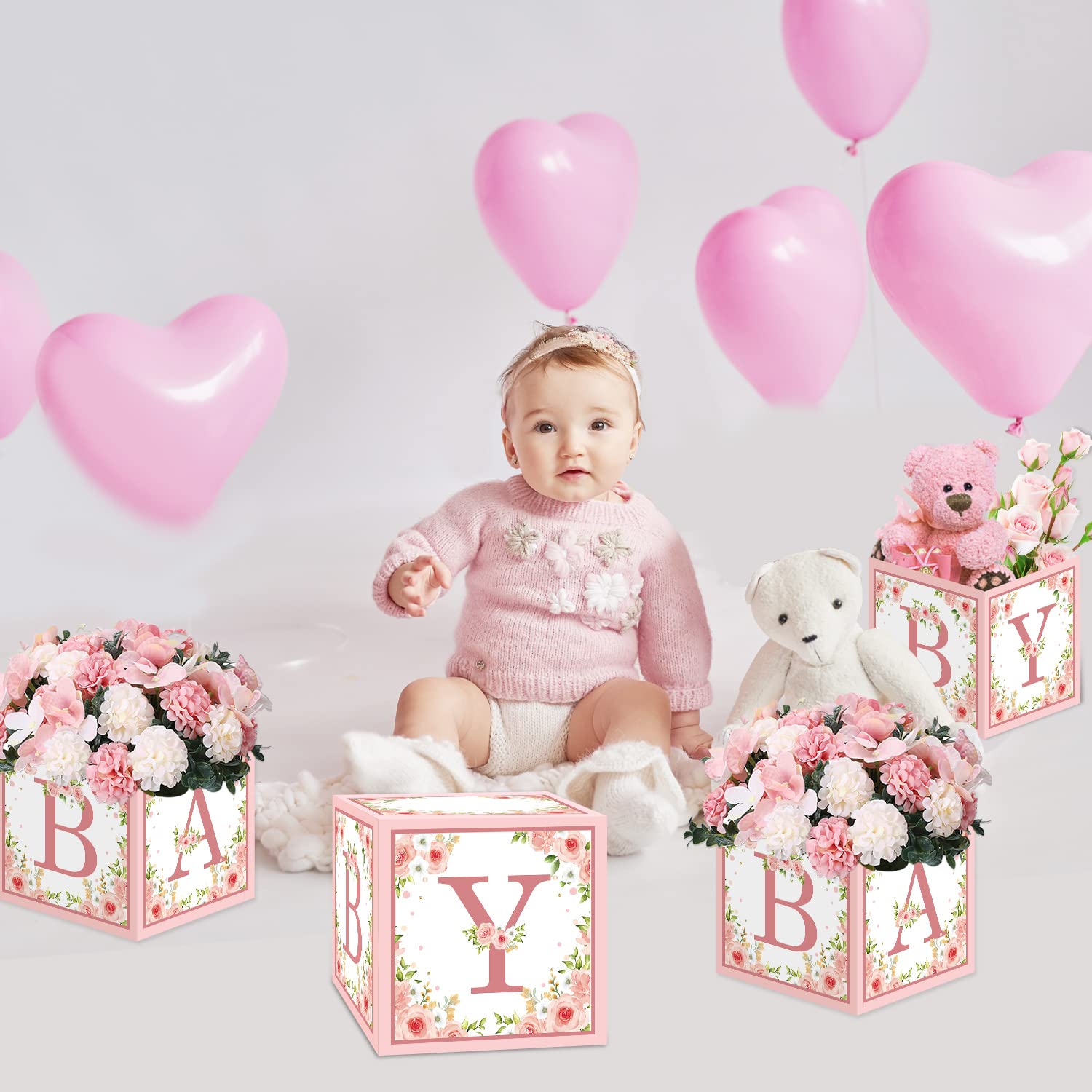 TSVATE Pink Baby Shower Boxes Decorations - 4 Baby Shower Centerpiece Boxes Gender Reveal First Birthday Centerpiece Decors (Without Flowers)