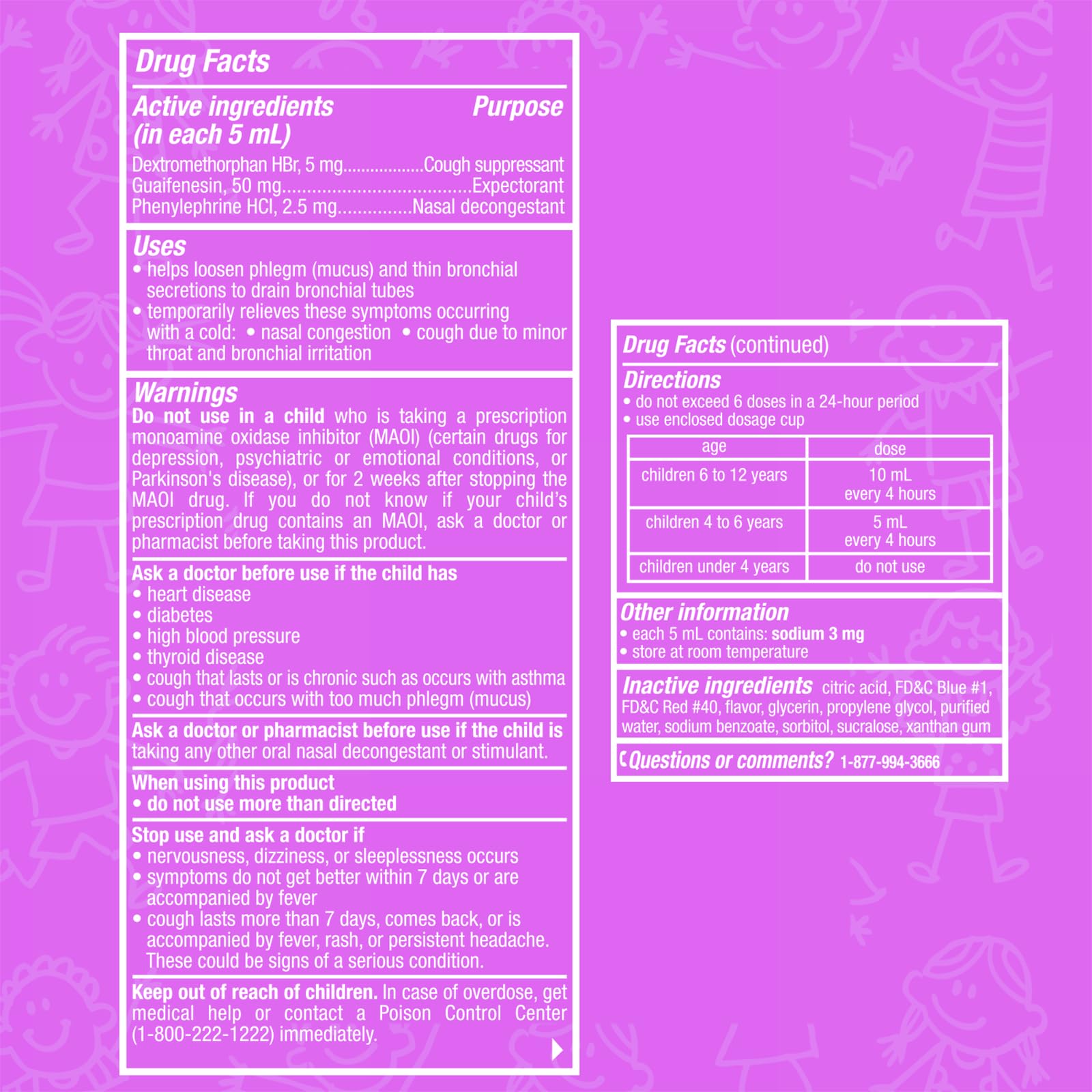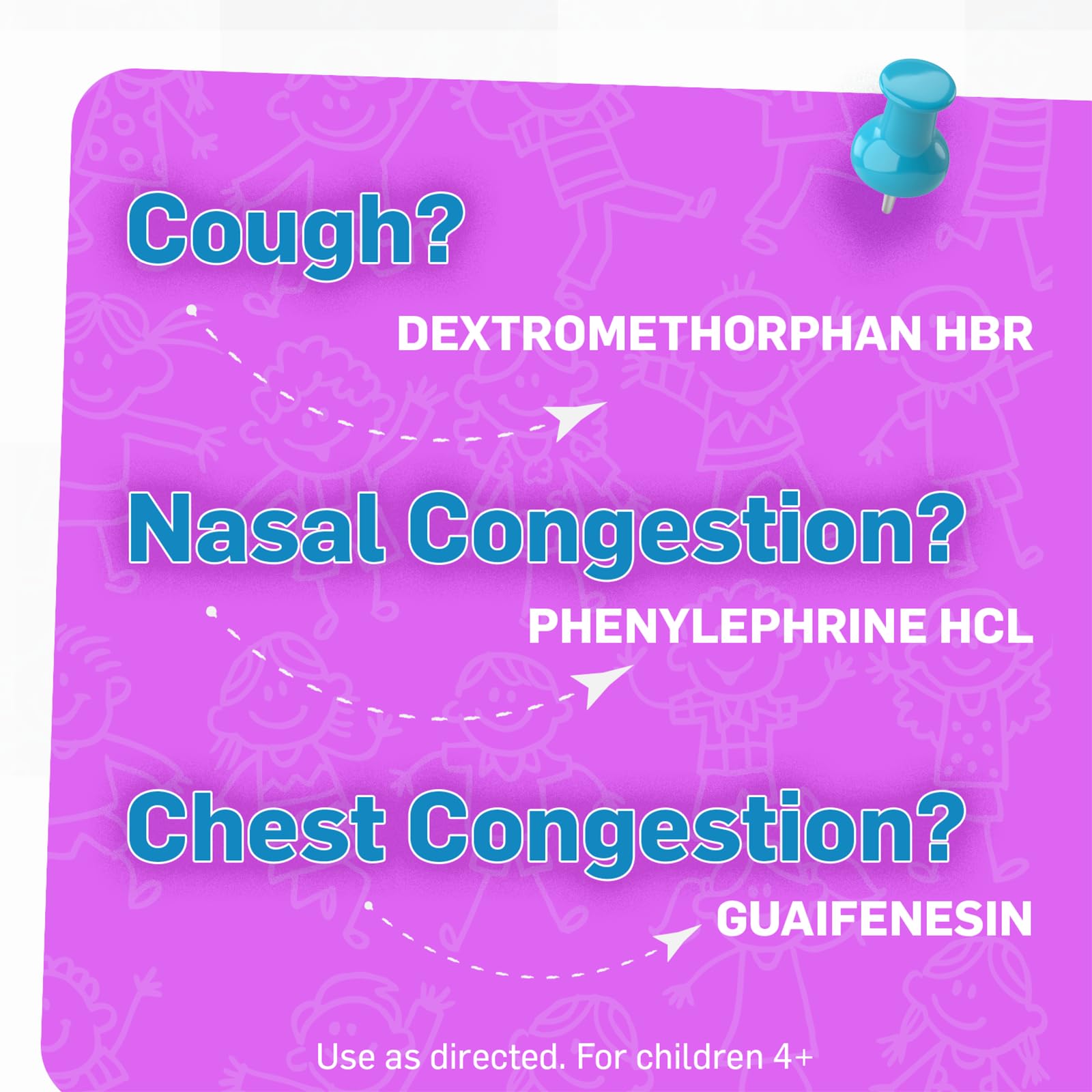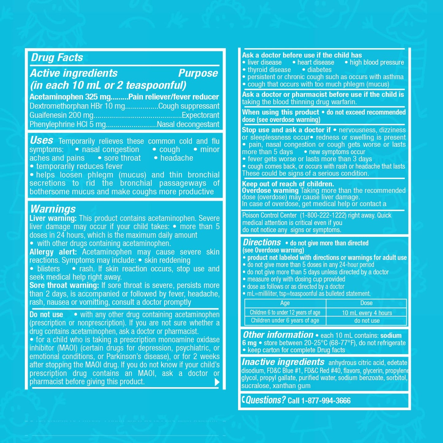 - [ POWERFUL ACTIVE INGREDIENTS ]: Contains Acetaminophen for pain and fever relief, Dextromethorphan as a cough suppressant, and Guaifenesin to loosen mucus, providing comprehensive cold & flu relief for kids.