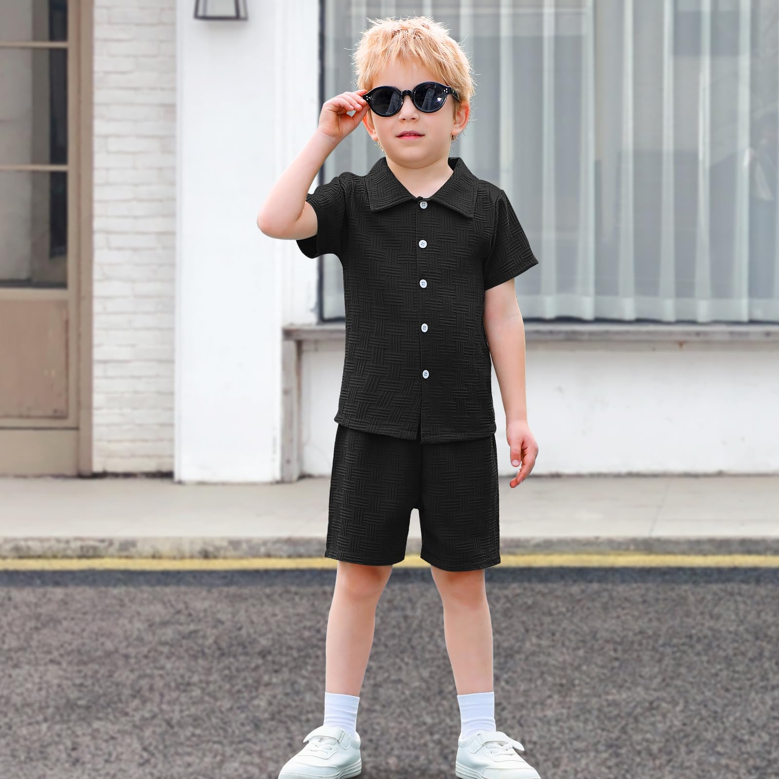 - Comfortable Fabric: U·nikaka baby boys short sets is made of 100% polyester, which is lightweight, breathable, soft and skin-friendly. The surface of the boy's shorts set has a three-dimensional geometric texture design, adding a touch of sophistication