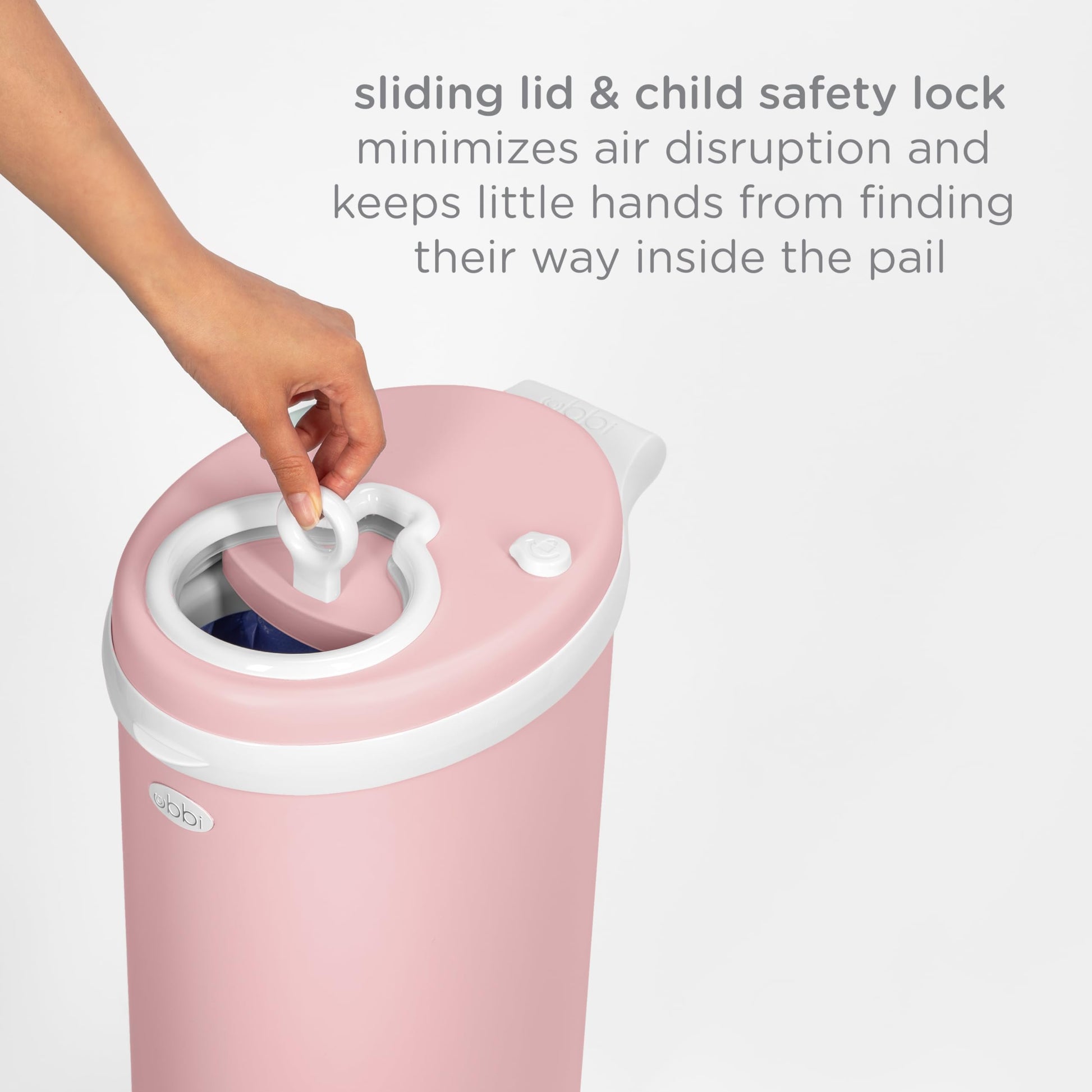 - SLIDING LID WITH CHILDPROOF LOCK: Equipped with a sliding lid, the Ubbi Diaper Pail minimizes air disruption when opened and closed. The pail’s innovative lid design ensures a smooth and airtight closure, trapping in stinky odors. The childproof lock keeps out tiny hands.