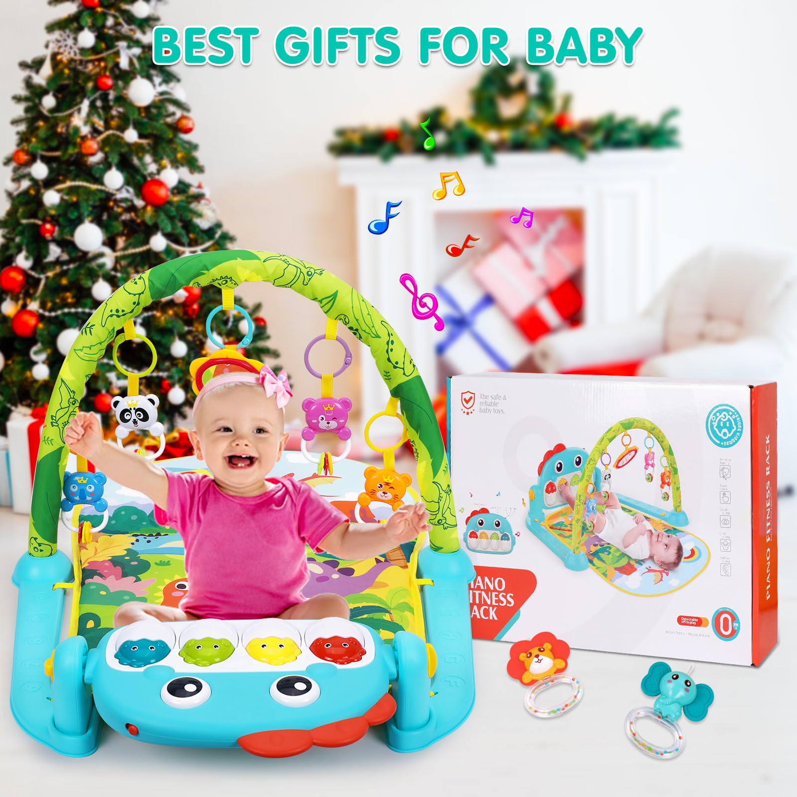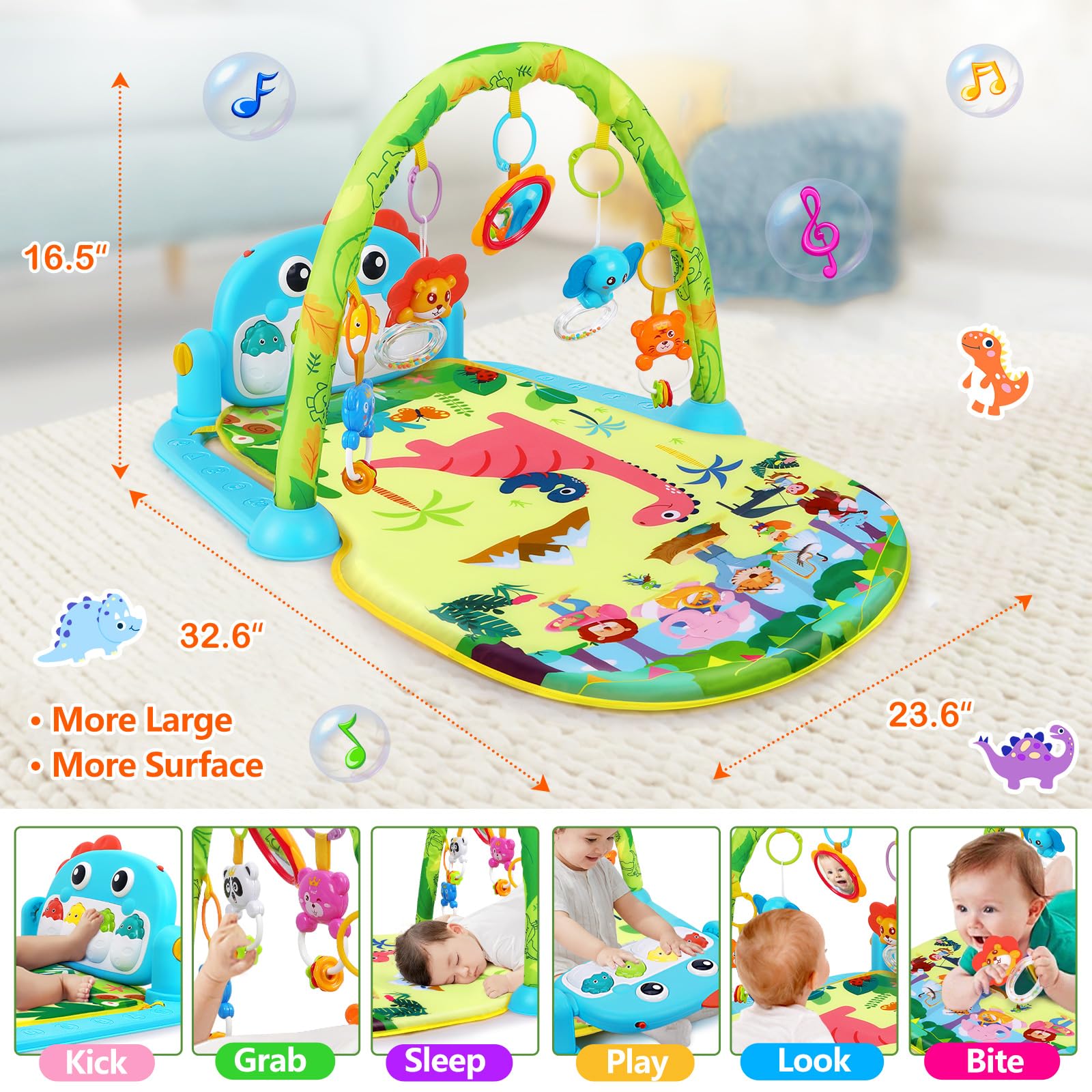 - PERFECT BABY FITNESS: A great dinosaur theme activity center for baby girl newborn essentials with 5 detachable hanging rattle toys, 2 baby teething toys and graceful piano music, bright musical toys catch kid‘s attention. Baby play gym mat made by soft material, washable and comfortable. Baby can lie on or play on gym mat even when he is naked. The best baby boy girl toys ever